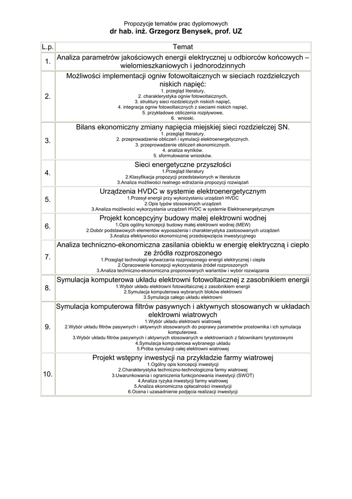 Propozycje tematów prac dyplomowych dr hab. inż. Grzegorz Benysek, prof. UZ L.p. Temat Analiza parametrów jakościowych energii elektrycznej u odbiorców końcowych – 1. wielomieszkaniowych i jednorodzinnych Możliwości implementacji ogniw fotowoltaicznych w sieciach rozdzielczych niskich napięć: 2. 1. przegląd literatury, 2. charakterystyka ogniw fotowoltaicznych, 3. struktury sieci rozdzielczych niskich napięć, 4. integracja ogniw fotowoltaicznych z sieciami niskich napięć, 5. przykładowe obliczenia rozpływowe, 6. wnioski. Bilans ekonomiczny zmiany napięcia miejskiej sieci rozdzielczej SN. 3. 1. przegląd literatury. 2. przeprowadzenie obliczeń i symulacji elektroenergetycznych. 3. przeprowadzenie obliczeń ekonomicznych. 4. analiza wyników. 5. sformułowanie wniosków. Sieci energetyczne przyszłości 4. 1.Przegląd literatury 2.Klasyfikacja propozycji przedstawionych w literaturze 3.Analiza możliwości realnego wdrażania propozycji rozwiązań Urządzenia HVDC w systemie elektroenergetycznym 5. 1.Przesył energii przy wykorzystaniu urządzeń HVDC 2.Opis typów stosowanych urządzeń 3.Analiza możliwości wykorzystania urządzeń HVDC w systemie Elektroenergetycznym Projekt koncepcyjny budowy małej elektrowni wodnej 6. 7. 1.Opis ogólny koncepcji budowy małej elektrowni wodnej (MEW) 2.Dobór podstawowych elementów wyposażenia i charakterystyka zastosowanych urządzeń 3.Analiza efektywności ekonomicznej przedsięwzięcia inwestycyjnego Analiza techniczno-ekonomiczna zasilania obiektu w energię elektryczną i ciepło ze źródła rozproszonego 1.Przegląd technologii wytwarzania rozproszonego energii elektrycznej i ciepła 2.Opracowanie koncepcji wykorzystania źródeł rozproszonych 3.Analiza techniczno-ekonomiczna proponowanych wariantów i wybór rozwiązania Symulacja komputerowa układu elektrowni fotowoltaicznej z zasobnikiem energii 8. 1.Wybór układu elektrowni fotowoltaicznej z zasobnikiem energii 2.Symulacja komputerowa wybranych bloków elektrowni 3.Symulacja całego układu elektrowni Symulacja komputerowa filtrów pasywnych i aktywnych stosowanych w układach elektrowni wiatrowych 9. 1.Wybór układu elektrowni wiatrowej 2.Wybór układu filtrów pasywnych i aktywnych stosowanych do poprawy parametrów prostownika i ich symulacja komputerowa. 3.Wybór układu filtrów pasywnych i aktywnych stosowanych w elektrowniach z falownikami tyrystorowymi 4.Symulacja komputerowa wybranego układu 5.Próba symulacji całej elektrowni wiatrowej Projekt wstępny inwestycji na przykładzie farmy wiatrowej 10. 1.Ogólny opis koncepcji inwestycji 2.Charakterystyka techniczno-technologiczna farmy wiatrowej 3.Uwarunkowania i ograniczenia funkcjonowania inwestycji (SWOT) 4.Analiza ryzyka inwestycji farmy wiatrowej 5.Analiza ekonomiczna opłacalności inwestycji 6.Ocena i uzasadnienie podjęcia realizacji inwestycji Projekt wstępny elektrociepłowni z wysokotemperaturowym ogniwem paliwowym 11. 1.Ogólny opis koncepcji inwestycji 2.Charakterystyka techniczno-technologiczna elektrociepłowni z ogniwem paliwowym 3.Uwarunkowania i ograniczenia funkcjonowania inwestycji (SWOT) 4.Analiza ryzyka inwestycji elektrociepłowni z ogniwem paliwowym 5.Analiza ekonomiczna opłacalności inwestycji 6.Ocena i uzasadnienie podjęcia realizacji inwestycji Wyższe harmoniczne napięć i prądów w układach z kompensacją mocy biernej 12. 1.Przegląd typowych układów z odbiornikami nieliniowymi i kompensacją mocy biernej 2.Wpływ wyższych harmonicznych na kompensację mocy biernej 3.Zasady eksploatacji układów z kompensacją mocy biernej w środowisku wyższych harmonicznych 4.Przykład zastosowania zaleceń do wybranego układu z kompensacją mocy biernej Projekt koncepcyjny budowy elektrowni (farmy) wiatrowej 13. 14. 15. 16. 17. 18. 19. 20. 21. 22. 23. 24. 25 26. 1.Opis ogólny koncepcji budowy elektrowni wiatrowej 2.Dobór podstawowych elementów wyposażenia i charakterystyka zastosowanych urządzeń 3.Analiza efektywności ekonomicznej przedsięwzięcia Inwestycyjnego Analiza techniczno-ekonomiczna zasilania obiektu w energię elektryczną i ciepło z ogniwa paliwowego 1.Przegląd technologii wytwarzania energii elektrycznej i ciepła w ogniwach paliwowych 2.Opracowanie koncepcji wykorzystania ogniw paliwowych w założonych warunkach 3.Analiza techniczno-ekonomiczna proponowanych wariantów i wybór rozwiązania Stanowisko laboratoryjne do badania ogniw paliwowych Stanowisko laboratoryjne do badania ogniw Peltiera Technologie i zastosowania nadprzewodnikowych kabli energetycznych Badania wpływu pojazdów elektrycznych na parametry jakościowe energii elektrycznej Analiza wykorzystania infrastruktury energetyki zawodowej, do zasilania pojazdów elektrycznych Analiza właściwości, budowa i badania układu do produkcji energii elektrycznej na bazie silnika Stirlinga (źródło ciepła o niskich parametrach) Projekt, budowa i badania systemu bezprzewodowej komunikacji układów FACTS Analiza technologiczna i ekonomiczna wykorzystania układów magazynowania energii elektrycznej w systemie elektroenergetycznym Analiza możliwość wykorzystania AMI w programach zarządzania popytem Potencjał regulacyjny gospodarstw domowych w aspekcie uczestnictwa w programach zarządzania popytem Badania właściwości układu napędowego autobusu elektrycznego Propozycje własne studentów Propozycje tematów prac dyplomowych Dr hab. inż. Adam Kempski, prof. UZ L.p. 1. 2. 3. 4. 5. 6. 7. 8. 9. 10. 11. 12. 13. 14. 15. Temat Kompensacja sprzężeń pasożytniczych w filtrach zaburzeń przewodzonych Aplikacja umożliwiająca badanie przebiegu fal przepięciowych w układach wielowęzłowych Sztuczna sieć stabilizująca impedancję typu delta Odporność systemów transmisji danych na zaburzenia przewodzone Integralność sygnałowa w warunkach zaburzeń przewodzonych Polowe metody badania zaburzeń elektromagnetycznych w paśmie zaburzeń przewodzonych Rozpływ zaburzeń przewodzonych w s