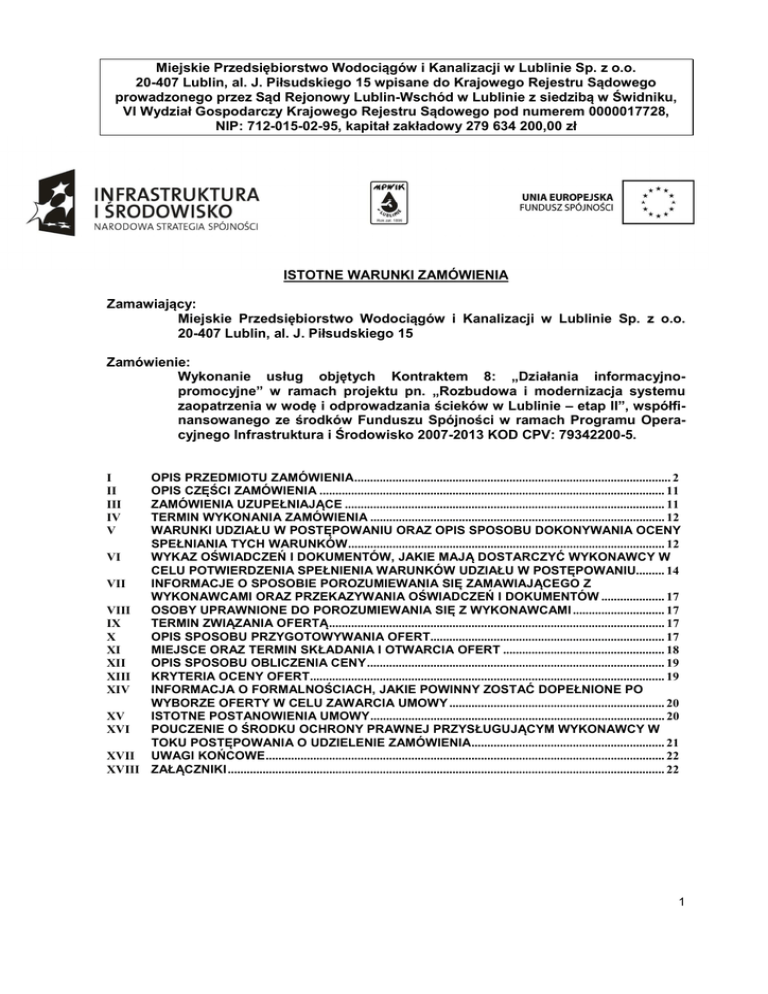 Miejskie Przedsiębiorstwo Wodociągów i Kanalizacji w Lublinie Sp. z o.o. 20-407 Lublin, al. J. Piłsudskiego 15 wpisane do Krajowego Rejestru Sądowego prowadzonego przez Sąd Rejonowy Lublin-Wschód w Lublinie z siedzibą w Świdniku, VI Wydział Gospodarczy Krajowego Rejestru Sądowego pod numerem 0000017728, NIP: 712-015-02-95, kapitał zakładowy 279 634 200,00 zł ISTOTNE WARUNKI ZAMÓWIENIA Zamawiający: Miejskie Przedsiębiorstwo Wodociągów i Kanalizacji w Lublinie Sp. z o.o. 20-407 Lublin, al. J. Piłsudskiego 15 Zamówienie: Wykonanie usług objętych Kontraktem 8: „Działania informacyjnopromocyjne” w ramach projektu pn. „Rozbudowa i modernizacja systemu zaopatrzenia w wodę i odprowadzania ścieków w Lublinie – etap II”, współfinansowanego ze środków Funduszu Spójności w ramach Programu Operacyjnego Infrastruktura i Środowisko 2007-2013 KOD CPV: 79342200-5. OPIS PRZEDMIOTU ZAMÓWIENIA .................................................................................................... 2 OPIS CZĘŚCI ZAMÓWIENIA ............................................................................................................. 11 ZAMÓWIENIA UZUPEŁNIAJĄCE ..................................................................................................... 11 TERMIN WYKONANIA ZAMÓWIENIA ............................................................................................. 12 WARUNKI UDZIAŁU W POSTĘPOWANIU ORAZ OPIS SPOSOBU DOKONYWANIA OCENY SPEŁNIANIA TYCH WARUNKÓW .................................................................................................... 12 VI WYKAZ OŚWIADCZEŃ I DOKUMENTÓW, JAKIE MAJĄ DOSTARCZYĆ WYKONAWCY W CELU POTWIERDZENIA SPEŁNIENIA WARUNKÓW UDZIAŁU W POSTĘPOWANIU......... 14 VII INFORMACJE O SPOSOBIE POROZUMIEWANIA SIĘ ZAMAWIAJĄCEGO Z WYKONAWCAMI ORAZ PRZEKAZYWANIA OŚWIADCZEŃ I DOKUMENTÓW .................... 17 VIII OSOBY UPRAWNIONE DO POROZUMIEWANIA SIĘ Z WYKONAWCAMI ............................. 17 IX TERMIN ZWIĄZANIA OFERTĄ .......................................................................................................... 17 X OPIS SPOSOBU PRZYGOTOWYWANIA OFERT.......................................................................... 17 XI MIEJSCE ORAZ TERMIN SKŁADANIA I OTWARCIA OFERT ................................................... 18 XII OPIS SPOSOBU OBLICZENIA CENY .............................................................................................. 19 XIII KRYTERIA OCENY OFERT ................................................................................................................ 19 XIV INFORMACJA O FORMALNOŚCIACH, JAKIE POWINNY ZOSTAĆ DOPEŁNIONE PO WYBORZE OFERTY W CELU ZAWARCIA UMOWY .................................................................... 20 XV ISTOTNE POSTANOWIENIA UMOWY ............................................................................................. 20 XVI POUCZENIE O ŚRODKU OCHRONY PRAWNEJ PRZYSŁUGUJĄCYM WYKONAWCY W TOKU POSTĘPOWANIA O UDZIELENIE ZAMÓWIENIA ............................................................. 21 XVII UWAGI KOŃCOWE .............................................................................................................................. 22 XVIII ZAŁĄCZNIKI .......................................................................................................................................... 22 I II III IV V 1 Miejskie Przedsiębiorstwo Wodociągów i Kanalizacji w Lublinie Sp. z o.o. 20-407 Lublin, al. J. Piłsudskiego 15 wpisane do Krajowego Rejestru Sądowego prowadzonego przez Sąd Rejonowy Lublin-Wschód w Lublinie z siedzibą w Świdniku, VI Wydział Gospodarczy Krajowego Rejestru Sądowego pod numerem 0000017728, NIP: 712-015-02-95, kapitał zakładowy 279 634 200,00 zł Miejskie Przedsiębiorstwo Wodociągów i Kanalizacji w Lublinie Sp. z o.o., 20-407 Lublin, al. J. Piłsudskiego 15, zaprasza do złożenia oferty na: wykonanie usług objętych Kontraktem 8: „Działania informacyjno-promocyjne” w ramach projektu pn. „Rozbudowa i modernizacja systemu zaopatrzenia w wodę i odprowadzania ścieków w Lublinie – etap II”, współfinansowanego ze środków Funduszu Spójności w ramach Programu Operacyjnego Infrastruktura i Środowisko 2007-2013 KOD CPV: 79342200-5. Postępowanie prowadzone jest w trybie procedury otwartej zgodnie z Regulaminem MPWiK Sp. z o.o. z dnia 30.04.2013 r. „Zasady i tryb postępowania w sprawach o udzielenie zamówienia sektorowego na dostawy, usługi i roboty budowlane” z późn. zm. (zwanym dalej Regulaminem). Treść Regulaminu jest dostępna na stronie internetowej Zamawiającego: www.mpwik.lublin.pl. Istotne Warunki Zamówienia (zwane dalej IWZ) ze wszystkimi załącznikami oraz ewentualnymi późniejszymi zmianami stanowią integralną całość. Wykonawca ma obowiązek dokładnego zapoznania się z treścią IWZ. Treść oferty musi odpowiadać treści IWZ. I OPIS PRZEDMIOTU ZAMÓWIENIA Przedmiotem zamówienia są usługi informacyjno-promocyjne dla projektu: „Rozbudowa i modernizacja systemu zaopatrzenia w wodę i odprowadzania ścieków w Lublinie – etap II”, współfinansowanego ze środków Funduszu Spójności w ramach Programu Operacyjnego Infrastruktura i Środowiska 2007 -2013. KOD CPV: 79342200-5 – usługi w zakresie promocji. INFORMACJE OGÓLNE O PROJEKCIE: Zakres rzeczowy projektu obejmuje: budowę 3,8 km kanalizacji sanitarnej, budowę 5,2 km sieci wodociągowej, modernizację oczyszczalni ścieków Hajdów w Lublinie (modernizacja instalacji odwadniania osadu przefermentowanego, przebudowa budynku administracyjnego, instalacja do dawkowania zewnętrznego źródła węgla do reaktorów biologicznych. Cele projektu: Zasadniczym celem planowanej inwestycji jest uporządkowanie gospodarki wodno-ściekowej na terenie aglomeracji Lublin. Realizacja projektu wiązać się będzie z osiągnięciem poniższych celów jakościowych: Po
