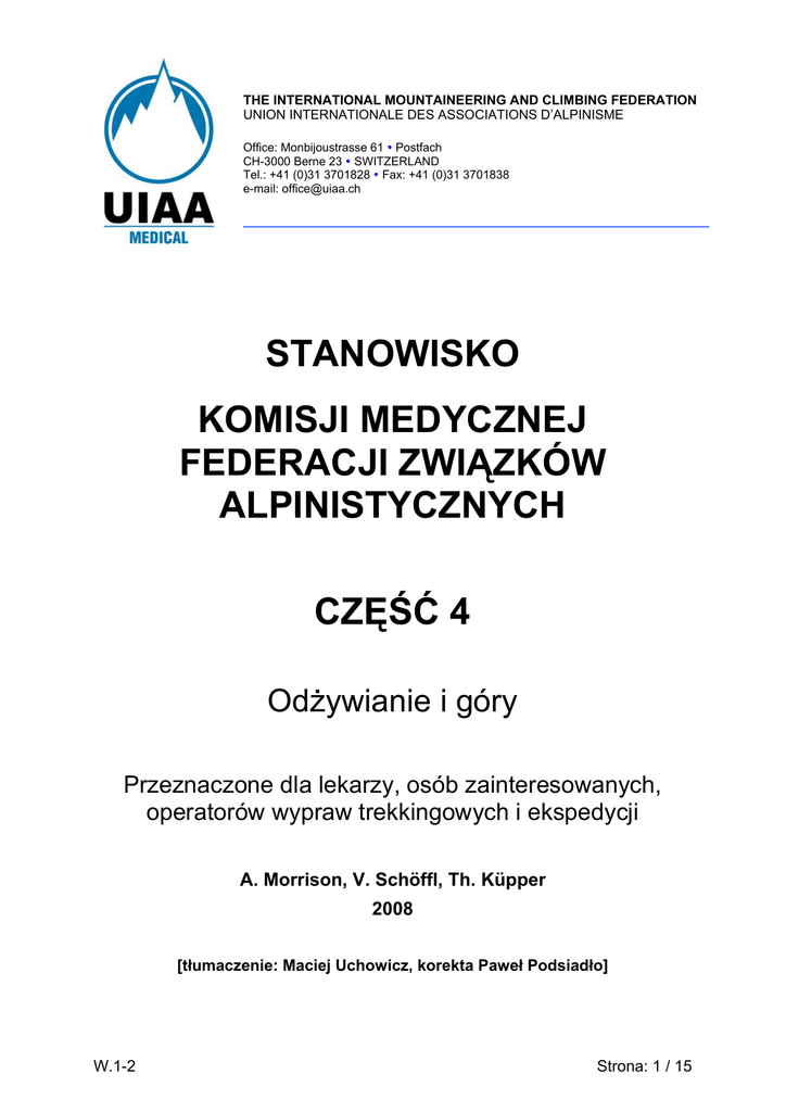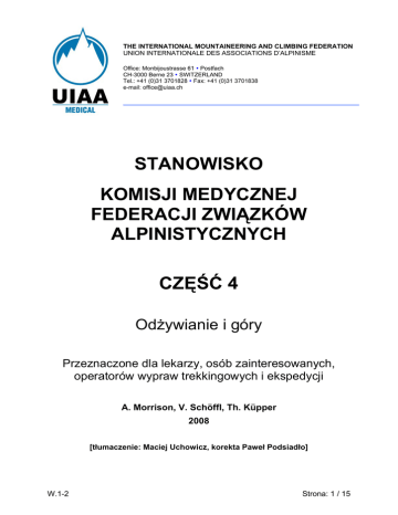 THE INTERNATIONAL MOUNTAINEERING AND CLIMBING FEDERATION UNION INTERNATIONALE DES ASSOCIATIONS D’ALPINISME Office: Monbijoustrasse 61 y Postfach CH-3000 Berne 23 y SWITZERLAND Tel.: +41 (0)31 3701828 y Fax: +41 (0)31 3701838 e-mail: [email protected] STANOWISKO KOMISJI MEDYCZNEJ FEDERACJI ZWIĄZKÓW ALPINISTYCZNYCH CZĘŚĆ 4 Odżywianie i góry Przeznaczone dla lekarzy, osób zainteresowanych, operatorów wypraw trekkingowych i ekspedycji A. Morrison, V. Schöffl, Th. Küpper 2008 [tłumaczenie: Maciej Uchowicz, korekta Paweł Podsiadło] W.1-2 Strona: 1 / 15 Stanowisko Komisji Medycznej UIAA Nr 4: Odżywianie i góry 1 Wprowadzenie “Spożywanie kalorii i płynów w odpowiedniej ilości powinno mieć takie samo znaczenie jak tlen” [1] Mimo, że Pugh napisał to w odniesieniu do badania naukowego połączonego ze zdobyciem szczytu Everestu w roku 1953, następne badania analizujące zjawisko odżywiania na wysokości w większości obejmują zaledwie ostatnich 20 lat. Sporty górskie w swych licznych odmianach – do których należy styl alpejski, trekking lub ekspedycje wyprawowe – pod kątem fizycznym i fizjologicznym są sportami wymagającymi wysokiej sprawności. Coraz większa liczba ludzi podróżuje na wyższe wysokości aby uprawiać sport, trening wysokościowy oraz rekreację przez dłuższy okres, wynoszący nawet do kilku miesięcy. I podobnie jak w każdej innej aktywności sportowej, prawidłowe odżywianie i spożycie płynów prowadzi do poprawy stanu zdrowia i sprawności. Niestety, na dużych wysokościach, w oddaleniu i trudnych warunkach środowiskowych często łatwiej jest to powiedzieć, niż wykonać. Przy przygotowywaniu jakiejkolwiek wyprawy, szczególnie dłużej trwającej, należy brać pod uwagę wiele zagadnień związanych z żywieniem. Ze wzrostem wysokości narasta stopień zatrucia hipoksemicznego (obniżona zawartość tlenu w powietrzu) oraz nasilają się złożone fizjologiczne procesy adaptacyjne. Apetyt i czucie smaku ulegają osłabieniu. Wysiłek fizyczny na wysokości może wymagać dostarczenia ponaddwukrotnej ilości energii (spożycie kalorii), niż na poziomie morza. Po zsumowaniu efekty te mogą doprowadzić do utraty masy ciała i zmiany jego składu (% tkanki tłuszczowej i mięśniowej). Celem tej publikacji jest skrótowe omówienie zagadnień żywieniowych badanych w oparciu o dowody naukowe oraz strategii, które można wdrożyć celem minimalizowania utraty masy ciała, poprawy stanu zdrowia i sprawności. 2 Przyczyny utraty masy ciała w warunkach wysokościowych Zakładając, że racje żywieniowe są dostatecznie smaczne, regularnie przygotowywane i spożywane w relatywnym komforcie, spożycie dostatecznej ilości płynów i pokarmów nadal może stanowić problem. Na dużej wysokości, apetyt i poczucie smaku ulegają osłabieniu. Uczucie sytości występuje po zmniejszonych posiłkach, tj. uczucie “najedzenia” występuje po zjedzeniu mniejszej ilości jedzenia. Ten efekt “górskiej anoreksji” może doprowadzić do znacznej utraty masy ciała u części osób przebywających na wysokości około 3600 m oraz u większości na wysokości 5000 m (tj. utrata masy ciała 1-2 kg/tydzień) [2]. Uważa się, że wynika to z występujących na wysokości zmian hormonalnych, w tym leptyny. W trakcie wyprawy na Everest zaobserwowano, że utrata masy ciała (w szczególności tłuszczu) była największa u osób rasy kaukaskiej i najmniejsza u Szerpów, szczególnie na wysokości powyżej 5400 m [3]. U Szerpów, u których zawartość tłuszczu w organizmie wynosiła 9.1%, wartość ta oraz obwód kończyny nie uległy zmianie na wysokości, inaczej niż u osób rasy kaukaskiej, u których Strona: 2 / 15 Stanowisko Komisji Medycznej UIAA Nr 4: Odżywianie i góry zawartość tłuszczu wynosiła 18.4% - u tych osób doszło do spadku tej wartości oraz zmniejszenia obwodu kończyny. W innym badaniu polegającym na symulacji trekkingu wokół Everestu w komorze hipobarycznej przez 40 dni stwierdzono, że badani stracili 7.4±2.2 kg z których 2.5 kg stanowił tłuszcz. Ta utrata masy ciała występuje niezależnie od objawów ostrej choroby górskiej (acute mountain sickness, AMS), w której osoba dotknięta schorzeniem czuje głód, ale nie odczuwa potrzeby jedzenia lub picia z powodu nudności. AMS może wystąpić na umiarkowanych wysokościach (zazwyczaj > 2500m). Jedną z głównych przyczyn biegunki (patrz: rekomendacja UIAA Nr 5) jest niedostateczna higiena osobista. Prowadzi ona do utraty masy ciała i zaburzeń elektrolitowych na każdej wysokości (patrz: rekomendacja UIAA Nr. 5, Biegunka podróżnych). Na stronie 6 opisano podstawowy napój uzupełniający niedobory elektrolitowe. Do innych przyczyn przyczyniających się do utraty masy ciała należy utrata apetytu z powodu zmian w menu, komforcie i/lub nawykach, lub z powodu rozłąki z przyjaciółmi/rodziną. Czynność jedzenia i picia może ulec zaburzeniu przez konieczność koncentracji na zadaniach fizycznych i wspinaniu, a nawet przeżyciu [4]. Niezależnie od stanu wytrenowania osoby, również na skutek hipoksji może dojść do zmiany źródła energii (tłuszcz lub węglowodany) używanego przez organizm i zmiana ta może być różna między płciami [5]. Skład organizmu zmienia się z utratą masy ciała na wysokości i zależy od profilu wysokości, istniejącego składu organizmu i płci. Hipoksja może również zmienić bilans płynowy w organizmie. Jeśli dostatecznie smaczny pokarm jest dostępny bez ograniczeń oraz spożywany w relatywnie komfortowych warunkach, utrata masy ciała może być mniejsza.[6], [4], [2], [7]. 3 3.1 PRZED WYPRAWĄ Podejmowanie decyzji o rodzajach racji żywieniowych zabieranych na wyprawę Decyzja, jakie racje żywieniowe należy zabrać na wyprawę, zależy od potrzeb żywieniowych poszczególnych uczestników grupy i czasu trwania wyprawy. Przed wyprawą uczestnicy powinni przejść kontrolę stomatologiczną i