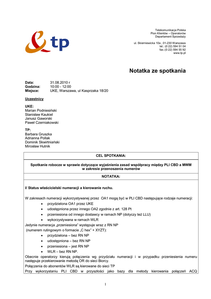 Telekomunikacja Polska Pion Klientów – Operatorów Departament Sprzedaży ul. Skierniewicka 10a , 01-230 Warszawa tel.: (0 22) 594 51 04 fax.:(0 22) 594 55 92 www.tp.pl Notatka ze spotkania Data: Godzina: Miejsce: 31.08.2010 r 10:00 - 12:00 UKE, Warszawa, ul Kasprzaka 18/20 Uczestnicy UKE: Marian Podniesiński Stanisław Kaukiel Janusz Gaworski Paweł Czerniakowski TP: Barbara Gruszka Adrianna Pollak Dominik Skwirtniański Mirosław Hutnik CEL SPOTKANIA: Spotkanie robocze w sprawie dotyczące wyjaśnienia zasad współpracy między PLI CBD a MWM w zakresie przenoszenia numerów NOTATKA: I/ Status właścicielski numeracji a kierowanie ruchu. W zakresach numeracji wykorzystywanej przez OA1 mogą być w PLI CBD następujące rodzaje numeracji: · przydzielona OA1 przez UKE · udostępniona przez innego OA2 zgodnie z art. 128 Pt · przeniesiona od innego dostawcy w ramach NP (dotyczy też LLU) · wykorzystywana w ramach WLR Jedynie numeracja „przeniesiona” występuje wraz z RN NP (numerem rutingowym o formacie „C hex” + XYZT): · przydzielona – bez RN NP · udostępniona – bez RN NP · przeniesiona – jest RN NP · WLR – bez RN NP. Obecnie operatorzy kierują połączenia wg przydziału numeracji i w przypadku przeniesienia numeru następuje przekierowanie metodą OR do sieci Biorcy. Połączenia do abonentów WLR są kierowane do sieci TP Przy wykorzystaniu PLI CBD w przyszłości jako bazy dla metody kierowania połączeń ACQ 1 i „odnalezieniu” numeru WLR w zakresie numeracji wykorzystywanej w ramach WLR przez OA mielibyśmy do czynienia z niewłaściwym kierowaniem połączeń do OA a nie TP. TP zaproponowała specjalne cechowanie numeracji WLR w bazie PLI CBD. · w systemach TP dla oznaczania połączeń od abonentów WLR stosowany jest numer rutingowy RN WLR (4 cyfry) o formacie „B hex” + xyk gdzie xy to 2 cyfry z numeru NDS 4D (10xy). · numer RN WLR (z „B hex”) pobrany wraz z numerem WLR wskazywałby na konieczność kierowania połączenia do sieci TP. · każdy inny sposób oznaczania numeru WLR w bazie PLI CBD jest równie dobry. Zdaniem UKE sprawa nie jest istotna, gdyż PLI CBD dla potrzeb referencyjnych NP będzie zawierała jedynie numery przeniesione (wraz z RN operatorów do których sieci zostały przeniesione). W bazie NP nie znajdą się więc numery WLR. II/ Realizacja wniosków abonentów przez PLI CBD lub MWM. Zdaniem TP realizacja zamówień Abonentów powinna następować za pośrednictwem PLI CBD lub MWM, gdzie: · w przypadku „czystego” NP, nie powiązanego z usługą hurtową, realizacja zamówienia będzie następować poprzez PLI CBD · w sytuacji, gdy realizacja zamówienia Abonenta wymaga wykreowania usługi hurtowej (WLR, BSA, LLU) nie obowiązuje realizacja poprzez PLI CBD, realizacja następuje poprzez MWM realizacja przejścia z WLR na NP. – według TP ten proces również powinien odbywać się w PLI CBD gdyż w tym przypadku nie następuje przejście Abonenta na Usługę Hurtową.. (dotyczy również procesu odejścia Abonenta z TP do innego OA a więc POTS/ ISDN na NP) · W przypadku, gdy OA ma wątpliwości, na jaką usługę klient przechodzi może skorzystać z płatnego procesu odpytania TP przez OA o usługi aktywne świadczone na łączu abonenckim: · · jeśli zamówienie dotyczy realizacji usługi hurtowej realizacja poprzez MWM jeśli zamówienie dotyczy przejścia z usługi hurtowej na inna usługę nie hurtową (a więc nie WLR, LLU, BSA) wtedy realizacja zamówień powinna nastąpić poprzez PLI CBD (np. przejście z WLR na NP.) W przypadku braku sieci w siedzibie Abonenta, który wnioskuje o przeniesienie numeru, a tym samym w sytuacji konieczności wykreowania sieci, nie obowiązują terminy z RMI i Biorca ma prawo odrzucić takie zamówienie na podstawie art. 6 ust. 11 RMI. Katalog przypadków jakie kwalifikowałyby do odrzucenia z kodem „ brak sieci w siedzibie Abonenta” zostanie dookreślony w ramach prac nad definiowaniem wymagań do PLI CBD i MWM. W przypadku usługi hurtowej, po zakończeniu procesu realizacji usługi w MWM informacja o zrealizowanym zamówieniu musi zostać przekazana do PLI CBD (aktualizacja – patrz również punkt III/ ) · wg TP aktualizacja powinna odbywać się on-line lub raz na 24. UKE zgadza się z tym stanowiskiem, gdyż wiadomo, iż aktualizację bazy reguluje art. 78 ust. 5 Pt. TP zobowiązała się do przygotowania zestawienia procesów w podziale na te, które powinny być realizowane poprzez PLI CBD i oraz poprzez MWM . Zestawienia takie zostało przygotowane i załączone – jak poniżej – do notatki: 2 Dla MWM są to następujące grupy procesów: · · · · · · · · · migracje wraz z/ bez przenośności numerów ( WLR, BSA, LLU, NP), zmiana usługi ze zmianą lub bez zmiany Operatora (WLR, BSA, LLU, NP.) zmiana operatora usługi regulowanej (BSA, LLU, WLR) zmiana rodzaju dostępu usługi LLU (z NP./bez NP.) Zamówienie usługi regulowanej na łączu abonenckim aktywnym Zamówienie usługi regulowanej na łączu abonenckim nieaktywnym Modyfikacje usługi regulowanej- zmiana miejsca lokalizacji Cesja/zmiana abonenta/zmiana ewidencyjna usługi regulowanej Zamówienie na modyfikację usługi regulowanej poprzez ISI: - dodanie/usunięcie numeru MSN/DDI - zmiana numeru - zmiana preselekcji Dla PLI CBD są to następujące grupy procesów: · · · · POTS- NP. ISDN-NP Zmiana operatora usługi NP. (kaskada) WLR na NP. · Powroty NP W toku prac nad MWM oraz aktualizacją MWM i PLI CBD TP przygotuje kody odrzutu dla przypadku błędnego zainicjowania procesu np. w PLI CBD to, co powinno trafić do MWM i odwrotnie. Przedstawiciele TP opisali też sprawę KPI: · w MWM zgodne z MWM, · w PLI CBD zgodne z PLI CBD / RMI III/ Zasilanie bazy (dane o numerach) – pull czy push Do wyjaśnienia pozostała kwestia zasilania bazy: · · na zapytanie z PLI CBD co pewien czas, przez TP po każdym zrealizowanym zamówieniu poprzez MWM (przy założeniu, że dla NP w wyn