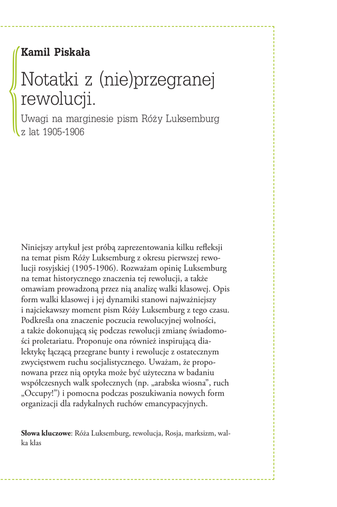 Kamil Piskala / Notatki z (nie)przegranej rewolucji. . Uwagi na marginesie pism Róz y Luksemburg z lat 1905-1906 Niniejszy artykuł jest próbą zaprezentowania kilku refleksji na temat pism Róży Luksemburg z okresu pierwszej rewolucji rosyjskiej (1905-1906). Rozważam opinię Luksemburg na temat historycznego znaczenia tej rewolucji, a także omawiam prowadzoną przez nią analizę walki klasowej. Opis form walki klasowej i jej dynamiki stanowi najważniejszy i najciekawszy moment pism Róży Luksemburg z tego czasu. Podkreśla ona znaczenie poczucia rewolucyjnej wolności, a także dokonującą się podczas rewolucji zmianę świadomości proletariatu. Proponuje ona również inspirującą dialektykę łączącą przegrane bunty i rewolucje z ostatecznym zwycięstwem ruchu socjalistycznego. Uważam, że proponowana przez nią optyka może być użyteczna w badaniu współczesnych walk społecznych (np. „arabska wiosna”, ruch „Occupy!”) i pomocna podczas poszukiwania nowych form organizacji dla radykalnych ruchów emancypacyjnych. Słowa kluczowe: Róża Luksemburg, rewolucja, Rosja, marksizm, walka klas } anzpraktyka cyteroet 6/2012 130 W chwili wybuchu pierwszej rosyjskiej rewolucji tzw. marksizm II Międzynarodówki znajdował się u szczytu swego powodzenia. Skodyfikowany przez cieszącego się opinią najzdolniejszego ucznia Engelsa, Karola Kautsky’ego, usystematyzowany i rozwijany w różnych obszarach przez grono takich myślicieli, jak choćby Franz Mehring, Jerzy Plechanow, Wiktor Adler, Paul Lafargue, zdawał się być teorią, która w poprawny sposób tłumaczy proces dziejowy. Program Erfurcki niemieckiej SPD dokonywał translacji ogólnej teorii na język politycznej praktyki; uznany powszechnie za najdoskonalszą tego typu próbę, stał się wzorem, na którym swoje programy oparły inne partie socjaldemokratyczne kontynentu. Po „odparciu” wyzwania, jakim był Bernsteinowski rewizjonizm, nic nie zdawało się zagrażać stabilności tej konstrukcji teoretycznej; istniejące różnice starano się bagatelizować, podtrzymując wrażenie ideowej jedności i zwartości międzynarodowego socjalizmu. Powodów do optymizmu nie brakowało. Świat zdawał się bowiem „planowo” kroczyć ku ustrojowi socjalistycznemu – z miesiąca na miesiąc rosły szeregi „uświadomionych” robotników, zrzeszonych w partiach socjaldemokratycznych, postępowała centralizacja i kartelizacja produkcji, a kolejne wybory przynosiły każdorazowo coraz więcej mandatów listom socjalistycznym. Największy podziw budziły sukcesy socjaldemokracji niemieckiej, która mimo represji w okresie kanclerstwa Bismarcka, zdołała objąć swoimi bezpośrednimi wpływami kilka milionów robotników, stając się realnym zagrożeniem dla stabilności cesarskiego tronu. Rosyjska rewolucja 1905 roku wyznacza początek procesu dezintegracji „kościoła”, na którego czele stał – nie przypadkiem nazywany „papieżem marksizmu” – Kautsky. Kres ten niosła nie tyle nawet sama rewolucja, odbywająca się przecież na peryferiach ówczesnego „cywilizowanego” świata, co problemy i pytania teoretyczne, które postawiła przed całym ruchem socjalistycznym. Kwestia strajku masowego, wysunięta przez Różę Luksemburg, skupiała w sobie, jak w soczewce, niewyartykułowane dotychczas różnice w poglądach najważniejszych teoretyków Międzynarodówki. Doświadczenia rewolucji rosyjskiej zmusiły ówczesnych marksistów do namysłu nad dynamiką walki klasowej, relacjami łączącymi partię oraz masy, a przede wszystkim nad pytaniem o stosunek między teorią i praktyką w ruchu socjalistycznym. Zrodzona z analizy rosyjskich doświadczeń broszura Strajk masowy, partia i związki zawodowe stanowiła wstęp do debaty toczonej, ze zmienną intensywnością, do wybuchu wojny. Początkowo zdawało się, że jest to jedynie spór o drobne niuanse, z czasem jednak jasnym zaczęło stawać się, że w centrum polemiki znajduje się najważniejsza kwestia socjalistycznej strategii – sposób rozumienia rewolucji i wybór dróg do niej prowadzą- Kamil Piskala / 131 anzpraktyka cyteroet 6/2012 cych1. Przywołując rozróżnienia obecne w historiografii, możemy mówić o stopniowym zastępowaniu prostego podziału na „marksistów” i „rewizjonistów”, bardziej skomplikowanym podziałem na „lewicę”, „centrum” i „prawicę” w łonie ówczesnej SPD, a pośrednio również w całej Międzynarodówce2. Nie jest przypadkiem, że Carl Schorske, rekonstruując w klasycznej pracy German Social Democracy 1905-1917: the Development of the Great Schism przebieg procesów dezintegracji w niemieckiej socjaldemokracji, za punkt wyjścia dla swych rozważań przyjmuje właśnie rok 19053. To wówczas, zrazu bardzo powoli, zaczęło kształtować się radykalne, zdecydowanie rewolucyjne skrzydło Międzynarodówki, stanowiące bazę, na której później wyrosły zachodnioeuropejskie partie komunistyczne. Podział ruchu robotniczego, który dokonał się po rewolucji październikowej, był tutaj zwieńczeniem znacznie dłuższego procesu, zapoczątkowanego właśnie w 1905 roku4. W niniejszym tekście przyjrzę się pismom Róży Luksemburg pochodzącym właśnie z lat 1905-1906, będącym próbą zmierzenia się z fenomenem rosyjskiej rewolucji. Przygotowały one grunt pod przyszłe polemiki, które stać się miały jednym z czynników potęgujących podziały wewnątrz myśli marksistowskiej. Nie aspiruję do dokonania całościowej analizy sformułowanej przez autorkę Akumulacji kapitału, teorii procesu rewolucyjnego, realizacja takiego zadania wymagałaby bowiem, jak sądzę, długoletnich badań i kilkusetstronicowej rozprawy. Nie chcę też dokonywać zwięzłej a systematycznej rekonstrukcji najważniejszych elementów jej stanowiska w tej kwestii – podobne próby, z dobrym zresztą skutkiem, zostały już w polskiej literaturze przeprowadzone5. Podejmę 1 M. Waldenberg, W