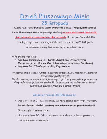 Dzień Pluszowego Misia 25 listopada Już po raz trzeci Fundacji Mam Marzenie z okazji Międzynarodowego Dnia Pluszowego Misia organizuje zbiórkę nowych pluszowych maskotek, gier, zabawek oraz materiałów plastycznych dla pacjentów oddziałów onkologicznych w całym kraju. Zebrane dary zostaną 25 listopada przekazane do szpitali dziecięcych w całym kraju. W Poznaniu trafią do: Szpitala Klinicznego im. Karola Jonschera Uniwersytetu Medycznego im. Karola Marcinkowskiego przy ulicy Szpitalnej Szpitala św. Józefa przy ulicy Krysiewicza W poprzednich latach fundacja zebrała ponad 12.000 maskotek, zabawek i materiałów plastycznych. Bardzo ważne, ze względów higienicznych jest, aby wszystkie przekazane dary były nowe (używane maskotki nie mogą zostać wniesione na teren szpitala, a więc nie zrealizują swojej misji) Zbiórka trwa do 20 listopada br. Uczniowie klas 0 – III przekazują przyniesione dary wychowawcom. Po zakończeniu zbiórki zostaną one zebrane przez przedstawicieli Samorządu Uczniowskiego. Uczniowie klas IV – VI przekazują dary klasowym koordynatorom, a ci opiekunowi samorządu. Dzień Pluszowego Misia został ustanowiony w setną rocznicę niezwykłego wydarzenia. Prezydent Stanów Zjednoczonych Teodor Roosvelt brał udział w polowaniu, w trakcie którego postrzelono małego niedźwiadka. Prezydent kazał przerażone zwierzątko uwolnić. Świadek tego wydarzenia narysował uwolnionego misia pod opieką prezydenta, jeden z producentów zabawek, wykorzystał rysunek, jako model nowej zabawki nazwanej na cześć prezydenta „Teddy Bear”. Od tego dnia pluszowe zabawki towarzyszą zarówno małym dzieciom, młodzieży jak i dorosłym. Są przy nas od najmłodszych lat, w chwilach radość, wtedy, gdy się boimy czy gdy potrzebujemy otuchy.