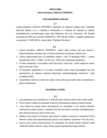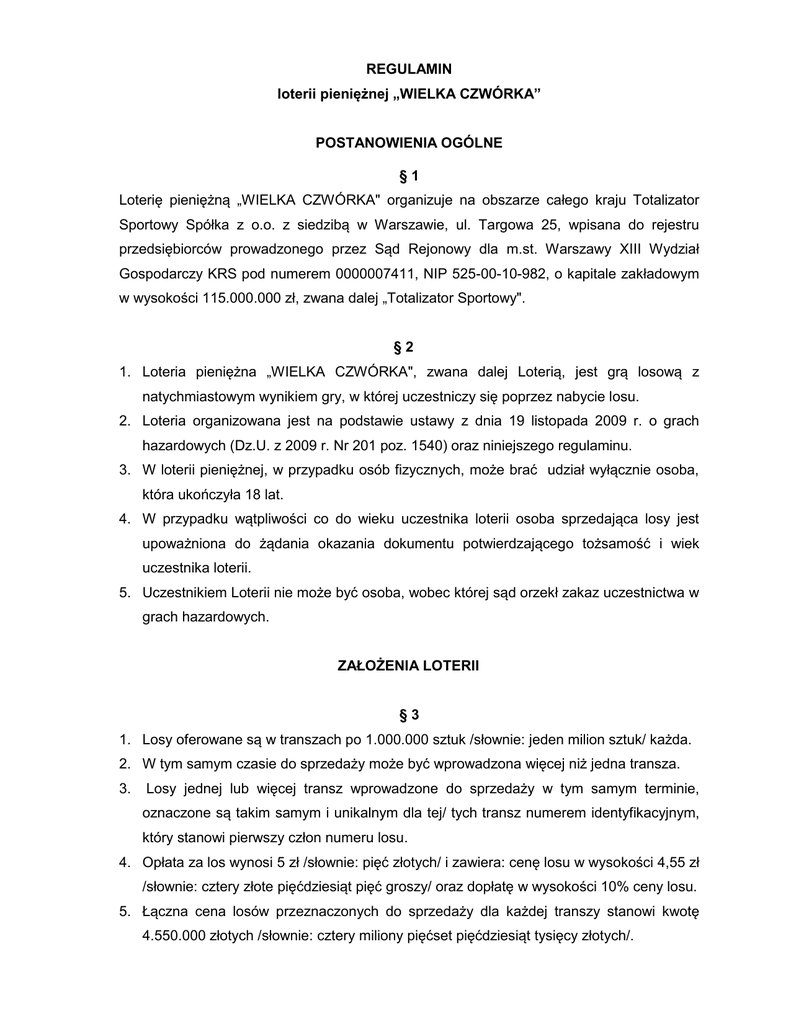 REGULAMIN loterii pieniężnej „WIELKA CZWÓRKA” POSTANOWIENIA OGÓLNE §1 Loterię pieniężną „WIELKA CZWÓRKA" organizuje na obszarze całego kraju Totalizator Sportowy Spółka z o.o. z siedzibą w Warszawie, ul. Targowa 25, wpisana do rejestru przedsiębiorców prowadzonego przez Sąd Rejonowy dla m.st. Warszawy XIII Wydział Gospodarczy KRS pod numerem 0000007411, NIP 525-00-10-982, o kapitale zakładowym w wysokości 115.000.000 zł, zwana dalej „Totalizator Sportowy". §2 1. Loteria pieniężna „WIELKA CZWÓRKA", zwana dalej Loterią, jest grą losową z natychmiastowym wynikiem gry, w której uczestniczy się poprzez nabycie losu. 2. Loteria organizowana jest na podstawie ustawy z dnia 19 listopada 2009 r. o grach hazardowych (Dz.U. z 2009 r. Nr 201 poz. 1540) oraz niniejszego regulaminu. 3. W loterii pieniężnej, w przypadku osób fizycznych, może brać udział wyłącznie osoba, która ukończyła 18 lat. 4. W przypadku wątpliwości co do wieku uczestnika loterii osoba sprzedająca losy jest upoważniona do żądania okazania dokumentu potwierdzającego tożsamość i wiek uczestnika loterii. 5. Uczestnikiem Loterii nie może być osoba, wobec której sąd orzekł zakaz uczestnictwa w grach hazardowych. ZAŁOŻENIA LOTERII §3 1. Losy oferowane są w transzach po 1.000.000 sztuk /słownie: jeden milion sztuk/ każda. 2. W tym samym czasie do sprzedaży może być wprowadzona więcej niż jedna transza. 3. Losy jednej lub więcej transz wprowadzone do sprzedaży w tym samym terminie, oznaczone są takim samym i unikalnym dla tej/ tych transz numerem identyfikacyjnym, który stanowi pierwszy człon numeru losu. 4. Opłata za los wynosi 5 zł /słownie: pięć złotych/ i zawiera: cenę losu w wysokości 4,55 zł /słownie: cztery złote pięćdziesiąt pięć groszy/ oraz dopłatę w wysokości 10% ceny losu. 5. Łączna cena losów przeznaczonych do sprzedaży dla każdej transzy stanowi kwotę 4.550.000 złotych /słownie: cztery miliony pięćset pięćdziesiąt tysięcy złotych/. §4 1. Wysokość kapitału przeznaczonego na wygrane pieniężne wynosi dla każdej transzy 2.872.500 złotych /słownie: dwa miliony osiemset siedemdziesiąt dwa tysięcy pięćset złotych/ co stanowi 63,13% łącznej ceny losów przeznaczonych do sprzedaży. 2. Ilość i wysokość wygranych w Loterii dla każdej transzy: Stopień wygranych Ilość wygranych Wartość wygranych Łączna wartość w złotych wygranych w złotych I 1 150 000 150 000 II 3 7 500 22 500 III 100 750 75 000 IV 1 000 75 75 000 V 5 000 50 250 000 VI 10 000 30 300 000 VII 20 000 20 400 000 VIII 30 000 15 450 000 IX 40 000 10 400 000 X 150 000 5 750 000 Razem wygranych: 256.104 sztuki dla każdej transzy. ZNAMIONA LOSÓW §5 Losy Loterii wykonane są w formie prostokąta o wymiarach 10,16 cm x 15,24 cm. §6 Na pierwszej stronie losu wydrukowano: 1) nazwę loterii, 2) oznaczenie opłaty za los, 3) logo loterii pieniężnych Totalizatora Sportowego, 4) instrukcje dla uczestników Loterii, 5) pola gry pokryte w całości ścieralną warstwą ochronną, 6) numer identyfikacyjny losu. §7 Na drugiej stronie losu wydrukowano: 1) tabelę wygranych, 2) informacje o organizatorze Loterii i sposobie odbioru wygranej pieniężnej, 3) kody kreskowe i numery służące do identyfikacji losu, 4) logo Totalizatora Sportowego. WARUNKI SPRZEDAŻY LOSÓW §8 1. Termin rozpoczęcia sprzedaży losów oraz ilość transz Loterii, oznaczonych takim samym i unikalnym dla tej/ tych transz numerem identyfikacyjnym, który stanowi pierwszy człon numeru losu, każdorazowo określa Totalizator Sportowy i podaje do publicznej wiadomości grających z co najmniej 3 – dniowym wyprzedzeniem. 2. Termin zakończenia sprzedaży losów Loterii, oznaczonych takim samym i unikalnym dla tej/ tych transz numerem identyfikacyjnym, który stanowi pierwszy człon numeru losu, każdorazowo określa Totalizator Sportowy i podaje do publicznej wiadomości grających z co najmniej 7 – dniowym wyprzedzeniem. §9 Totalizator Sportowy prowadzi sprzedaż losów Loterii za pośrednictwem kolektur oraz innych sieci dystrybucji. § 10 1. Przy zakupie losu uczestnik Loterii obowiązany jest sprawdzić, czy los spełnia wymogi określone w § 5 -7 niniejszego regulaminu. 2. W przypadku stwierdzenia przez uczestnika Loterii, że los nie spełnia wymogów określonych w § 5 -7 niniejszego regulaminu, nabywcy przysługuje zwrot ceny losu wraz z dopłatą w zamian za zwrócony los, w miejscu i momencie jego nabycia, pod warunkiem, że zwracany los nie nosi cech dokonanych zdrapań. § 11 Nabycie losu jest równoznaczne z przyjęciem warunków uczestnictwa w Loterii określonych niniejszym regulaminem. ZASADY LOTERII § 12 1. Los bierze udział w grze o wygrane pieniężne. 2. Na losie znajdują się trzy pola gry. W celu uzyskania wyniku gry, nabywca losu usuwa ścieralną warstwę ochronną: z pola gry oznaczonego „Gra 1” składającego się z dwóch części oznaczonych „Wygrywający symbol” i „Twoje symbole”. Jeżeli pod ścieralną warstwą ochronną na części „Twoje symbole” jakikolwiek z czterech symboli ma swój odpowiednik pod ścieralną warstwą ochronną na części „Wygrywający symbol” (jest taki sam) oznacza to uzyskanie wygranej pieniężnej w wysokości przypisanej do tego symbolu (dodatkowo opisanej słownie), z pola gry oznaczonego „Gra 2” . Jeżeli na polu gry po usunięciu ścieralnej warstwy ochronnej wśród sześciu kwot (opisanych dodatkowo słownie) trzykrotnie wystąpi taka sama kwota, oznacza to uzyskanie wygranej pieniężnej w wysokości równej jednokrotności tej kwoty w złotych. z pola gry oznaczonego „BONUS” . Jeżeli na polu gry znajdzie pod nadrukiem „BONUS” symbol cyfry cztery to przysługuje wygrana w złotych (dodatkowo opisana słownie) przypisana do tego symbolu. 3. Na jednym losie wygrane mogą wystąpić w następujący sposób: tylko na polu gry oznaczonym „Gra 1”, tylko na polu g