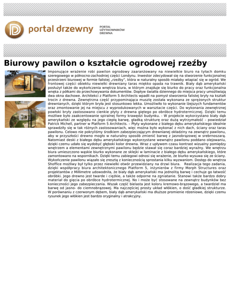 Biurowy pawilon o kształcie ogrodowej rzeźby Imponujące wrażenie robi pawilon ogrodowy zaaranżowany na niewielkie biuro na tyłach domku szeregowego w północno-zachodniej części Londynu. Inwestor zdecydował się na stworzenie funkcjonalnej przestrzeni biurowej w formie falistej „rzeźby”, która w naturalny sposób miałaby wtapiać się w ogród. We frontowej części obiektu niewielki drewniany taras miękko opada na trawnik. Biały dąb amerykański posłużył także do wykończenia wnętrza biura, w którym znajduje się biurko do pracy oraz funkcjonalna wnęka z półkami do przechowywania dokumentów. Dopływ światła dziennego do miejsca pracy umożliwiają dwa okna dachowe. Architekci z Platform 5 Architects wpadli na pomysł stworzenia falistej bryły na kształt trocin z drewna. Zewnętrzna część przypominająca muszlę została wykonana ze sprężonych struktur drewnianych, dzięki którym bryła jest stosunkowo lekka. Umożliwiło to wykonanie lżejszych fundamentów oraz zmontowanie jej na miejscu z wyprodukowanych w warsztacie części. Do wykonania zewnętrznej powłoki bryły zastosowano cienkie płyty z drewna giętego po obróbce hydrotermicznej. Dzięki temu możliwe było zaakcentowanie spiralnej formy krawędzi budynku. - W projekcie wykorzystano biały dąb amerykański ze względu na jego ciepłą barwę, gładką strukturę oraz dużą wytrzymałość – powiedział Patrick Michell, partner w Platform 5 Architects. – Płyty wykonane z białego dębu amerykańskiego idealnie sprawdziły się w tak różnych zastosowaniach, więc można było wykonać z nich dach, ściany oraz taras pawilonu. Celowo nie pokryliśmy środkiem zabezpieczającym drewnianej okładziny na zewnątrz pawilonu, aby w przyszłości drewno mogło w naturalny sposób zmienić barwę z jasnobrązowej w srebrnoszarą. Natomiast deski z białego dębu amerykańskiego wykorzystane wewnątrz pawilonu poddano olejowaniu, dzięki czemu udało się wydobyć głęboki kolor drewna. Wraz z upływem czasu kontrast wizualny pomiędzy wnętrzem a elementami zewnętrznymi pawilonu będzie stawał się coraz bardziej wyraźny. We wnętrzu biura umieszczono wąskie biurko wykonane ze sklejki w laminacie z białego dębu amerykańskiego, które zamontowano na wspornikach. Dzięki temu zabiegowi odnosi się wrażenie, że biurko wysuwa się ze ściany. Wykończenie pawilonu wiązało się zresztą z koniecznością sprostania kilku wyzwaniom. Dostęp do wnętrza Shoffice możliwy był tylko przez niewielki otwór przewidziany na drzwi biura. Realizacja tego zadania, dzięki współpracy biura architektonicznego Platform 5, inżynierów z firmy Morph Structures oraz projektantów z Millimetre udowodniła, że biały dąb amerykański ma jednolitą barwę i cechuje go łatwość obróbki. Jego drewno jest twarde i ciężkie, a także odporne na zgniatanie. Stanowi także bardzo dobry materiał do gięcia po obróbce hydrotermicznej. No i może być stosowane na zewnątrz budynków bez konieczności jego zabezpieczania. Wszak część bielasta jest koloru kremowo-brązowego, a twardziel ma barwę od jasno- do ciemnobrązowej. Ma najczęściej prosty układ włókien, o dość gładkiej strukturze. W porównaniu z czerwonym dębem, biały dąb amerykański ma dłuższe promienie rdzeniowe, dzięki czemu rysunek jego włókien jest bardzo oryginalny i atrakcyjny.