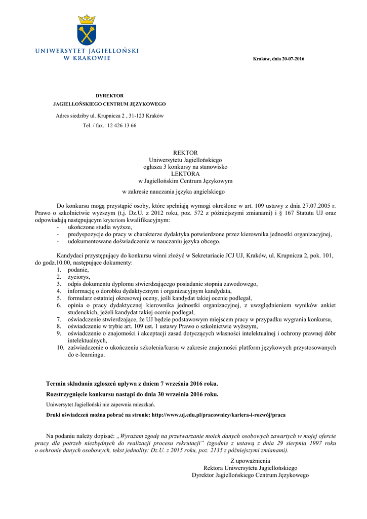 Kraków, dnia 20-07-2016 DYREKTOR JAGIELLOŃSKIEGO CENTRUM JĘZYKOWEGO Adres siedziby ul. Krupnicza 2 , 31-123 Kraków Tel. / fax.: 12 426 13 66 REKTOR Uniwersytetu Jagiellońskiego ogłasza 3 konkursy na stanowisko LEKTORA w Jagiellońskim Centrum Językowym w zakresie nauczania języka angielskiego Do konkursu mogą przystąpić osoby, które spełniają wymogi określone w art. 109 ustawy z dnia 27.07.2005 r. Prawo o szkolnictwie wyższym (t.j. Dz.U. z 2012 roku, poz. 572 z późniejszymi zmianami) i § 167 Statutu UJ oraz odpowiadają następującym kryteriom kwalifikacyjnym: ukończone studia wyższe, predyspozycje do pracy w charakterze dydaktyka potwierdzone przez kierownika jednostki organizacyjnej, udokumentowane doświadczenie w nauczaniu języka obcego. Kandydaci przystępujący do konkursu winni złożyć w Sekretariacie JCJ UJ, Kraków, ul. Krupnicza 2, pok. 101, do godz.10.00, następujące dokumenty: 1. podanie, 2. życiorys, 3. odpis dokumentu dyplomu stwierdzającego posiadanie stopnia zawodowego, 4. informację o dorobku dydaktycznym i organizacyjnym kandydata, 5. formularz ostatniej okresowej oceny, jeśli kandydat takiej ocenie podlegał, 6. opinia o pracy dydaktycznej kierownika jednostki organizacyjnej, z uwzględnieniem wyników ankiet studenckich, jeżeli kandydat takiej ocenie podlegał, 7. oświadczenie stwierdzające, że UJ będzie podstawowym miejscem pracy w przypadku wygrania konkursu, 8. oświadczenie w trybie art. 109 ust. 1 ustawy Prawo o szkolnictwie wyższym, 9. oświadczenie o znajomości i akceptacji zasad dotyczących własności intelektualnej i ochrony prawnej dóbr intelektualnych, 10. zaświadczenie o ukończeniu szkolenia/kursu w zakresie znajomości platform językowych przystosowanych do e-learningu. Termin składania zgłoszeń upływa z dniem 7 września 2016 roku. Rozstrzygnięcie konkursu nastąpi do dnia 30 września 2016 roku. Uniwersytet Jagielloński nie zapewnia mieszkań. Druki oświadczeń można pobrać na stronie: http://www.uj.edu.pl/pracownicy/kariera-i-rozwój/praca Na podaniu należy dopisać: „Wyrażam zgodę na przetwarzanie moich danych osobowych zawartych w mojej ofercie pracy dla potrzeb niezbędnych do realizacji procesu rekrutacji” (zgodnie z ustawą z dnia 29 sierpnia 1997 roku o ochronie danych osobowych, tekst jednolity: Dz.U. z 2015 roku, poz. 2135 z późniejszymi zmianami). Z upoważnienia Rektora Uniwersytetu Jagiellońskiego Dyrektor Jagiellońskiego Centrum Językowego