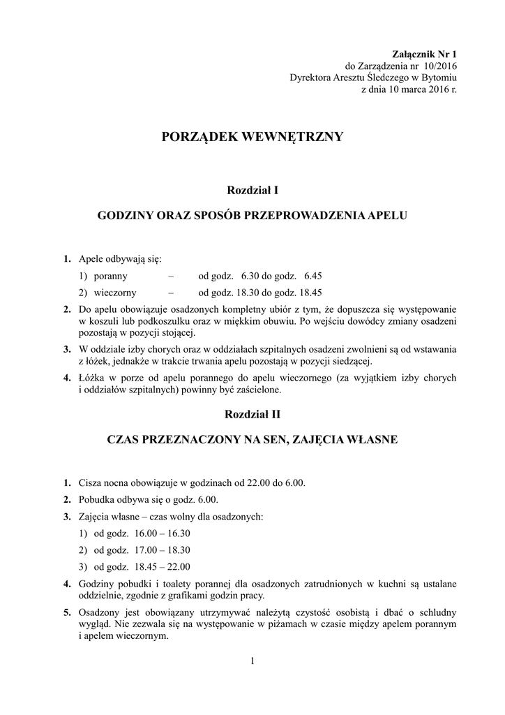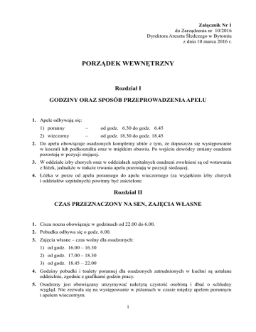 Załącznik Nr 1 do Zarządzenia nr 10/2016 Dyrektora Aresztu Śledczego w Bytomiu z dnia 10 marca 2016 r. PORZĄDEK WEWNĘTRZNY Rozdział I GODZINY ORAZ SPOSÓB PRZEPROWADZENIA APELU 1. Apele odbywają się: 1) poranny – od godz. 6.30 do godz. 6.45 2) wieczorny – od godz. 18.30 do godz. 18.45 2. Do apelu obowiązuje osadzonych kompletny ubiór z tym, że dopuszcza się występowanie w koszuli lub podkoszulku oraz w miękkim obuwiu. Po wejściu dowódcy zmiany osadzeni pozostają w pozycji stojącej. 3. W oddziale izby chorych oraz w oddziałach szpitalnych osadzeni zwolnieni są od wstawania z łóżek, jednakże w trakcie trwania apelu pozostają w pozycji siedzącej. 4. Łóżka w porze od apelu porannego do apelu wieczornego (za wyjątkiem izby chorych i oddziałów szpitalnych) powinny być zaścielone. Rozdział II CZAS PRZEZNACZONY NA SEN, ZAJĘCIA WŁASNE 1. Cisza nocna obowiązuje w godzinach od 22.00 do 6.00. 2. Pobudka odbywa się o godz. 6.00. 3. Zajęcia własne – czas wolny dla osadzonych: 1) od godz. 16.00 – 16.30 2) od godz. 17.00 – 18.30 3) od godz. 18.45 – 22.00 4. Godziny pobudki i toalety porannej dla osadzonych zatrudnionych w kuchni są ustalane oddzielnie, zgodnie z grafikami godzin pracy. 5. Osadzony jest obowiązany utrzymywać należytą czystość osobistą i dbać o schludny wygląd. Nie zezwala się na występowanie w piżamach w czasie między apelem porannym i apelem wieczornym. 1 Rozdział III CZAS PRZEZNACZONY NA PRACĘ 1. Osadzeni zatrudnieni przy pracach porządkowych i pomocniczych na rzecz aresztu pracują w ruchomym czasie pracy (system jednozmianowy): w godzinach od 5.00 do 18.00 2. Faktyczny czas pracy określa część etatu na jaki zatrudniony jest osadzony. Efektywny czas pracy osadzonych nie obejmuje przerw w pracy przeznaczonych na spożywanie posiłków, kąpieli, udział w czynnościach procesowych, uczestniczenie w widzeniach. 3. Czas pracy osadzonych zatrudnionych nieodpłatnie, przy pracach porządkowych i pomocniczych w oddziale pawilonu penitencjarnego, ustalany jest indywidualnie i wynosi do 90 godzin. Rozdział IV ZAJĘCIA KULTURALNO – OŚWIATOWE I SPORTOWE 1. Radiowęzeł: 1) Za pośrednictwem radiowęzła nadawane są programy radiowe i audycje własne. 2) Emisja tych programów odbywa się w następujących godzinach: a) od 8.15 do 11.45 b) od 13.15 do 15.00 3) W uzasadnionych przypadkach Dyrektor aresztu może wydłużyć lub skrócić czas nadawania programu. 2. Biblioteka: 1) w środy biblioteka oraz czytelnia są czynne w godzinach od 8.30 do 11.45 oraz dodatkowo dla osadzonych zatrudnionych w godzinach od 15.00 do 16.30. 2) w poniedziałki, wtorki, czwartki, piątki biblioteka oraz czytelnia są czynne w godzinach od 8.30 do 11.45 oraz od 13.15 do 15.00. 3) zasady korzystania z biblioteki i czytelni określa regulamin, udostępniony do wglądu wszystkim zainteresowanym. 4) wymiana książek dla osadzonych przebywających w oddziałach szpitalnych i izbie chorych odbywa się raz na 10 dni roboczych w systemie pośrednim, wymiana książek dla osadzonych pawilonu penitencjarnego odbywa się raz w tygodniu w systemie bezpośrednim, zgodnie z harmonogramem: 1) Poniedziałek – osadzeni przebywający w oddziale I 2 2) Wtorek – osadzeni przebywający w oddziale III 3) Środa – osadzeni przebywający w oddziale IV 4) Czwartek – osadzeni przebywający w oddziale II 5) biblioteka prowadzi wypożyczalnię gier świetlicowych oraz przyjmuje zapisy na prenumeratę gazet i czasopism w terminie do 14 każdego miesiąca, dla osadzonych posiadających środki finansowe. 3. Zajęcia świetlicowe i sportowe: 1) Zajęcia świetlicowe i sportowe realizowane są według planów, zatwierdzonych przez Dyrektora jednostki dla każdego oddziału. 2) Zajęcia w świetlicy realizowane są w godzinach: a) od 8.30 do 10.15 b) od 10.20 do 11.50 c) od 13.10 do 16.20 d) od 17.00 do 18.20 e) od 18.50 do 20.00 ( osadzeni pracujący ) 3) Wobec osadzonych przebywających w oddziałach szpitalnych oraz przebywających w izbie chorych, o uczestnictwie w zajęciach świetlicowych decyduje lekarz. 4) Wyżej wymieniony rozkład godzinowy zajęć świetlicowych może ulec zmianie, w przypadku organizowania między innymi kół zainteresowań, imprez itp. 4. Wspólnota Anonimowych Alkoholików „NADZIEJA’’ 1) Członkowie Grupy AA spotykają się w każdy czwartek w godzinach od 15.15 do 16.15. 2) Kierowanie osób zainteresowanych odbywa się na wniosek psychologa, który jednocześnie sprawuje nadzór nad działalnością grupy. Rozdział V CZAS I MIEJSCE SPOŻYWANIA POSIŁKÓW 1. Wydawanie i spożywanie posiłków dostarczonych przez administrację odbywa się w godzinach: 1) Śniadanie – od 7.00 do 7.30 2) Obiad – od 12.00 do 13.00 3) Kolacja – od 16.30 do 17.00 2. Osadzeni spożywają posiłki w celach mieszkalnych. 3 Rozdział VI ZASADY PORUSZANIA SIĘ PO TERENIE ARESZTU 1. Ruch osadzonych po terenie aresztu odbywa się w sposób zorganizowany i pod nadzorem, pojedynczo lub w grupach, przede wszystkim w godzinach pracy administracji, tj. w godz. 7.30 – 15.30. 2. Ruch grup osadzonych po terenie aresztu odbywa się w szykach zwartych, pod nadzorem odpowiedzialnych funkcjonariuszy SW, w oparciu o zatwierdzone plany i książki zatrudnienia. 3. Osadzeni zgłaszający się do ambulatorium, magazynu, itp. są doprowadzani przez wyznaczonych funkcjonariuszy. 4. Do magazynu odzieżowego osadzeni doprowadzani są w godzinach 9.00 – 11.30 oraz 13.00 – 14.30, zgodnie z następującym harmonogramem: 1) Wtorek – osadzeni przebywający w oddziale I i IV 2) Środa – osadzeni przebywający w oddziale II i III 3) Poniedziałek – Piątek – osadzeni przebywający w oddziałach szpitalnych i izbie chorych 5. Warunkiem doprowadzenia do magazynu jest złożenie przez osadzonego prośby do godziny 8.00 danego dnia. W sprawach szczególnie skomplikowanych doprowadzenie może nastąpić w późniejszym terminie. Rozdział VII CZAS I PORZĄDEK O