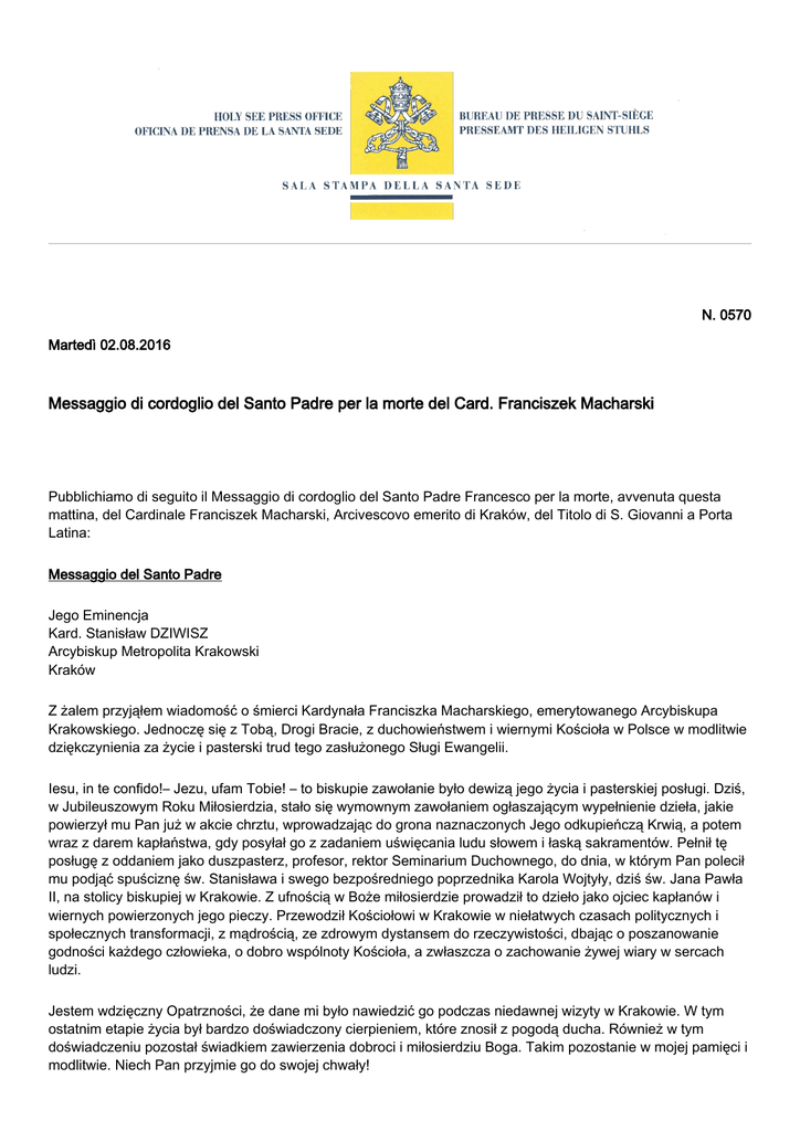 N. 0570 Martedì 02.08.2016 Messaggio di cordoglio del Santo Padre per la morte del Card. Franciszek Macharski Pubblichiamo di seguito il Messaggio di cordoglio del Santo Padre Francesco per la morte, avvenuta questa mattina, del Cardinale Franciszek Macharski, Arcivescovo emerito di Kraków, del Titolo di S. Giovanni a Porta Latina: Messaggio del Santo Padre Jego Eminencja Kard. Stanisław DZIWISZ Arcybiskup Metropolita Krakowski Kraków Z żalem przyjąłem wiadomość o śmierci Kardynała Franciszka Macharskiego, emerytowanego Arcybiskupa Krakowskiego. Jednoczę się z Tobą, Drogi Bracie, z duchowieństwem i wiernymi Kościoła w Polsce w modlitwie dziękczynienia za życie i pasterski trud tego zasłużonego Sługi Ewangelii. Iesu, in te confido!– Jezu, ufam Tobie! – to biskupie zawołanie było dewizą jego życia i pasterskiej posługi. Dziś, w Jubileuszowym Roku Miłosierdzia, stało się wymownym zawołaniem ogłaszającym wypełnienie dzieła, jakie powierzył mu Pan już w akcie chrztu, wprowadzając do grona naznaczonych Jego odkupieńczą Krwią, a potem wraz z darem kapłaństwa, gdy posyłał go z zadaniem uświęcania ludu słowem i łaską sakramentów. Pełnił tę posługę z oddaniem jako duszpasterz, profesor, rektor Seminarium Duchownego, do dnia, w którym Pan polecił mu podjąć spuściznę św. Stanisława i swego bezpośredniego poprzednika Karola Wojtyły, dziś św. Jana Pawła II, na stolicy biskupiej w Krakowie. Z ufnością w Boże miłosierdzie prowadził to dzieło jako ojciec kapłanów i wiernych powierzonych jego pieczy. Przewodził Kościołowi w Krakowie w niełatwych czasach politycznych i społecznych transformacji, z mądrością, ze zdrowym dystansem do rzeczywistości, dbając o poszanowanie godności każdego człowieka, o dobro wspólnoty Kościoła, a zwłaszcza o zachowanie żywej wiary w sercach ludzi. Jestem wdzięczny Opatrzności, że dane mi było nawiedzić go podczas niedawnej wizyty w Krakowie. W tym ostatnim etapie życia był bardzo doświadczony cierpieniem, które znosił z pogodą ducha. Również w tym doświadczeniu pozostał świadkiem zawierzenia dobroci i miłosierdziu Boga. Takim pozostanie w mojej pamięci i modlitwie. Niech Pan przyjmie go do swojej chwały! 2 Tobie, Czcigodny Bracie, polskim Kardynałom i Biskupom, Rodzinie Zmarłego i wszystkim Polakom z serca błogosławię: w imię Ojca i Syna, i Ducha Świętego. Watykan, 2 sierpnia 2016 r. Franciszek [01266-PL.01] [Testo originale: Polacco] Testo in lingua italiana Al Venerato Fratello Cardinale Stanisław Dziwisz Arcivescovo Metropolita di Cracovia Cracovia Ho appreso con dolore la notizia della morte del Cardinale Franciszek Macharski, Arcivescovo Emerito di Cracovia. Mi unisco a Te, Caro Fratello, al Presbiterio e ai fedeli della Chiesa in Polonia nella preghiera di ringraziamento per la vita e l’impegno pastorale di questo benemerito Ministro del Vangelo. Iesu, in te confido! – Gesù, confido in te! – questo motto episcopale ha guidato la sua vita e il suo ministero. Oggi, nell’Anno Giubilare della Misericordia, è diventato un’eloquente invocazione che proclama il compimento dell’opera che il Signore gli ha affidato già nell’atto del Battesimo, introducendolo nella schiera dei sigillati con il Suo Sangue redentore, e in seguito insieme con il dono del sacerdozio, quando lo ha inviato con il compito di santificare il Popolo con la parola e con la grazia dei sacramenti. Svolgeva questa missione con zelo come pastore, professore, rettore del Seminario, fino al giorno in cui il Signore gli ha chiesto di farsi carico dell’eredità di San Stanislao e del suo immediato predecessore Karol Wojtyla, oggi San Giovanni Paolo II, sulla sede vescovile a Cracovia. Con fiducia nella Misericordia Divina ha condotto quest’opera come padre per i sacerdoti e per i fedeli affidati alla sua cura. Ha guidato la Chiesa in Cracovia nel non facile periodo delle trasformazioni politiche e sociali, con saggezza, con una sana distacco dalla realtà, preoccupandosi del rispetto di ogni persona, per il bene della comunità della Chiesa, e soprattutto per conservare viva la fede nei cuori degli uomini. Sono grato alla Provvidenza, che mi è stato possibile fargli visita durante la recente visita a Cracovia. Nell’ultima tappa della vita è stato molto provato dalla sofferenza che accettava con serenità di spirito. Anche in questa prova è rimasto fedele testimone della fiducia nella bontà e nella misericordia di Dio. Rimarrà così nella mia memoria e nella preghiera. Il Signore lo accolga nella sua gloria! A Lei, Venerato Fratello, ai Cardinali e ai Vescovi polacchi, alla Famiglia del Defunto, a tutti i fedeli polacchi imparto di cuore la mia benedizione: nel nome del Padre, del Figlio e dello Spirito Santo. Dal Vaticano, 2 agosto 2016 Francesco [01266-IT.01] [Testo originale: Italiano] [B0570-XX.01]