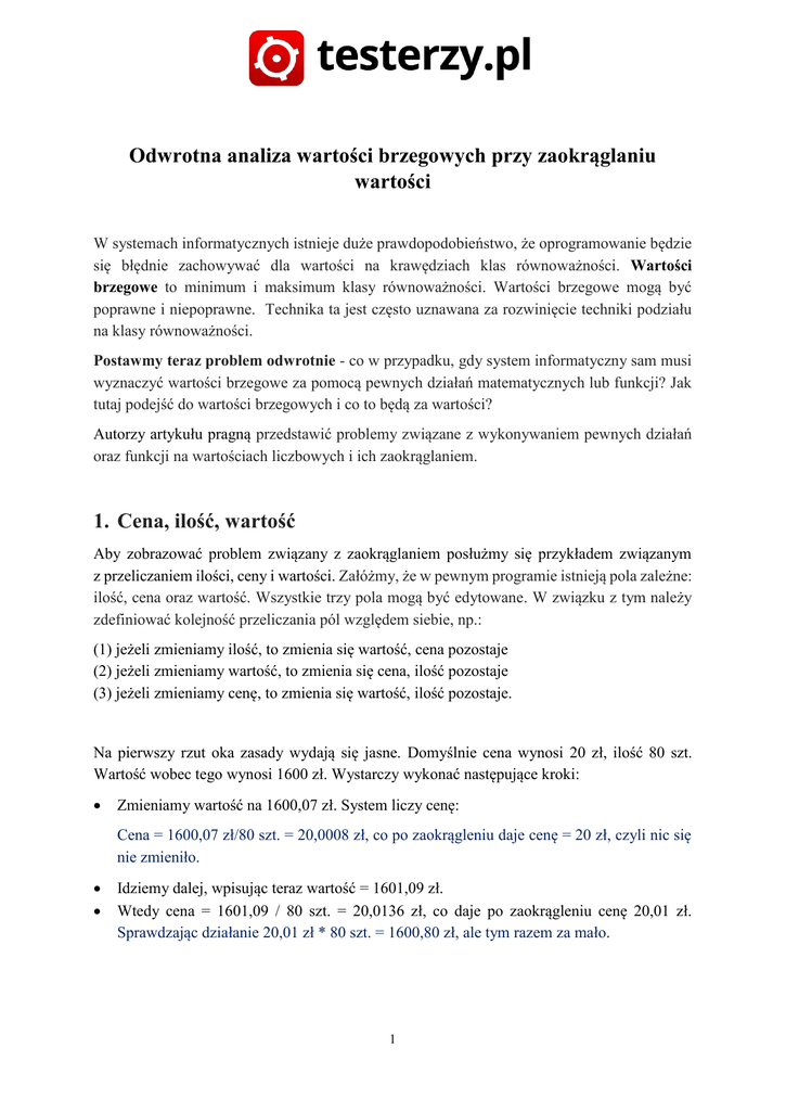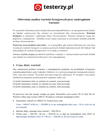 Odwrotna analiza wartości brzegowych przy zaokrąglaniu wartości W systemach informatycznych istnieje duże prawdopodobieństwo, że oprogramowanie będzie się błędnie zachowywać dla wartości na krawędziach klas równoważności. Wartości brzegowe to minimum i maksimum klasy równoważności. Wartości brzegowe mogą być poprawne i niepoprawne. Technika ta jest często uznawana za rozwinięcie techniki podziału na klasy równoważności. Postawmy teraz problem odwrotnie - co w przypadku, gdy system informatyczny sam musi wyznaczyć wartości brzegowe za pomocą pewnych działań matematycznych lub funkcji? Jak tutaj podejść do wartości brzegowych i co to będą za wartości? Autorzy artykułu pragną przedstawić problemy związane z wykonywaniem pewnych działań oraz funkcji na wartościach liczbowych i ich zaokrąglaniem. 1. Cena, ilość, wartość Aby zobrazować problem związany z zaokrąglaniem posłużmy się przykładem związanym z przeliczaniem ilości, ceny i wartości. Załóżmy, że w pewnym programie istnieją pola zależne: ilość, cena oraz wartość. Wszystkie trzy pola mogą być edytowane. W związku z tym należy zdefiniować kolejność przeliczania pól względem siebie, np.: (1) jeżeli zmieniamy ilość, to zmienia się wartość, cena pozostaje (2) jeżeli zmieniamy wartość, to zmienia się cena, ilość pozostaje (3) jeżeli zmieniamy cenę, to zmienia się wartość, ilość pozostaje. Na pierwszy rzut oka zasady wydają się jasne. Domyślnie cena wynosi 20 zł, ilość 80 szt. Wartość wobec tego wynosi 1600 zł. Wystarczy wykonać następujące kroki: Zmieniamy wartość na 1600,07 zł. System liczy cenę: Cena = 1600,07 zł/80 szt. = 20,0008 zł, co po zaokrągleniu daje cenę = 20 zł, czyli nic się nie zmieniło. Idziemy dalej, wpisując teraz wartość = 1601,09 zł. Wtedy cena = 1601,09 / 80 szt. = 20,0136 zł, co daje po zaokrągleniu cenę 20,01 zł. Sprawdzając działanie 20,01 zł * 80 szt. = 1600,80 zł, ale tym razem za mało. 1 Nasuwa się teraz na myśl pytanie: Czy wystarczą do opisu działania funkcji tylko trzy zasady przeliczania ceny, ilości oraz wartości? Sporo osób odpowie, że nie ponieważ warunek (2) jest niesprecyzowany. Należy go rozszerzyć o obsługę przypadków przedstawionych wyżej. Poprawa założeń może być w formie komunikatu, który ostrzega, że wystąpią niezgodności po wprowadzeniu pewnych kwot i wtedy system poprawia wartości albo po prostu używa blokady dla edycji. Należy zatem zastanowić się, czy w ogóle warunek (2) ma sens istnienia, ponieważ „grosz pomnożony przez dużą liczbę daje niemały wynik”. Wnioski z podanego przykładu są takie, że należy bardzo ostrożnie projektować funkcje, który wykorzystują zaokrąglenia i wyznaczają pewne wartości za pomocą matematycznych działań czy funkcji. 2. Planowanie kosztów w czasie za pomocą struktury drzewa W aplikacjach biznesowych spotykamy się z zagadnieniem planowania oraz podziału kosztów. Mogą to być koszty planowane na dzień, tydzień, miesiąc, kwartał, ewentualnie rok. W każdym razie planowanie odbywa się w logicznie zaplanowanym okresie czasu. Załóżmy, że mamy system, w którym chcemy wykonać testy planowania kosztów budowy parku. Koszty te można przedstawiać jako pewne drzewo. Drzewa te mają taką własność, że gałąź zawiera sumę wartości wszystkich swoich podrzędnych gałęzi w odpowiednich kolumnach. W koszty ogólne budowy parku będą wchodziły następujące elementy: 1. Wypłaty dla pracowników a) wynagrodzenie zasadnicze b) zakładane premie 2. Zakup sadzonek, a) drzewa liściaste b) drzewa iglaste c) krzewy d) rośliny 3. Usługi zlecone innym firmom, a) fontanna b) pomniki c) ławki 4. Koszty utrzymania sprzętu, a) paliwo b) konserwacja 2 Zakładane koszty mogą mieć przykładowo takie wartości: Nazwa pozycji Wartość pozycji wynagrodzenie pracowników 108 000,00 zł zakładane premie 15 300,00 zł drzewa liściaste 1 134,00 zł drzewa iglaste 10 612,00 zł krzewy 1 035,00 zł rośliny 1 792,00 zł fontanna 4 900,00 zł pomniki 5 460,00 zł ławki 2 700,00 zł paliwo 3 400,00 zł konserwacja 5 500,00 zł Tabela 1. Koszty pozycji. Ale chcąc mieć pogrupowane koszty wg punktów 1, 2, 3, 4 można te koszty przedstawić w formie drzewa, tak jak niżej: Numer 1 Nazwa pozycji Wartość pozycji Wypłaty dla pracowników 123 300,00 zł 1.1 wynagrodzenie pracowników 108 000,00 zł 1.2 zakładane premie 15 300,00 zł Zakup sadzonek 14 573,00 zł 2 2.1 drzewa liściaste 1 134,00 zł 2.2 drzewa iglaste 10 612,00 zł 2.3 krzewy 2.4 rośliny 3 1 035,00 zł 1 792,00 zł Usługi zlecone innym firmom 13 060,00 zł 3.1 fontanna 4 900,00 zł 3.2 pomniki 5 460,00 zł 3.3 ławki 2 700,00 zł Koszty utrzymania sprzętu 8 900,00 zł 4.1 paliwo 3 400,00 zł 4.2 konserwacja 5 500,00 zł 4 Tabela 2. Pogrupowane pozycje kosztowe. 3 Żółte rekordy to wiersze sumujące podrzędne pozycje. Takie przedstawienie danych już jest bardziej przejrzyste. Można jeszcze dodać wiersz nadrzędny dla wszystkich wierszy podrzędnych przedstawionych wyżej, ponieważ wtedy będzie on zawierał sumę wszystkich kosztów razem: Numer 1 1.1 Nazwa pozycji RAZEM KOSZTY Całość 159 833,00 zł Wypłaty dla pracowników 123 300,00 zł 1.1.1 wynagrodzenie pracowników 108 000,00 zł 1.1.2 zakładane premie 15 300,00 zł Zakup sadzonek 14 573,00 zł 1.2 1.2.1 drzewa liściaste 1 134,00 zł 1.2.2 drzewa iglaste 10 612,00 zł 1.2.3 krzewy 1.2.4 rośliny 1.3 1 035,00 zł 1 792,00 zł Usługi zlecone innym firmom 13 060,00 zł 1.3.1 fontanna 4 900,00 zł 1.3.2 pomniki 5 460,00 zł 1.3.3 ławki 2 700,00 zł Koszty utrzymania sprzętu 8 900,00 zł 1.4.1 paliwo 3 400,00 zł 1.4.2 konserwacja 5 500,00 zł 1.4 Tabela 3. Koszty pozycji pogrupowane z wierszem zbiorczym. Załóżmy, że testujemy system, który wykorzystuje takie właśnie drzewo w celu prezentacji wartości oraz zależności pomiędzy tymi wartościami i