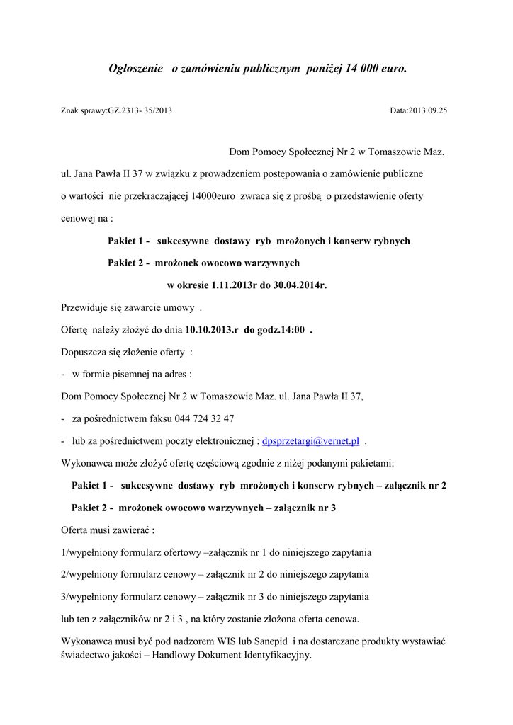 Ogłoszenie o zamówieniu publicznym poniŜej 14 000 euro. Znak sprawy:GZ.2313- 35/2013 Data:2013.09.25 Dom Pomocy Społecznej Nr 2 w Tomaszowie Maz. ul. Jana Pawła II 37 w związku z prowadzeniem postępowania o zamówienie publiczne o wartości nie przekraczającej 14000euro zwraca się z prośbą o przedstawienie oferty cenowej na : Pakiet 1 - sukcesywne dostawy ryb mroŜonych i konserw rybnych Pakiet 2 - mroŜonek owocowo warzywnych w okresie 1.11.2013r do 30.04.2014r. Przewiduje się zawarcie umowy . Ofertę naleŜy złoŜyć do dnia 10.10.2013.r do godz.14:00 . Dopuszcza się złoŜenie oferty : - w formie pisemnej na adres : Dom Pomocy Społecznej Nr 2 w Tomaszowie Maz. ul. Jana Pawła II 37, - za pośrednictwem faksu 044 724 32 47 - lub za pośrednictwem poczty elektronicznej : [email protected] . Wykonawca moŜe złoŜyć ofertę częściową zgodnie z niŜej podanymi pakietami: Pakiet 1 - sukcesywne dostawy ryb mroŜonych i konserw rybnych – załącznik nr 2 Pakiet 2 - mroŜonek owocowo warzywnych – załącznik nr 3 Oferta musi zawierać : 1/wypełniony formularz ofertowy –załącznik nr 1 do niniejszego zapytania 2/wypełniony formularz cenowy – załącznik nr 2 do niniejszego zapytania 3/wypełniony formularz cenowy – załącznik nr 3 do niniejszego zapytania lub ten z załączników nr 2 i 3 , na który zostanie złoŜona oferta cenowa. Wykonawca musi być pod nadzorem WIS lub Sanepid i na dostarczane produkty wystawiać świadectwo jakości – Handlowy Dokument Identyfikacyjny. W przypadku wybrania Państwa oferty , zostaną Państwo poinformowani o terminie podpisania umowy.