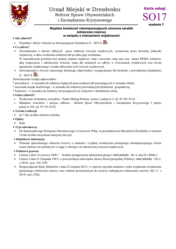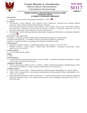 Urząd Miejski w Drezdenku Karta usługi Referat Spraw Obywatelskich i Zarządzania Kryzysowego SO17 wydanie 7 Jak załatwić? Wypłata świadczeń rekompensujących utracone zarobki żołnierzom rezerwy w związku z ćwiczeniami wojskowymi Wypełnić i złożyć wniosek na obowiązującym formularzu (f – SO17a ). Co zabrać? Zaświadczenie o okresie odbytych przez żołnierza ćwiczeń wojskowych, wystawione przez dowódcę jednostki wojskowej, w dniu zwolnienia żołnierza lub po dniu jego zwolnienia. W zaświadczeniu powinien być podany stopień wojskowy, imię i nazwisko, imię ojca oraz numer PESEL żołnierza, datę rozpoczęcia i zakończenia ćwiczeń, sumę dni uznanych za odbyte w ćwiczeniach wojskowych oraz kwotę uposażenia wypłaconego z tytułu odbywania tych ćwiczeń wojskowych. Zaświadczenie o kwocie utraconego dziennego odpowiednio wynagrodzenia lub dochodu z prowadzonej działalności (f – SO17b ). Zaświadczenie wydaje odpowiednio : * pracodawca - w stosunku do żołnierzy będących pracownikami lub pozostających w stosunku służby, * naczelnik urzędu skarbowego - w stosunku do żołnierzy prowadzących działalność gospodarczą, * burmistrz - w stosunku do żołnierzy utrzymujących się wyłącznie z działalności rolnej. Gdzie załatwić? Wydawanie formularzy wniosków - Punkt Obsługi Klienta ( parter ), pokój nr 5, tel. 95 762 29 63. Składanie wniosków i miejsce odbioru - Referat Spraw Obywatelskich i Zarządzania Kryzysowego I piętro, pokój nr 105, tel. 95 762 29 82. Termin realizacji do 7 dni od dnia złożenia wniosku. Opłaty Brak Tryb odwoławczy Do Samorządowego Kolegium Odwoławczego w Gorzowie Wlkp. za pośrednictwem Burmistrza Drezdenka w terminie 14 dni od dnia otrzymania niniejszej decyzji. Dodatkowe informacje Wniosek uprawnionego żołnierza rezerwy o ustalenie i wypłatę świadczenia pieniężnego rekompensującego winien zostać złożony nie później niż w ciągu 3 miesięcy od zakończenia ćwiczeń wojskowych. Podstawa prawna Ustawa z dnia 14 czerwca 1960 r. – Kodeks postępowania administracyjnego ( tekst jednolity - Dz. U. poz.23 z 2016r.), Ustawa z dnia 21 listopada 1967r. o powszechnym obowiązku obrony Rzeczypospolitej Polskiej ( tekst jednolity - Dz.U. z 2015r., poz. 144, 529) Rozporządzenie Rady Ministrów z dnia 25 sierpnia 2015 r. w sprawie sposobu ustalania i trybu wypłacania świadczenia pieniężnego żołnierzom rezerwy oraz osobom przeniesionym do rezerwy niebędącym żołnierzami rezerwy (Dz. U. z 2015r. poz.1520).