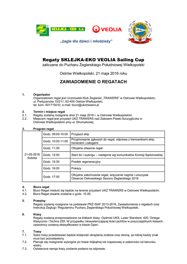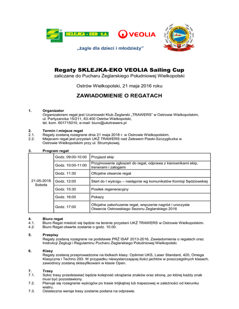 „żagle dla dzieci i młodzieży” Regaty SKLEJKA-EKO VEOLIA Sailing Cup zaliczane do Pucharu Żeglarskiego Południowej Wielkopolski Ostrów Wielkopolski, 21 maja 2016 roku ZAWIADOMIENIE O REGATACH 1. Organizator Organizatorem regat jest Uczniowski Klub Żeglarski „TRAWERS” w Ostrowie Wielkopolskim, ul. Partyzancka 15/211, 63-400 Ostrów Wielkopolski, tel. kom. 601715010, e-mail: [email protected] 2. 2.1. 2.2. Termin i miejsce regat Regaty zostaną rozegrane dnia 21 maja 2016 r. w Ostrowie Wielkopolskim. Miejscem regat jest przystań UKŻ TRAWERS nad Zalewem Piaski-Szczygliczka w Ostrowie Wielkopolskim przy ul. Strumykowej. 3. Program regat 21-05-2016 Sobota Godz. 09:00-10:00 Przyjazd ekip Godz. 10:00-11:00 Przyjmowanie zgłoszeń do regat, odprawa z kierownikami ekip, trenerami i załogami Godz. 11:30 Oficjalne otwarcie regat Godz. 12:00 Start do I wyścigu – następnie wg komunikatów Komisji Sędziowskiej Godz. 15:30 Posiłek regeneracyjny Godz. 16:00 Pokazy Godz. 17:00 Oficjalne zakończenie regat, wręczenie nagród i uroczyste Otwarcie Ostrowskiego Sezonu Żeglarskiego 2016 4. 4.1. 4.2. Biuro regat Biuro Regat mieścić się będzie na terenie przystani UKŻ TRAWERS w Ostrowie Wielkopolskim. Biuro Regat otwarte zostanie o godz. 10.00. 5. Przepisy Regaty zostaną rozegrane na podstawie PRŻ ISAF 2013-2016, Zawiadomienia o regatach oraz Instrukcji Żeglugi i Regulaminu Pucharu Żeglarskiego Południowej Wielkopolski. 6. Klasy Regaty zostaną przeprowadzone na łódkach klasy: Optimist UKS, Laser Standard, 420, Omega Klasyczna i Techno 293. W przypadku niewystarczającej ilości jachtów w poszczególnych klasach, zawodnicy zostaną sklasyfikowani w klasie Open. 7. 7.1. Trasy Szkic trasy przedstawiać będzie kolejność okrążania znaków oraz stronę, po której każdy znak musi być pozostawiony. Planuje się rozegranie wyścigów po trasie trójkątnej lub trapezowej w zależności od kierunku wiatru. Ostateczna wersja trasy zostanie podana na odprawie. 7.2. 7.3. 8. 8.1. 8.2. Zgłoszenia do regat Zgłoszenia na regat przyjmowane będą w Biurze Regat w dniu 21 maja br. od godz. 10.00 do 11.00. Zgłoszenia do regat dzieci i młodzież do lat 18 muszą być podpisane przez rodzica lub opiekuna prawnego. 9. Warunki uczestnictwa Zawodnicy startujący w regatach muszą posiadać: - Aktualne badania lekarskie (w przypadku osób pełnoletnich startujących w klasie Omega dopuszczalne są oświadczenia o stanie dobrym zdrowia) . - Ubezpieczenie OC. 10. 10.1. 10.2. Wpisowe do regat Pobierana będzie opłata wpisowa do regat wysokości 10 zł od osoby. Wpisowe płatne na miejscu w Biurze Regat podczas procedury zgłoszenia do regat. 11. Instrukcja Żeglugi Instrukcja Żeglugi będzie ogłoszona i rozdana w dniu 21.05.2016 r. w Biurze Regat podczas procedury zgłoszeniowej do regat. 12. 12.1. 12.2. Punktacja W regatach stosowany będzie system małych punktów zgodnie z Dodatkiem A PRŻ 2013-2016. Planuje się rozegranie 4 wyścigów w każdej klasie, regaty zostaną uznane za ważne po rozegraniu minimum 1 wyścigu. W przypadku rozegrania 4 wyścigów najgorszy rezultat zostanie odrzucony. 12.3. 13. Kary Stosowane będą kary natychmiastowe za przekroczenie Przepisu 42 według Dodatku P, PRŻ ISAF 2013-2016. 14. Zastrzeżenie odpowiedzialności Wszyscy uczestnicy biorą udział w regatach na własną odpowiedzialność. Żadna z czynności wykonana lub nie wykonana przez organizatorów nie zwalnia uczestników regat od ponoszenia odpowiedzialności za jakąkolwiek szkodę spowodowaną przez zawodnika lub jego jacht. 15. 15.1. Prawa do wizerunku Zgłaszając się do regat zawodnik (lub rodzic w przypadku osób niepełnoletnich) wyraża zgodę na bezpłatne wykorzystanie swego wizerunku przez Organizatorów i sponsorów podczas zdjęć, filmów i innych reprodukcji w czasie trwania regat oraz we wszystkich materiałach dotyczących regat. Zgłoszenie do regat oznacza zgodę na przetwarzanie danych osobowych zgodnie z art. 23 ustawy z dnia 29 sierpnia 1997 r. o ochronie danych osobowych (tekst pierwotny: Dz. U. 1997 r. Nr 133 poz. 883) (tekst jednolity: Dz. U. 2002 r. Nr 101 poz. 926). Administratorem danych osobowych jest UKŻ „TRAWERS” w Ostrowie Wielkopolskim, ul. Partyzancka 15, 63-400 Ostrów Wielkopolski. Dane przetwarzane są wyłącznie w celu przeprowadzenia regat. Informacje z przebiegu regat oraz wyniki regat zawierające dane osobowe mogą być publikowane na stronach internetowych Klubu oraz Kaliskiego Okręgowego Związku Żeglarskiego a także publikowane w mediach. Wyniki regat zawierające dane osobowe zostaną przekazane do Kaliskiego Okręgowego Związku Żeglarskiego w celu opracowania oraz publikacji wyników Pucharu Żeglarskiego Południowej Wielkopolski. Wyrażenie zgody na przetwarzanie danych osobowych zgodnie z powyższymi zasadami jest dobrowolne, jednakże brak takiej zgody powoduje, że zawodnicy nie będą klasyfikowani w regatach a także w Pucharze Żeglarskim Południowej Wielkopolski. 15.2. 15.3. 15.4. 15.5. 15.6. 16. Łodzie trenerów i obserwatorów Wszystkie łodzie pomocnicze i łodzie trenerów uczestniczących w regatach należy akredytować u organizatora regat – Załącznik nr 1. 17. Ochrona Środowiska Jacht którego załoga wyrzuci śmieci do wody, może być ukarany decyzją komisji regatowej lub zespołu protestowego po rozpatrzeniu protestów. 18. 18.1. 18.2. Nagrody Za miejsce I-III puchary. Dla wszystkich zawodników dyplomy. Rozdział pozostałych nagród w gestii organizatora. 19. 19.1. Informacje dodatkowe Po zwodowaniu lub wypakowaniu łodzi pojazdy należy odstawić na parking wskazany przez organizatora - przed slipem po prawej i lewej stronie drogi dojazdowej do przystani. 19.2. 19.3. 19.4. Organizatorzy zaplanowali wspólny posiłek dla uczestników regat i zaproszonych gości. Prosimy o zawiadomienie o udziale w terminie do dnia 16-05-2016 r. Osoba kontaktowa: Piotr Koniarek, tel. 601715010, [email protected] W imieniu