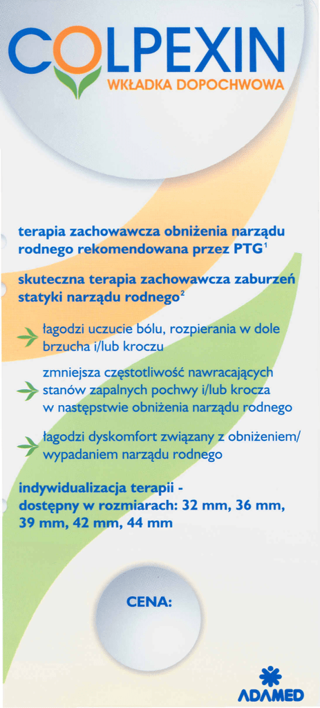 c " LPEXIN WKŁADKA DOPOCHWOWA terapia zachowawcza obniżenia narządu rodnego rekomendowana przez PTG 1 skuteczna terapia zachowawcza statyki narządu rodnego2 zaburzeń łagodzi uczucie bólu, rozpierania w dole brzucha i/lub kroczu ~ zmniejsza częstotliwość nawracających stanów zapalnych pochwy i/lub krocza w następstwie obniżenia narządu rodnego łagodzi dyskomfort związany z obniżeniem/ wypadaniem narządu rodnego indywidualizacja terapii dostępny w rozmiarach: 32 mm, 36 mm, 39 mm, 42 mm, 44 mm - ADAMED C lPEXIN ~, WKŁADKA DOPOCHWOWA Skrócona inlormacja o produkcie: Colpexin to wkładka dopochwowa przeznaczona do leczenia wypadania narządów miednicy mniejszej oraz do wspomagania ćwiczeń mięśni dna miednicy mniejszej. Wkładka wykonana jest z poliwęglanowego tworzywa sztucznego o medycznym stopniu czystości i dostępna jest w sześciu rozmiarach: 28 mm, 32 mm, 36 mm, 39 mm, 42 mm i 44 mm. Wkładka dopochwowa Colpexin jest symetrycznie kulista z przytwierdzonym sznurkiem z plecionego nylonu umożliwiającym łatwe wyjęcie. Wskazania: Colpexin jest wkładką dopochwową przeznaczoną do zachowawczego narządów miednicy mniejszej i osłabienia mięśni dna miednicy mniejszej. leczenia wypadania Przeciwskazania: Pacjentki nie powinny używać wkładki dopochwowej Colpexin w następujących wypadkach: • inIekcji pochwy,laceracji lub nieprawidłowego krwawienia pochwowego/macicznego • niedawno przebytego zabiegu chirurgicznego w obrębie pochwy • ciężkiej neuropatii w obrębie miednicy z utratą czucia w obszarze krocza • klinicznie jawnego zapalenia narządów miednicy mniejszej, endometriozy, guza przydatków, izolowanej retrocele 4 stopnia lub tyłopochylenia macicy • ciąży • stosowania wkładki wewnątrzmacicznej • podczas stosunku płciowego • podczas miesiączki Oslrzeżenia: Pacjentki powinny natychmiast zgłaszać jakiekolwiek zmiany w barwie, ilości, woni lub konsystencji upławów z pochwy V1ubkrwawienia, dyskomfort, pieczenie przy oddawaniu moczu Vlub świąd pochwy. Stosowanie wkładki dopchwowej Colpexin u kobiet z atrofią pochwy może powodować nadżerki i owrzodzenia. Lekarz przepisujący Colpexin powinien rozważyć miejscową suplementację estrogenu lub środek nawilżający na bazie wody u pacjentek z atrofią pochwy, jeżeli jestto konieczne. Środki ostrożności: Wkładka dopochwowa Colpexin nie powinna być noszona bez przerwy przez ponad 24 godziny, bez wyjmowania i odpowiedniego czyszczenia wkładki. Działania niepożądane: Najczęstszymi działaniami niepożądanymi, które zgłaszały pacjentki podczas badań klinicznych, były: tkliwość pochwy, pieczenie, podrażnienie, dyskomfort, plamienia, infekcja drożdżakami, owrzodzenia, dolegliwości ze strony cewki moczowej i przy oddawaniu moczu, zakażenia dróg moczowych i zaparcia. Większość działań niepożądanych była łagodna i przejściowa. Rozmiar wkładki dobiera lekarz. Przed zastosowaniem należy zapoznać się z instrukcją użytkowania i higieny wkładki, kłóre znajdują się w ulotce dołączonej do opakowania. 1. Rekomendacje PTG w sprawie diagnostyki i leczenia nietrzymania moczu u kobiet. GpD wydanie specjalne, wrzesień 2006. 2. Safety and effectiveness ol Colpexin Sphere in the treatment of pelvic organ prolapse. Lukban JC, Aguirre DA, Davila GW, Sand PK. IntUrogynecol J Pelvic Floor Dysfunct. 2006 Sep; 17 (5) :449-54. Epub 2005 Nov 19. Pełna informacja o wyrobie medycznym dostępna jest w Adamed Sp. z 0.0., Pieńków 149, 05-152 Czosnów k/Warszawy. ... Adamed Sp. z 0.0. •• Pieńków 149, 05-152 Czosnów klWarszawy ..•.. tel.: (22) 751 85 17, e-mail: [email protected], www.adamed.com.pII\DAMED I x u