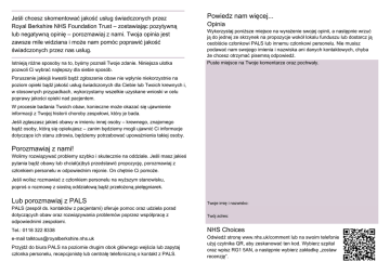 Jeśli chcesz skomentować jakość usług świadczonych przez Royal Berkshire NHS Foundation Trust – zostawiając pozytywną lub negatywną opinię – porozmawiaj z nami. Twoja opinia jest zawsze mile widziana i może nam pomóc poprawić jakość świadczonych przez nas usług. Istnieją różne sposoby na to, byśmy poznali Twoje zdanie. Niniejsza ulotka pozwoli Ci wybrać najlepszy dla siebie sposób. Poruszenie jakiejś kwestii bądź zgłoszenie obaw nie wpłynie niekorzystnie na poziom opieki bądź jakość usług świadczonych dla Ciebie lub Twoich krewnych i, w stosownych przypadkach, wykorzystamy wszelkie uzyskane wnioski w celu poprawy jakości opieki nad pacjentem. W procesie badania Twoich obaw, konieczne może okazać się ujawnienie informacji z Twojej historii choroby zespołowi, który je bada. Powiedz nam więcej... Opinia Wykorzystaj poniższe miejsce na wyrażenie swojej opinii, a następnie wrzuć ją do jednej ze skrzynek na propozycje wokół lokalu funduszu lub dostarcz ją osobiście członkowi PALS lub innemu członkowi personelu. Nie musisz podawać nam swojego imienia i nazwiska ani danych kontaktowych, chyba że chcesz otrzymać pisemną odpowiedź. Puste miejsce na Twoje komentarze oraz pochwały. Jeśli zgłaszasz jakieś obawy w imieniu innej osoby – krewnego, znajomego bądź osoby, którą się opiekujesz – zanim będziemy mogli ujawnić Ci informacje dotyczące ich stanu zdrowia, będziemy potrzebować upoważnienia takiej osoby. Porozmawiaj z nami! Wolimy rozwiązywać problemy szybko i skutecznie na oddziale. Jeśli masz jakieś pytania bądź obawy lub chciał(a)byś przedstawić propozycję, porozmawiaj z członkiem personelu w odpowiednim rejonie. On chętnie Ci pomoże. Jeśli wolisz rozmawiać z członkiem personelu na wyższym stanowisku, poproś o rozmowę z siostrą oddziałową bądź przełożoną pielęgniarek. Lub porozmawiaj z PALS PALS (zespół ds. kontaktów z pacjentami) oferuje pomoc oraz udziela porad dotyczących obaw oraz rozwiązywania problemów poprzez współpracę z odpowiednimi zespołami. Twoje imię i nazwisko: Twój adres: Tel.: 0118 322 8338 NHS Choices e-mail [email protected] Odwiedź stronę www.nhs.uk/comment lub na swoim telefonie użyj czytnika QR, aby zeskanować ten kod. Wybierz szpital oraz wpisz RG1 5AN, a następnie wybierz zakładkę „zostaw recenzję”. Przyjdź do biura PALS na poziomie drugim obok głównego wejścia lub zapytaj członka personelu, recepcjonistę lub centralę telefoniczną o kontakt z PALS. Jeśli chciał(a)byś złożyć oficjalną skargę Jeśli po rozmowie z personelem oddziałowym lub członkiem PALS stwierdzisz, że masz problem, którego nie da się rozwiązać w sposób nieformalny bądź na poziomie lokalnym, prosimy o pismo do działu Patient Relations, w którym przedstawisz dokładne szczegóły problemu, który mielibyśmy zbadać. Zachęcanie pacjentów oraz społeczeństwa do wyrażania opinii Napisz do nas lub wyślij wiadomość e-mail: Dział Patient Relations Royal Berkshire NHS Foundation Trust London Road Reading RG1 5AN [email protected] Fundusz posiada swoje procedury dotyczące postępowania z oficjalnymi skargami oparte o krajowe regulacje rządowe. Więcej informacji znajduje się na stronie www.gov.uk. Wszystkie skargi są traktowane poważnie i dokładnie badane. Jeśli oczekujesz wsparcia Istnieją organizacje, które mogą Ci pomóc w złożeniu skargi, w zależności od tego, jakim władzom lokalnym podlegasz. Jeśli nie masz pewności, możesz to u nas sprawdzić. Jeśli jesteś mieszkańcem podlegającym Radzie rejonu Reading, prosimy o kontakt z: Jeśli nie jesteś mieszkańcem podlegającym Radzie rejonu Reading, prosimy o kontakt z: Healthwatch Reading 3. piętro, biblioteka główna w Reading Abbey Square Reading RG1 3BQ Tel: 0118 937 2295 Adres e-mail: [email protected] SEAP Hastings 7. piętro, Cavendish House Breeds Place Hastings TN34 3AA Tel: 0330 440 9000 Faks: 01424 204687 Adres e-mail: [email protected] Informacje dla pacjenta, kwiecień 2016 Porozmawiaj z nami Z kim należy się kontaktować w przypadku uwag, problemów lub obaw