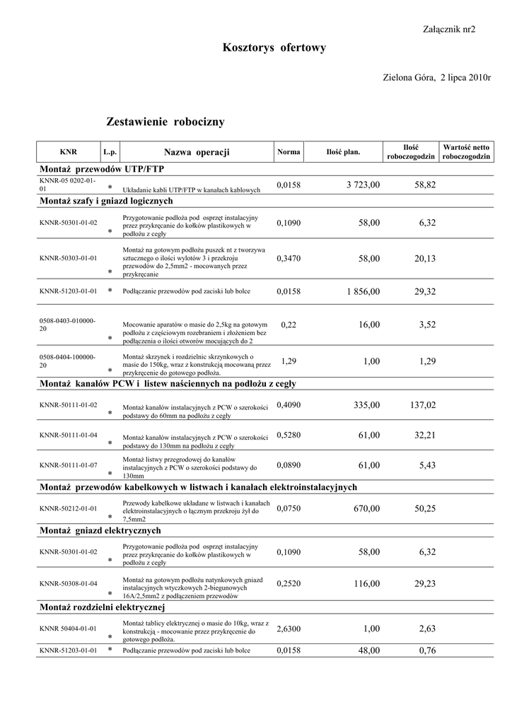 Załącznik nr2 Kosztorys ofertowy Zielona Góra, 2 lipca 2010r Zestawienie robocizny KNR Nazwa operacji L.p. Norma Ilość Wartość netto roboczogodzin roboczogodzin Ilość plan. Montaż przewodów UTP/FTP KNNR-05 0202-0101 * Układanie kabli UTP/FTP w kanałach kablowych Montaż szafy i gniazd logicznych * Przygotowanie podłoża pod osprzęt instalacyjny przez przykręcanie do kołków plastikowych w podłożu z cegły * Montaż na gotowym podłożu puszek nt z tworzywa sztucznego o ilości wylotów 3 i przekroju przewodów do 2,5mm2 - mocowanych przez przykręcanie * Podłączanie przewodów pod zaciski lub bolce * Mocowanie aparatów o masie do 2,5kg na gotowym podłożu z częściowym rozebraniem i złożeniem bez podłączenia o ilości otworów mocujących do 2 KNNR-50301-01-02 KNNR-50303-01-01 KNNR-51203-01-01 0508-0403-01000020 Montaż skrzynek i rozdzielnic skrzynkowych o masie do 150kg, wraz z konstrukcją mocowaną przez przykręcenie do gotowego podłoża. 0508-0404-10000020 0,0158 3 723,00 58,82 0,1090 58,00 6,32 0,3470 58,00 20,13 0,0158 1 856,00 29,32 0,22 16,00 3,52 1,29 1,00 1,29 * Montaż kanałów PCW i listew naściennych na podłożu z cegły Montaż kanałów instalacyjnych z PCW o szerokości podstawy do 60mm na podłożu z cegły 0,4090 335,00 137,02 * Montaż kanałów instalacyjnych z PCW o szerokości podstawy do 130mm na podłożu z cegły 0,5280 61,00 32,21 * Montaż listwy przegrodowej do kanałów instalacyjnych z PCW o szerokości podstawy do 130mm 0,0890 61,00 5,43 Przewody kabelkowe układane w listwach i kanałach elektroinstalacyjnych o łącznym przekroju żył do 7,5mm2 0,0750 670,00 50,25 Przygotowanie podłoża pod osprzęt instalacyjny przez przykręcanie do kołków plastikowych w podłożu z cegły 0,1090 58,00 6,32 0,2520 116,00 29,23 Montaż tablicy elektrycznej o masie do 10kg, wraz z konstrukcją - mocowanie przez przykręcenie do gotowego podłoża. 2,6300 1,00 2,63 Podłączanie przewodów pod zaciski lub bolce 0,0158 48,00 0,76 KNNR-50111-01-02 KNNR-50111-01-04 KNNR-50111-01-07 * Montaż przewodów kabelkowych w listwach i kanałach elektroinstalacyjnych KNNR-50212-01-01 * Montaż gniazd elektrycznych KNNR-50301-01-02 * Montaż na gotowym podłożu natynkowych gniazd instalacyjnych wtyczkowych 2-biegunowych 16A/2,5mm2 z podłączeniem przewodów KNNR-50308-01-04 * Montaż rozdzielni elektrycznej KNNR 50404-01-01 KNNR-51203-01-01 * * Z E T O-Zielona Góra sp. z o.o. 65-021 Zielona Góra ul. Dąbrowskiego 25 0508-0403-01000020 tel. 068 4512-512, fax 068 4512-577 0,22 24,00 5,27 1,5000 8,00 12,00 * Mechaniczne przebijanie otworów w ścianach lub stropach z cegły o długości przebicia do 2 1/2 cegieł i średnicy do 40mm 1,9900 8,00 15,92 * Mechaniczne przebijanie otworów w ścianach lub stropach z cegły o długości przebicia do 2 1/2 cegieł i średnicy do 80mm 2,1300 6,00 12,78 * Mechaniczne przebijanie otworów w ścianach lub stropach z cegły o długości przebicia do 2 1/2 cegieł i średnicy do 100mm * Sprawdzenie i pomiary obwodów sygnalizacji ( wykonanie pomiarów skrętki UTP lub FTP ) 0,3400 115,00 39,10 * Sprawdzenie i pomiar obwodu elektrycznego niskiego napięcia o ilości faz 1 1,3000 14,00 18,20 * Sprawdzenie i pomiar obwodu elektrycznego niskiego napięcia o ilości faz 3 1,7600 2,00 3,52 * Pomiar rezystancji izolacji instalacji elektrycznej o ilości faz 1 pomiar pierwszy 0,6300 1,00 0,63 Pomiar rezystancji izolacji instalacji elektrycznej o ilości faz 1 pomiar każdy następny 0,4200 13,00 5,46 * * Pomiar rezystancji izolacji instalacji elektrycznej o ilości faz 3 pomiar pierwszy 0,8300 1,00 0,83 Pomiar rezystancji izolacji instalacji elektrycznej o ilości faz 3 pomiar każdy następny 0,5800 1,00 0,58 * * Badanie i pomiar skuteczności zerowania pomiar pierwszy 0,5000 1,00 0,50 * Badanie i pomiar skuteczności zerowania pomiar każdy następny 0,2800 114,00 31,92 * Wykonanie próby działania wyłącznika różnicowoprądowego próba pierwsza 0,3300 1,00 0,33 Wykonanie próby działania wyłącznika różnicowoprądowego próba następna 0,2700 7,00 1,89 Sprawdzenie stanu izolacji induktorem 0,0368 115,00 4,23 Razem robocizna w roboczogodzinach i wartość netto : 536,41 Mocowanie aparatów o masie do 2,5kg na gotowym podłożu z częściowym rozebraniem i złożeniem bez podłączenia o ilości otworów mocujących do 2 * Przebicia przez ściany i stropy KNNR 51209-02-08 KNNR 51209-04-08 KNNR 51209-05-08 Pomiary KNNR 51307-01-01 KNNR 51301-01-01 KNNR 51301-01-02 KNNR 51303-01-01 KNNR 51303-01-02 KNNR 51303-01-03 KNNR 51303-01-04 KNNR 51304-01-05 KNNR 51304-01-06 KNNR 51305-01-01 KNNR 51305-01-02 KNR 4-03-1201-01 * * Projekt modernizacji Sieci Komputerowej w Powiatowym Urzędzie Pracy w Lubsku zł Strona 1 Z E T O-Zielona Góra sp. z o.o. 65-021 Zielona Góra ul. Dąbrowskiego 25 tel. 068 4512-512, fax 068 4512-577 Zestawienie robocizny materiałów demontowanych KNR L.p. Nazwa operacji Norma Ilość roboczogodzin Ilość plan. Wartość netto roboczogodzin Demontaż gniazd elektrycznych KNNR-90402-0105 Demontaż gniazd wtykowych nieuszczelnionych z odłączeniem przewodów KNNR-90206-0105 Demontaż tablic rozdzielczych z osprzętem KNNR-90305-0105 Demontaż przewodów o łącznym przekroju 0,03 Demontaż kanałów o szerokości podstawy do 60mm 0,21 KNNR-90310-2007 Demontaż kanałów o szerokości podstawy 0,28 KNNR-90206-0105 Demontaż tablic rozdzielczych z osprzętem * Demontaż tablic bezpiecznikowych i licznikowych 86,00 0,17 0,90 1,00 * modułowym - 2 rzędowe Demontaż przewodów kabelkowych układanych w kanałów instalacyjnych * żył do 12,5mm Demontaż kanałów instalacyjnych z PCW KNNR-90310-2006 * * do 130mm Demontaż szafy logicznej wiszącej 14,88 0,90 75,94 2260,00 250,00 10,00 0,90 1,00 * modułowym - 2 rzędowe Razem robocizna prac demontażowych w roboczogodzinach i wartość netto : Projekt modernizacji Sieci Komputerowej w Powiatowym Urzędzie Pracy w Lubsku 52,50 2,79 0,90 147,90 zł