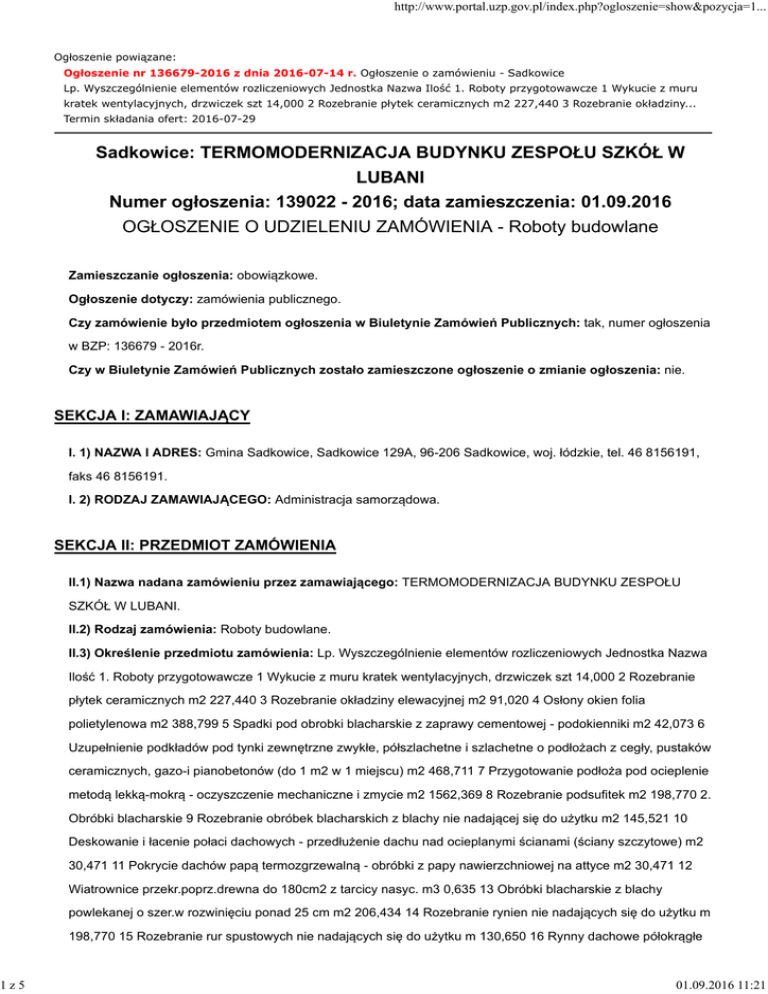 http://www.portal.uzp.gov.pl/index.php?ogloszenie=show&pozycja=1... Ogłoszenie powiązane: Ogłoszenie nr 136679-2016 z dnia 2016-07-14 r. Ogłoszenie o zamówieniu - Sadkowice Lp. Wyszczególnienie elementów rozliczeniowych Jednostka Nazwa Ilość 1. Roboty przygotowawcze 1 Wykucie z muru kratek wentylacyjnych, drzwiczek szt 14,000 2 Rozebranie płytek ceramicznych m2 227,440 3 Rozebranie okładziny... Termin składania ofert: 2016-07-29 Sadkowice: TERMOMODERNIZACJA BUDYNKU ZESPOŁU SZKÓŁ W LUBANI Numer ogłoszenia: 139022 - 2016; data zamieszczenia: 01.09.2016 OGŁOSZENIE O UDZIELENIU ZAMÓWIENIA - Roboty budowlane Zamieszczanie ogłoszenia: obowiązkowe. Ogłoszenie dotyczy: zamówienia publicznego. Czy zamówienie było przedmiotem ogłoszenia w Biuletynie Zamówień Publicznych: tak, numer ogłoszenia w BZP: 136679 - 2016r. Czy w Biuletynie Zamówień Publicznych zostało zamieszczone ogłoszenie o zmianie ogłoszenia: nie. SEKCJA I: ZAMAWIAJĄCY I. 1) NAZWA I ADRES: Gmina Sadkowice, Sadkowice 129A, 96-206 Sadkowice, woj. łódzkie, tel. 46 8156191, faks 46 8156191. I. 2) RODZAJ ZAMAWIAJĄCEGO: Administracja samorządowa. SEKCJA II: PRZEDMIOT ZAMÓWIENIA II.1) Nazwa nadana zamówieniu przez zamawiającego: TERMOMODERNIZACJA BUDYNKU ZESPOŁU SZKÓŁ W LUBANI. II.2) Rodzaj zamówienia: Roboty budowlane. II.3) Określenie przedmiotu zamówienia: Lp. Wyszczególnienie elementów rozliczeniowych Jednostka Nazwa Ilość 1. Roboty przygotowawcze 1 Wykucie z muru kratek wentylacyjnych, drzwiczek szt 14,000 2 Rozebranie płytek ceramicznych m2 227,440 3 Rozebranie okładziny elewacyjnej m2 91,020 4 Osłony okien folia polietylenowa m2 388,799 5 Spadki pod obrobki blacharskie z zaprawy cementowej - podokienniki m2 42,073 6 Uzupełnienie podkładów pod tynki zewnętrzne zwykłe, półszlachetne i szlachetne o podłożach z cegły, pustaków ceramicznych, gazo-i pianobetonów (do 1 m2 w 1 miejscu) m2 468,711 7 Przygotowanie podłoża pod ocieplenie metodą lekką-mokrą - oczyszczenie mechaniczne i zmycie m2 1562,369 8 Rozebranie podsufitek m2 198,770 2. Obróbki blacharskie 9 Rozebranie obróbek blacharskich z blachy nie nadającej się do użytku m2 145,521 10 Deskowanie i łacenie połaci dachowych - przedłużenie dachu nad ocieplanymi ścianami (ściany szczytowe) m2 30,471 11 Pokrycie dachów papą termozgrzewalną - obróbki z papy nawierzchniowej na attyce m2 30,471 12 Wiatrownice przekr.poprz.drewna do 180cm2 z tarcicy nasyc. m3 0,635 13 Obróbki blacharskie z blachy powlekanej o szer.w rozwinięciu ponad 25 cm m2 206,434 14 Rozebranie rynien nie nadających się do użytku m 198,770 15 Rozebranie rur spustowych nie nadających się do użytku m 130,650 16 Rynny dachowe półokrągłe 1z5 01.09.2016 11:21 http://www.portal.uzp.gov.pl/index.php?ogloszenie=show&pozycja=1... o śr. 10 cm - montaż z gotowych elementów z blachy stalowej ocynkowanej powlekanej m 198,770 17 Zbiorniczki przy rynnach z blachy ocynkowanej, powlekanej - montaż z gotowych elementów szt 22,000 18 Rury spustowe okrągłe o śr. 15 cm - montaż z gotowych elementów z blachy stalowej ocynkowanej i blachy z cynku m 130,650 3. Ocieplenie ścian zewnętrznych 3.1 Ściany - styropian 19 Przyklejenie płyt styropianowych EPS 70-040 o grubości 12 cm na ścianach betonowych, tynkowanych lub z mozaiki szklanej m2 1146,054 20 Przyklejenie płyt styropianowych o grubości 3 cm na ościeżach betonowych, tynkowanych lub z mozaiki szklanej m2 157,272 21 Przymocowanie płyt styropianowych za pomocą kołków plastikowych w ilości 5 szt./m2 do podłoża m2 1146,054 22 Przymocowanie płyt styropianowych za pomocą kołków plastikowych do podłoża z betonu - dodatek za każdy dodatkowy kołek szt 1146,054 23 Wykonanie dylatacji przez montaż profilu dylatacyjnego m 8,400 24 Zatapianie jednej warstwy siatki na ścianach i słupach. m2 1146,054 25 Zatapianie jednej warstwy siatki na ościeżach. m2 157,272 26 Montaż taśmy rozprężnej uszczelniającej gr=2mm m 524,240 27 Ochrona narożników wypukłych narożnikiem aluminiowym z siatką zbrojącą m 589,240 28 Dodatkowa warstwa siatki na parterze m2 220,000 29 Wykonanie ręczne cienkowarstwowej wyprawy z tynku mineralnego o fakturze kamyczkowej Gruntowanie podłoża - pierwsza warstwa. m2 1303,326 30 Wykonanie ręczne cienkowarstwowej wyprawy z tynku mineralnego o fakturze kamyczkowej na gotowym podłożu na ścianach płaskich i powierzchniach poziomych (ziarno 1,5 mm). m2 1303,326 31 Dwukrotne malowanie tynków fakturowych farbą nanosilikonową. m2 1303,326 32 Drzwiczki i kratki, osadzone w ścianach o powierzchni elementu do 0,1 m2 szt 14,000 33 Wykonanie podsufitki z paneli PCV m2 198,770 3.2 Remont cokołu 34 Wykopy o ścianach pionowych przy odkrywaniu odcinkami istniejących fundamentów o głębokości do 1.5 m w gruncie kat. IV m3 36,632 35 Skucie nierówności i oczyszczenie podłoża. m2 228,965 36 Przygotowanie podłoża pod izolacje mineralne - ręczne wykonanie warstwy wyrównawczej 5 mm zaprawą wyrównującą m2 228,965 37 Izolacje przeciwwilgociowe i przeciwwodne. Gruntowanie podłoża nienasiąkliwego m2 228,965 38 Ocieplenie fundamentów budynku płytami styropianowymi XPS 300 gr 6 cm przy użyciu masy bitumicznej m2 228,965 39 Izolacja przeciwwilgociowa folią kubełkową 0,5 mm m2 97,684 40 Ocieplenie ścian budynków płytami styropianowymi metodą lekką-mokrą przy użyciu gotowych zapraw klejących - przyklejenie jednej warstwy siatki na ścianach m2 228,965 41 Zasypanie wykopów ziemią z ukopów z przerzutem ziemi na odległość do 3 m i ubiciem warstwami co 15 cm w gruncie kat. IV m3 36,632 3.3 Wykończenie cokołu tynkiem mozaikowym 42 Wyprawa elewacyjna z tynku mozaikowego - nałożenie na podłoże farby gruntującej - pierwsza warstwa m2 152,310 43 Wyprawa elewacyjna cienkowarstwowa z tynku mozaikowego nanoszonego ręcznie m2 152,310 4. Wymiana okien 44 Wykucie z muru ościeżnic stalowych lub krat drzwiowych o pow. ponad2 m2 m2 389,191