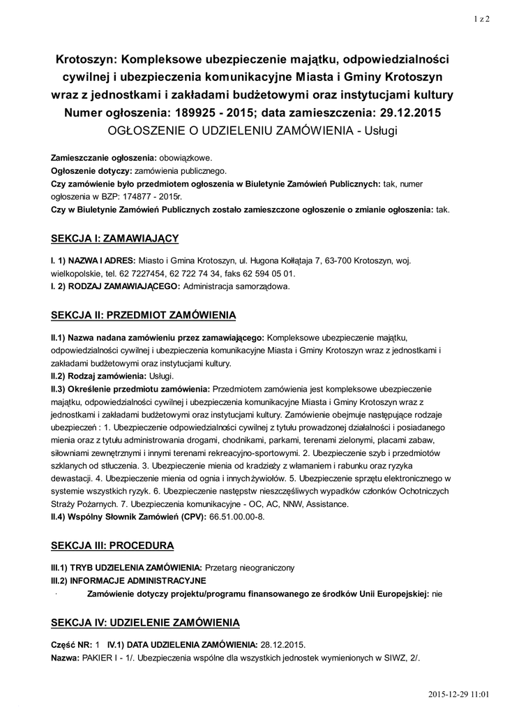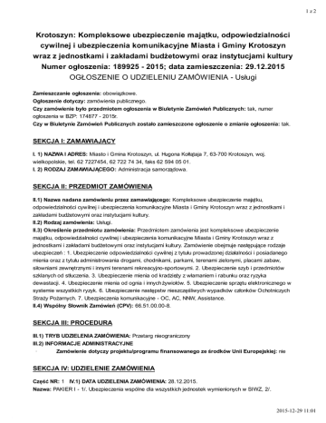 1z2 Krotoszyn: Kompleksowe ubezpieczenie majątku, odpowiedzialności cywilnej i ubezpieczenia komunikacyjne Miasta i Gminy Krotoszyn wraz z jednostkami i zakładami budżetowymi oraz instytucjami kultury Numer ogłoszenia: 189925 - 2015; data zamieszczenia: 29.12.2015 OGŁOSZENIE O UDZIELENIU ZAMÓWIENIA - Usługi Zamieszczanie ogłoszenia: obowiązkowe. Ogłoszenie dotyczy: zamówienia publicznego. Czy zamówienie było przedmiotem ogłoszenia w Biuletynie Zamówień Publicznych: tak, numer ogłoszenia w BZP: 174877 - 2015r. Czy w Biuletynie Zamówień Publicznych zostało zamieszczone ogłoszenie o zmianie ogłoszenia: tak. SEKCJA I: ZAMAWIAJĄCY I. 1) NAZWA I ADRES: Miasto i Gmina Krotoszyn, ul. Hugona Kołłątaja 7, 63-700 Krotoszyn, woj. wielkopolskie, tel. 62 7227454, 62 722 74 34, faks 62 594 05 01. I. 2) RODZAJ ZAMAWIAJĄCEGO: Administracja samorządowa. SEKCJA II: PRZEDMIOT ZAMÓWIENIA II.1) Nazwa nadana zamówieniu przez zamawiającego: Kompleksowe ubezpieczenie majątku, odpowiedzialności cywilnej i ubezpieczenia komunikacyjne Miasta i Gminy Krotoszyn wraz z jednostkami i zakładami budżetowymi oraz instytucjami kultury. II.2) Rodzaj zamówienia: Usługi. II.3) Określenie przedmiotu zamówienia: Przedmiotem zamówienia jest kompleksowe ubezpieczenie majątku, odpowiedzialności cywilnej i ubezpieczenia komunikacyjne Miasta i Gminy Krotoszyn wraz z jednostkami i zakładami budżetowymi oraz instytucjami kultury. Zamówienie obejmuje następujące rodzaje ubezpieczeń : 1. Ubezpieczenie odpowiedzialności cywilnej z tytułu prowadzonej działalności i posiadanego mienia oraz z tytułu administrowania drogami, chodnikami, parkami, terenami zielonymi, placami zabaw, siłowniami zewnętrznymi i innymi terenami rekreacyjno-sportowymi. 2. Ubezpieczenie szyb i przedmiotów szklanych od stłuczenia. 3. Ubezpieczenie mienia od kradzieży z włamaniem i rabunku oraz ryzyka dewastacji. 4. Ubezpieczenie mienia od ognia i innych żywiołów. 5. Ubezpieczenie sprzętu elektronicznego w systemie wszystkich ryzyk. 6. Ubezpieczenie następstw nieszczęśliwych wypadków członków Ochotniczych Straży Pożarnych. 7. Ubezpieczenia komunikacyjne - OC, AC, NNW, Assistance. II.4) Wspólny Słownik Zamówień (CPV): 66.51.00.00-8. SEKCJA III: PROCEDURA III.1) TRYB UDZIELENIA ZAMÓWIENIA: Przetarg nieograniczony III.2) INFORMACJE ADMINISTRACYJNE · Zamówienie dotyczy projektu/programu finansowanego ze środków Unii Europejskiej: nie SEKCJA IV: UDZIELENIE ZAMÓWIENIA Część NR: 1 IV.1) DATA UDZIELENIA ZAMÓWIENIA: 28.12.2015. Nazwa: PAKIER I - 1/. Ubezpieczenia wspólne dla wszystkich jednostek wymienionych w SIWZ, 2/. 2015-12-29 11:01 2z2 Ubezpieczenia dla poszczególnych jednostek wymienionych w SIWZ IV.2) LICZBA OTRZYMANYCH OFERT: 2. IV.3) LICZBA ODRZUCONYCH OFERT: 0. IV.4) NAZWA I ADRES WYKONAWCY, KTÓREMU UDZIELONO ZAMÓWIENIA: Towarzystwo Ubezpieczeń INTER Polska S.A. Oddział we Wrocławiu, ul. Kazimierza Wielkiego 45, 50-077 Wrocław, kraj/woj. dolnośląskie. IV.5) Szacunkowa wartość zamówienia (bez VAT): 425000,00 PLN. IV.6) INFORMACJA O CENIE WYBRANEJ OFERTY ORAZ O OFERTACH Z NAJNIŻSZĄ I NAJWYŻSZĄ CENĄ · · Cena wybranej oferty: 269520,00 · Oferta z najniższą ceną: 269520,00 / Oferta z najwyższą ceną: 342308,00 · Waluta: PLN . Część NR: 2 Nazwa: PAKIET II: Ubezpieczenia komunikacyjne - OC, AC, NNW, Assistance.. IV.1) DATA UDZIELENIA ZAMÓWIENIA: 28.12.2015. IV.2) LICZBA OTRZYMANYCH OFERT: 3. IV.3) LICZBA ODRZUCONYCH OFERT: 0. IV.4) NAZWA I ADRES WYKONAWCY, KTÓREMU UDZIELONO ZAMÓWIENIA: CONCORDIA POLSKA Towarzystwo Ubezpieczeń Wzajemnych Oddział Katowice, ul. mickiewicza 29, 40-923 Katowice, kraj/woj. śląskie. IV.5) Szacunkowa wartość zamówienia (bez VAT): 200000,00 PLN. IV.6) INFORMACJA O CENIE WYBRANEJ OFERTY ORAZ O OFERTACH Z NAJNIŻSZĄ I NAJWYŻSZĄ CENĄ · · Cena wybranej oferty: 136608,00 · Oferta z najniższą ceną: 136608,00 / Oferta z najwyższą ceną: 192812,00 · Waluta: PLN . Ogłoszenie zostało zamieszczone w BZP dnia 29.12.2015 r. 2015-12-29 11:01