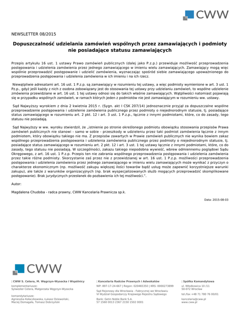 NEWSLETTER 08/2015 Dopuszczalność udzielania zamówień wspólnych przez zamawiających i podmioty nie posiadające statusu zamawiających Przepis artykułu 16 ust. 1 ustawy Prawo zamówień publicznych (dalej jako P.z.p.) przewiduje możliwość przeprowadzenia postępowania i udzielenia zamówienia przez jednego zamawiającego w imieniu wielu zamawiających. Zamawiający mogą więc wspólnie przeprowadzić postępowanie i udzielić zamówienia, wyznaczając spośród siebie zamawiającego upoważnionego do przeprowadzenia postępowania i udzielenia zamówienia w ich imieniu i na ich rzecz. Niewątpliwie adresatami art. 16 ust. 1 P.z.p. są zamawiający w rozumieniu tej ustawy, a więc podmioty wymienione w art. 3 ust. 1 Pz.p., gdyż jeśli każdy z nich z osobna zobowiązany jest do stosowania tej ustawy przy udzielaniu zamówień, to wspólne udzielenie zmówienia przewidziane w art. 16 ust. 1 tej ustawy odnosi się do takich właśnie zamawiających. Wątpliwości natomiast pojawiają się w przypadku wspólnych zamówień, w ramach których jeden z podmiotów nie jest zamawiającym w rozumieniu ww. ustawy. Sąd Najwyższy wyrokiem z dnia 2 kwietnia 2015 r. (Sygn. akt I CSK 207/14) jednoznacznie przyjął za dopuszczalne wspólne przeprowadzenie postępowania i udzielenie zamówienia publicznego przez podmioty o niejednorodnym statusie, tj. posiadające status zamawiającego w rozumieniu art. 2 pkt. 12 i art. 3 ust. 1 P.z.p., łącznie z innymi podmiotami, które, co do zasady, tego statusu nie posiadają. Sąd Najwyższy w ww. wyroku stwierdził, że „istnienie po stronie określonego podmiotu obowiązku stosowania przepisów Prawa zamówień publicznych nie stanowi - samo w sobie - przeszkody w udzieleniu przez taki podmiot zamówienia łącznie z innym podmiotem, który obowiązku takiego nie ma. Z przepisów zawartych w Prawie zamówień publicznych nie wynika bowiem zakaz wspólnego przeprowadzenia postępowania i udzielenia zamówienia publicznego przez podmioty o niejednorodnym statusie, tj. posiadające status zamawiającego w rozumieniu art. 2 pkt. 12 i art. 3 ust. 1 tej ustawy łącznie z innymi podmiotami, które, co do zasady, tego statusu nie posiadają. W szczególności, zakazu takiego niepodobna wywieść, wbrew odmiennemu poglądowi Sądu Okręgowego, z art. 16 ust. 1 P.z.p. Przepis ten nie zabrania wspólnego przeprowadzenia postępowania i udzielenia zamówienia przez takie różne podmioty. Skorzystanie zaś przez nie z przewidzianej w art. 16 ust. 1 P.z.p. możliwości przeprowadzenia postępowania i udzielenia zamówienia przez jednego zamawiającego w imieniu wielu zamawiających może wynikać z przyczyn o charakterze ekonomicznym (np. możliwość zakupu większej ilości towarów bądź usług może zapewnić korzystniejsze warunki zakupu), ale także z warunków organizacyjnych (np. brak wyspecjalizowanych służb mogących przeprowadzić skomplikowane postępowanie). Brak jurydycznych przesłanek do pozbawienia ich tej możliwości.”. Autor: Magdalena Chudoba - radca prawny, CWW Kancelaria Prawnicza sp.k. Data: 2015-08-03 | CWW S. Cetera, M. Węgrzyn-Wysocka i Wspólnicy | Kancelaria Radców Prawnych i Adwokatów | Spółka Komandytowa komplementariusze: Sylwester Cetera, Małgorzata Węgrzyn-Wysocka NIP: 897-17-24-667 | Regon: 020465350 | KRS: 0000273899 ul. Włodkowica 10 /11 50-072 Wrocław komandytariusze: Agnieszka Kołaczkowska, Łukasz Dziewoński, Maciej Domagała, Tomasz Dobrzyński Sąd Rejonowy dla Wrocławia - Fabrycznej we Wrocławiu VI Wydział Gospodarczy Krajowego Rejestru Sądowego Bank: Getin Noble Bank S.A. 57 1560 0013 2367 2150 1502 0001 tel./fax +48 71 780 76 00/01 [email protected] www.cww.pl