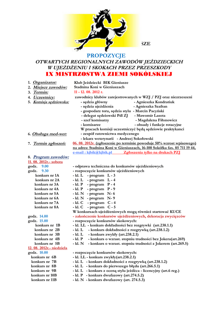 KJ BIK GIENIUSZE PROPOZYCJE OTWARTYCH REGIONALNYCH ZAWODÓW JEŹDZIECKICH W UJEŻDŻENIU I SKOKACH PRZEZ PRZESZKODY IX MISTRZOSTWA ZIEMI SOKÓLSKIEJ 1. 2. 3. 4. 5. Organizator: Miejsce zawodów: Termin: Uczestnicy: Klub Jeździecki BIK Gieniusze Stadnina Koni w Gieniuszach 11 - 12. 08. 2012 r. zawodnicy klubów zarejestrowanych w WZJ / PZJ oraz niezrzeszeni Komisja sędziowska: - sędzia główny - Agnieszka Kondratiuk - sędzia ujeżdżenia - Agnieszka Szafran - gospodarz toru, sędzia stylu - Marcin Pacyński - delegat sędziowski Pdl ZJ - Sławomir Lasota - szef komisarzy - Magdalena Fiłonowicz - komisarze - obsady i funkcje rotacyjne W pracach komisji uczestniczyć będą sędziowie praktykanci - zespół ratownictwa medycznego 6. Obsługa med-wet: - lekarz weterynarii - Andrzej Sokołowski 06. 08. 2012r. (zgłoszenie po terminie powoduje 50% wzrost wpisowego) 7. Termin zgłoszeń: na adres: Stadnina Koni w Gieniuszach, 16-100 Sokółka fax. 85 711 19 44, e-mail : [email protected] Zgłoszenia tylko na drukach PZJ 8. Program zawodów: 11. 08. 2012r.- sobota godz. 9.00 - odprawa techniczna do konkursów ujeżdżeniowych godz. 9.30 - rozpoczęcie konkursów ujeżdżeniowych konkurs nr 1A - kl. L - program L - 3 konkurs nr 2A - kl. L - program L - 4 konkurs nr 3A - kl. P - program P - 4 konkurs nr 4A - kl. P - program P - 9 konkurs nr 5A - kl. N - program N- 6 konkurs nr 6A - kl. N - program N- 9 konkurs nr 7A - kl. C - program C - 4 konkurs nr 8A - kl. C - program C - 5 W konkursach ujeżdżeniowych mogą również startować KUCE godz. 14.00 - zakończenie konkursów ujeżdżeniowych, dekoracja zwycięzców godz. 15.00 - rozpoczęcie konkursów skokowych: konkurs nr 1B - kl. LL - konkurs dokładności bez rozgrywki (art.238.1.1) konkurs nr 2B - kl. L - konkurs dokładności z rozgrywką (art.238.1.2) konkurs nr 3B - kl. L - konkurs zwykły (art.238.2.1) konkurs nr 4B - kl. P - konkurs o wzrast. stopniu trudności bez Jokera(art.269) konkurs nr 5B - kl. N - konkurs o wzrast. stopniu trudności z Jokerem (art.269.5) 12. 08. 2012r.- niedziela godz. 10.00 - rozpoczęcie konkursów skokowych: konkurs nr 6B - kl. LL - konkurs zwykły(art.238.2.1) konkurs nr 7B - kl. L - konkurs dokładności z rozgrywką (art.238.1.2) konkurs nr 8B - kl. L - konkurs do pierwszego błędu (art.266.5.1) konkurs nr 9B - kl. L - konkurs z oceną stylu jeźdźca - licencyjny (art.6 reg.) konkurs nr 10B - kl. P - konkurs dwufazowy (art.274.5.2) konkurs nr 11B - kl. N - konkurs dwufazowy (art. 274.5.3) godz. 16.00 Konkursy rozgrywane będą przy minimum 2 zgłoszonych zawodnikach. W konkursach nr. 1B, 6B mogą również startować kuce(przeszkody będą obniżone o 10 cm). Równolegle do konkursów nr. 1A, 2A, 1B, 6B na tych samych torach rozegrane zostaną konkursy towarzyskie, w których mogą startować zawodnicy nie posiadający licencji. Wyniki wszystkich konkursów ujeżdżeniowych i skokowych zaliczone będą do rankingu Jeździeckiej Ligi Podlasia 2012. - uroczyste zakończenie zawodów skokowych, dekoracja zwycięzców PATRONAT HONOROWY ZAWODÓW - STAROSTA SOKÓŁSKI - BURMISTRZ SOKÓŁKI 9. Nagrody : puchary i upominki zwycięzcom konkursów, medale, flot’s. 10. Plac konkursowy - parkur - podłoże piaszczyste (70x70), czworobok - podłożę piaszczyste Rozprężalnia - podłoże trawiaste Parkur wyposażony w kłódki atestowane. 11. Sprawy organizacyjne: wysokość wpisowego - 50 zł od konia za każdy dzień zawodów opłata za boks - 60 zł za całe zawody, 30 zł za 1 dzień wysokość startowego: - konkursy ujeżdżeniowe: w kl.L - 15zł, w kl. P - 20zł, w kl. N - 25 zł, w kl. C - 30 zł - konkursy skokowe: w kl. LL - 10zł, w kl. L - 15zł, w kl. P - 20zł, w kl. N - 25zł, ( startowe w całości przeznaczone na nagrody ) Zgłoszenie na zawody jest równoznaczne z przyjęciem obowiązku wniesienia w/w opłat. Z obowiązku tego zwalnia tylko ważna przyczyna losowa uniemożliwiająca przybycie na zawody zgłoszonych koni i zawodników. Wszelkie zmiany w zgłoszeniach po wyznaczonym terminie powodujące konieczność poprawek na listach startowych mogą być dokonane po uzgodnieniu z organizatorem oraz sędzią głównym zawodów i wniesieniu dodatkowej opłaty w wysokości 20 zł za każdą zmianę. 12. Dokumenty, sprawy różne: - Zawodników i konie obowiązuje dokumentacja wg Regulaminów i Przepisów PZJ. W przypadku braku dokumentów zawodnika lub konia para nie będzie dopuszczona do startu w zawodach. - Wymagane są aktualne dokumenty identyfikacyjne oraz ważne szczepienia przeciw grypie koni. - Organizator nie ponosi odpowiedzialności za kradzieże, wypadki i inne szkody mogące powstać w czasie trwania zawodów oraz transportu przed i po zawodach. - Zawody odbywają się zgodnie z Przepisami i Regulaminami PZJ. - Zawodnicy startujący w konkursach ujeżdżeniowych i skokowych towarzyskich (1A, 2A, 1B, 6B) muszą posiadać aktualne badania lekarskie oraz ubezpieczenie NNW, a zawodnicy niepełnoletni pisemną zgodę rodziców lub opiekunów prawnych na start w zawodach. Propozycje zgodne z kalendarzem imprez i zawodów Pdl ZJ. ZAPRASZAMY NA ZAWODY... ORGANIZATOR KLUB JEŹDZIECKI BIK GIENIUSZE Propozycje zatwierdzone przez Kolegium Sędziów Pdl ZJ dnia 12.07.2012r. WSZYSTKICH UCZESTNIKÓW ZAWODÓW OBOWIĄZUJE PRZESTRZEGANIE ZASAD DOBRZE ZNANEGO KODEKSU POSTĘPOWANIA Z KONIEM I. Na wszystkich etapach treningu i przygotowań z konia do startu w zawodach, dobro konia musi stać ponad wszelkimi innymi wymaganiami. Dotyczy to stałej opieki, metod treningu, starannego obrządku, kucia i transportu. II. Konie i jeźdźcy muszą być wytrenowani, kompetentni i zdrowi zanim wezmą udział w zawodach. Odnosi się to także do podawania leków i środków medycznych, zabiegów chirurgicznych zagrażających dobru konia lub ciąży klaczy, oraz do przypadków nadużywania pomocy. III. Zawody nie mogą zagrażać dobru konia. Wymaga to zwrócenia szczególnej uwagi na teren zawodów, powierzchni