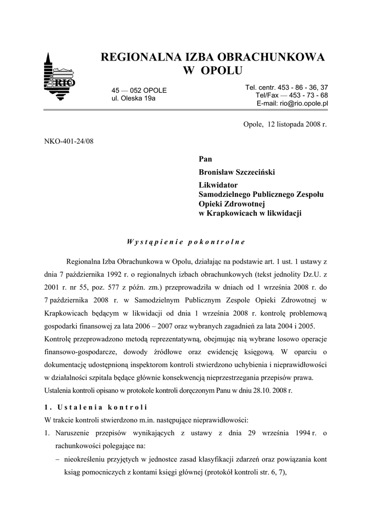 REGIONALNA IZBA OBRACHUNKOWA W OPOLU Tel. centr. 453 - 86 - 36, 37 Tel/Fax — 453 - 73 - 68 E-mail: [email protected] 45 — 052 OPOLE ul. Oleska 19a Opole, 12 listopada 2008 r. NKO-401-24/08 Pan Bronisław Szczeciński Likwidator Samodzielnego Publicznego Zespołu Opieki Zdrowotnej w Krapkowicach w likwidacji Wystąpienie pokontrolne Regionalna Izba Obrachunkowa w Opolu, działając na podstawie art. 1 ust. 1 ustawy z dnia 7 października 1992 r. o regionalnych izbach obrachunkowych (tekst jednolity Dz.U. z 2001 r. nr 55, poz. 577 z późn. zm.) przeprowadziła w dniach od 1 września 2008 r. do 7 października 2008 r. w Samodzielnym Publicznym Zespole Opieki Zdrowotnej w Krapkowicach będącym w likwidacji od dnia 1 września 2008 r. kontrolę problemową gospodarki finansowej za lata 2006 – 2007 oraz wybranych zagadnień za lata 2004 i 2005. Kontrolę przeprowadzono metodą reprezentatywną, obejmując nią wybrane losowo operacje finansowo-gospodarcze, dowody źródłowe oraz ewidencję księgową. W oparciu o dokumentację udostępnioną inspektorom kontroli stwierdzono uchybienia i nieprawidłowości w działalności szpitala będące głównie konsekwencją nieprzestrzegania przepisów prawa. Ustalenia kontroli opisano w protokole kontroli doręczonym Panu w dniu 28.10. 2008 r. 1. Ustalenia kontroli W trakcie kontroli stwierdzono m.in. następujące nieprawidłowości: 1. Naruszenie przepisów wynikających z ustawy z dnia 29 września 1994 r. o rachunkowości polegające na: − nieokreśleniu przyjętych w jednostce zasad klasyfikacji zdarzeń oraz powiązania kont ksiąg pomocniczych z kontami księgi głównej (protokół kontroli str. 6, 7), 2 − braku wykazu zbiorów danych tworzących księgi rachunkowe na komputerowych nośnikach danych (protokół kontroli str. 7), − braku opisu systemu informatycznego, zawierającego wykaz programów, procedur lub funkcji oraz określenie wersji oprogramowania i daty rozpoczęcia jego eksploatacji (protokół kontroli str. 7), − braku w zakładowym planie kont uregulowań dla kont o symbolach „133, 231, 252, 500, 503, 705” (protokół kontroli str. 16), − nieoznaczeniu księgi rachunkowej (dziennika) nazwą programu przetwarzania (protokół kontroli str. 22), − braku podsumowań obrotów na kolejnych stronach wydruków komputerowych zestawienia obrotów i sald dotyczących kont 200 – rozrachunki z odbiorcami i 201 – rozrachunki z dostawcami (protokół kontroli str. 22). Odpowiedzialność ponosi Główny Księgowy i byli Dyrektorzy SPZOZ w Krapkowicach. 2. Nieterminowe sporządzanie i przekazywanie sprawozdań w zakresie operacji finansowych (Rb-Z i Rb-N), (protokół kontroli str. 24-25). Odpowiedzialność ponosi Główny Księgowy i byli Dyrektorzy SPZOZ w Krapkowicach. 3. Nieustalenie w formie pisemnej procedur kontroli finansowej w zakresie wynikającym z dyspozycji art. 47 ustawy o finansach publicznych, (protokół kontroli str. 11 – 14). Odpowiedzialność ponoszą byli Dyrektorzy SPZOZ w Krapkowicach. 4. Nieterminowe regulowanie zobowiązań finansowych wobec kontrahentów, co spowodowało zapłatę przez jednostkę odsetek karnych w kwocie 128.657,50 zł, (protokół kontroli str. 31-37). Odpowiedzialność ponosi Główny Księgowy oraz byli Dyrektorzy SPZOZ w Krapkowicach. Powyższa nieprawidłowość może wypełniać znamiona czynu określonego w art. 16 ust.1 ustawy z dnia 17 grudnia 2004 r. o odpowiedzialności za naruszenie dyscypliny finansów publicznych (Dz.U. z 2005 r. nr 14, poz. 114 z późn. zm.). 5. Zawarcie umów dotyczących wynajmu i dzierżawy pomieszczeń szpitala na świadczenie usług medycznych pomimo braku opinii Komisji Zdrowia i Opieki Społecznej oraz braku zgody (w jednym przypadku) Zarządu Powiatu, co jest sprzeczne z uregulowaniami określonymi w uchwale nr XVI/94/2000 Rady Powiatu Krapkowickiego z dnia 3 24 sierpnia 2000 r. w sprawie zasad zbywania, wydzierżawiania lub wynajmowania majątku trwałego Samodzielnego Publicznego Zespołu Opieki Zdrowotnej w Krapkowicach, (protokół kontroli str. 31 – 34). Odpowiedzialność za powyższe ponoszą byli Dyrektorzy SPZOZ w Krapkowicach. 6. Nieprzestrzeganie przepisów wynikających z ustawy z dnia 29 stycznia 2004 r., Prawo zamówień publicznych polegające na: − nieprawidłowym ustaleniu wartości szacunkowej zamówienia (protokół kontroli str. 38 – 41), − nieudzieleniu odpowiedzi na pytanie oferenta w sprawie Specyfikacji Istotnych Warunków Zamówienia (protokół kontroli str. 42), − niedopełnieniu obowiązku potwierdzania pisemnie pocztą faktu przekazywania wykonawcom dokumentacji przetargowej faksem lub drogą elektroniczną (protokół kontroli str. 44, 48), − nieodrzuceniu ofert, których treść nie odpowiadała treści Specyfikacji Istotnych Warunków Zamówienia, (protokół kontroli str. 44 – 45, 48 – 49). Powyższa nieprawidłowość może wypełniać znamiona czynu określonego w art. 17 ust. 1 pkt 4) ustawy z dnia 17 grudnia 2004 r. o odpowiedzialności za naruszenie dyscypliny finansów publicznych (Dz.U. z 2005 r. nr 14, poz. 114 z późn. zm.). Odpowiedzialność ponoszą byli Dyrektorzy SPZOZ w Krapkowicach. II. Wnioski pokontrolne W celu usunięcia stwierdzonych uchybień i nieprawidłowości oraz usprawnienia prowadzenia zagadnień objętych kontrolą, Regionalna Izba Obrachunkowa w Opolu działając na podstawie art.9 ust.2 powołanej na wstępie ustawy o regionalnych izbach obrachunkowych, wnosi o pełne wykorzystanie ustaleń zawartych w protokole kontroli oraz o podjęcie skutecznych działań w celu wyeliminowania powstałych nieprawidłowości, a w szczególności o realizację następujących wniosków: 1. Wyeliminować nieprawidłowości w zakresie rachunkowości. Dostosować dokumentację opisującą przyjęte zasady rachunkowości oraz ewidencję księgową do potrzeb jednostki i wymogów wynikających z art. 10 ust. 1 ustawy z dnia 29 września 1994 r. o rachunkowości ( j. t