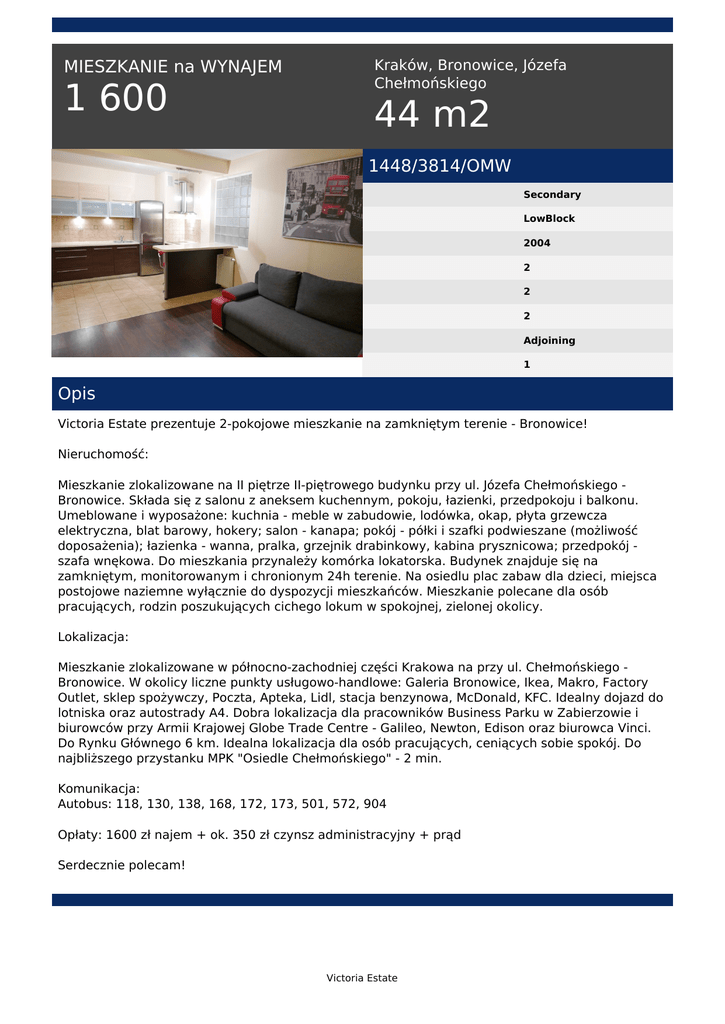 MIESZKANIE na WYNAJEM 1 600 Kraków, Bronowice, Józefa Chełmońskiego 44 m2 1448/3814/OMW Secondary LowBlock 2004 2 2 2 Adjoining 1 Opis Victoria Estate prezentuje 2-pokojowe mieszkanie na zamkniętym terenie - Bronowice! Nieruchomość: Mieszkanie zlokalizowane na II piętrze II-piętrowego budynku przy ul. Józefa Chełmońskiego Bronowice. Składa się z salonu z aneksem kuchennym, pokoju, łazienki, przedpokoju i balkonu. Umeblowane i wyposażone: kuchnia - meble w zabudowie, lodówka, okap, płyta grzewcza elektryczna, blat barowy, hokery; salon - kanapa; pokój - półki i szafki podwieszane (możliwość doposażenia); łazienka - wanna, pralka, grzejnik drabinkowy, kabina prysznicowa; przedpokój szafa wnękowa. Do mieszkania przynależy komórka lokatorska. Budynek znajduje się na zamkniętym, monitorowanym i chronionym 24h terenie. Na osiedlu plac zabaw dla dzieci, miejsca postojowe naziemne wyłącznie do dyspozycji mieszkańców. Mieszkanie polecane dla osób pracujących, rodzin poszukujących cichego lokum w spokojnej, zielonej okolicy. Lokalizacja: Mieszkanie zlokalizowane w północno-zachodniej części Krakowa na przy ul. Chełmońskiego Bronowice. W okolicy liczne punkty usługowo-handlowe: Galeria Bronowice, Ikea, Makro, Factory Outlet, sklep spożywczy, Poczta, Apteka, Lidl, stacja benzynowa, McDonald, KFC. Idealny dojazd do lotniska oraz autostrady A4. Dobra lokalizacja dla pracowników Business Parku w Zabierzowie i biurowców przy Armii Krajowej Globe Trade Centre - Galileo, Newton, Edison oraz biurowca Vinci. Do Rynku Głównego 6 km. Idealna lokalizacja dla osób pracujących, ceniących sobie spokój. Do najbliższego przystanku MPK "Osiedle Chełmońskiego" - 2 min. Komunikacja: Autobus: 118, 130, 138, 168, 172, 173, 501, 572, 904 Opłaty: 1600 zł najem + ok. 350 zł czynsz administracyjny + prąd Serdecznie polecam! Victoria Estate Małgorzata Wicha tel. +48 511 560 721 email: [email protected] Victoria Estate Powered by TCPDF (www.tcpdf.org)