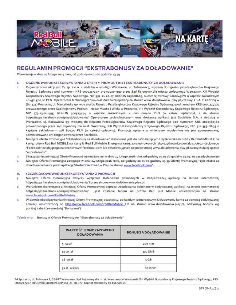 REGULAMIN PROMOCJI "EKSTRABONUSY ZA DOŁADOWANIE" Obowiązuje w dniu 04 lutego 2015 roku, od godziny 00.01 do godziny 23.59 I. OGÓLNE WARUNKI SKORZYSTANIA Z OFERTY PROMOCYJNEJ EKSTRABONUSY ZA DOŁADOWANIE 1. Organizatorem akcji jest P4 sp. z o.o. z siedzibą w (02-677) Warszawie, ul. Taśmowa 7, wpisaną do rejestru przedsiębiorców Krajowego Rejestru Sądowego pod numerem KRS 0000217207, prowadzonego przez Sąd Rejonowy dla miasta stołecznego Warszawy, XIII Wydział Gospodarczy Krajowego Rejestru Sądowego, NIP 951-21-20-07, REGON 015808609, numer rejestrowy E0008436W o kapitale zakładowym 48 456 500,00 PLN. Operatorem technologicznym oraz dostawcą aplikacji na stronie www.doladowania .play.pl jest PayU S.A. z siedzibą w (60-324) Poznaniu, ul. Marcelińska 90, wpisaną do Rejestru Przedsiębiorców Krajowego Rejestru Sądowego pod numerem KRS 0000274399 prowadzonego przez Sąd Rejonowy Poznań - Nowe Miasto i Wilda w Poznaniu, VIII Wydział Gospodarczy Krajowego Rejestru Sądowego, NIP 779-23-08-495, REGON 300523444 o kapitale zakładowym: 4 000 000,00 PLN (w całości opłacony), a na stronie https://apps.facebook.com/playdoladowania/ Operatorem technologicznym oraz dostawcą aplikacji jest Socializer S.A. z siedzibą w Warszawie, ul. Racławicka 95, wpisaną do Rejestru Przedsiębiorców Krajowego Rejestru Sądowego pod numerem KRS 0000380389 prowadzonego przez sąd Rejonowy dla m.st. Warszawy, XIII Wydział Gospodarczy Krajowego Rejestru Sądowego, NIP 521-359-68-35 o kapitale zakładowym: 178 800,00 PLN (w całości opłacony). Promocja opisana w niniejszym regulaminie nie jest sponsorowana, administrowana ani zorganizowana przez Facebook. Niniejsza oferta Promocyjna "Ekstrabonusy za doładowanie" skierowana jest do osób będących Użytkownikami oferty Red Bull MOBILE na kartę, oferty Red Bull MOBILE na Kartę II, Red Bull Mobile Energy na kartę, zarejestrowanych jako użytkownicy portalu społecznościowego "Facebook" działającego na stronie www.facebook.com lub doładowujących się przez stronę www.doladowania.play.pl zwanych dalej łącznie "uczestnikami". Skorzystanie z niniejszej Oferty Promocyjnej możliwe jest w dniu 04 lutego 2016 roku, od godziny 00.01 do godziny 23.59 , na zasadach poniżej. Niniejsza Oferta Promocyjna zastępuje w dniu 04 lutego 2016 roku, od godziny 00.01 do godziny 23.59 Ofertę Promocyjną "15% ekstra za doładowanie konta przez aplikację Strefa Doładowań w Play na stronie www.facebook.com". 2. 3. 4. II. SZCZEGÓŁOWE WARUNKI SKORZYSTANIA Z PROMOCJI 5. Niniejsza Oferta Promocyjna dotyczy wyłącznie Doładowań dokonanych w dedykowanej aplikacji na stronie internetowej https://apps.facebook.com/playdoladowania/ i przez stronę www.doladowania.play.pl. Warunkiem skorzystania z niniejszej Oferty Promocyjnej poprzez Doładowania dokonane w dedykowanej aplikacji na stronie internetowej https://apps.facebook.com/playdoladowania/ jest zostanie fanem na profilu Red Bull Mobile umieszczonym na stronie www.facebook.com/RedBullMobile. W okresie obowiązywania niniejszej Oferty Promocyjnej uczestnicy, po każdym jednorazowym Doładowaniu konta za pomocą dedykowanej aplikacji umieszczonej na http://www.facebook.com/RedBullMobile lub na stronie www.doladowania.play.pl, otrzymają bonusy wg poniżej tabeli (zwane dalej "Bonusami") 6. 7. Tabela nr 1: Bonusy w Ofercie Promocyjnej "Ekstrabonusy za doładowanie" WARTOŚĆ JEDNORAZOWEGO DOŁADOWANIA BONUS ZA DOŁADOWANIE 5- 10 zł 200 min 11-25 zł 300 SMS 26-50 zł 1 GB 51 zł i więcej 80 % VP P4 Sp. z o.o., ul. Taśmowa 7, 02-677 Warszawa, Sąd Rejonowy dla m. st. Warszawy w Warszawie XIII Wydział Gospodarczy Krajowego Rejestru Sądowego, KRS 0000217207, REGON 015808609, NIP 951-21-20-077, kapitał zakładowy 48 456 500 ZŁ STRONA 1 Z 2 8. 9. 10. 11. 12. 13. 14. Bonus 300 SMS-ów w ofercie Red Bull Mobile na karte II, Red Bull Mobile na kartę i Red Bull Mobile Energy darmowe rozmowy i SMSy w Play może zostać wykorzystany tylko na wysłanie 300 krajowych wiadomości SMS (realizowanych z Sieci Telekomunikacyjnej P4) do Sieci Telekomunikacyjnej P4 w ramach oferty, z wyłączeniem numerów zawartych w Tabeli nr 9 w Cenniku oferty Red Bull Mobile na kartę, Red Bull Mobile na kartę II i Red Bull Mobile Energy. Bonus 1 GB można wykorzystać na transmisję danych na terytorium Rzeczpospolitej Polskiej w zasięgu Sieci Telekomunikacyjnej, przy wykorzystaniu ustawień APN Internet. Po wykorzystaniu pakietu opłata za transmisję danych jest naliczana zgodnie z Cennikiem oferty Red Bull MOBILE na kartę, Cennikiem oferty Red Bull MOBILE na kartę II, Cennikiem oferty Red Bull Mobile Energy. Bonus 80% wartości doładowania można wykorzystać na krajowe połączenia głosowe, wideo, SMS i MMS do wszystkich sieci komórkowych w Polsce i na krajowe połączenia głosowe do krajowych sieci stacjonarnych, realizowane z sieci Telekomunikacyjnej, z wyłączeniem numerów specjalnych, infolinii i audioteksowych zwartych w Cenniku oferty Red Bull MOBILE na kartę, Cenniku oferty Red Bull MOBILE na kartę II, Cenniku Red Bull Mobile Energy. Bonus 200 minut do wszystkich sieci można wykorzystać na krajowe połączenia głosowe do wszystkich sieci komórkowych i stacjonarnych w Polsce na krajowe połączenia głosowe do krajowych sieci stacjonarnych, realizowane z sieci Telekomunikacyjnej, z wyłączeniem numerów specjalnych, infolinii i audioteksowych zwartych w Cenniku oferty Red Bull MOBILE na kartę, Cenniku oferty Red Bull MOBILE na kartę II, Cenniku Red Bull Mobile Energy. Poszczególne bonusy przyznawane są w ciągu 24 godzin od Doładowania. Poszczególne bonusy ważne są 30 dni kalendarzowych od dnia ich przyznania. Po zakończeniu danego miesiąca kalendarzowego MB rozliczane są zgodnie z Cennikiem Red Bull Mobile na kartę, Red Bull Mobile na kartę II, Red Bull Mobile Energy. 15. Opłata za przyznanie Bonusu zawarta jest w kwocie Doładowania konta Użytkownika. 16. Stan Bonusu można każdorazow