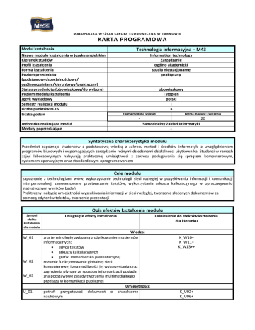 MAŁOP OLSKA WYŻSZ A SZ KOŁA E KONOMICZNA W TARN OW IE KARTA PROGRAMOWA Moduł kształcenia Technologia informacyjna – M43 Nazwa modułu kształcenia w języku angielskim Kierunek studiów Profil kształcenia Forma kształcenia Poziom przedmiotu (podstawowy/specjalnościowy/ ogólnouczelniany/kierunkowy/praktyczny) Status przedmiotu (obowiązkowy/do wyboru) Poziom modułu kształcenia Język wykładowy Semestr realizacji modułu Liczba punktów ECTS Liczba godzin Information technology Zarządzanie ogólno akademicki studia niestacjonarne praktyczny obowiązkowy I stopień polski I 3 Forma modułu: wykład Forma modułu: ćwiczenia - 20 Jednostka realizująca moduł Moduły poprzedzające Samodzielny Zakład Informatyki - Syntetyczna charakterystyka modułu Przedmiot zapoznaje studentów z podstawową wiedzą z zakresu metod i środków informatyki z uwzględnieniem programów biurowych i wspomagających zarządzanie różnymi dziedzinami działalności użytkownika. Studenci w ramach zajęć laboratoryjnych nabywają praktycznej umiejętności z zakresu posługiwania się sprzętem komputerowym, systemem operacyjnym oraz standardowym oprogramowaniem Cele modułu zapoznanie z technologiami www, wykorzystanie technologii sieci rozległej w pozyskiwaniu informacji i komunikacji interpersonalnej, zaawansowane przetwarzanie tekstów, wykorzystania arkusza kalkulacyjnego w opracowywaniu statystycznym wyników badań Praktyczny: nabycie umiejętności wyszukiwania informacji w sieci rozległej, tworzenia złożonych dokumentów za pomocą edytorów tekstów, tworzenie prezentacji Opis efektów kształcenia modułu Symbol efektu kształcenia dla modułu W_01 W_02 W_03 U_01 Osiągnięte efekty kształcenia Wiedza: zna terminologię związaną z użytkowaniem systemów informacyjnych: edycji tekstów arkuszy kalkulacyjnych grafiki menedżersko prezentacyjnej rozumie funkcjonowanie globalnej sieci komputerowej i zna możliwości jej wykorzystania oraz zagrożenia płynące ze sposobu jej organizacji posiada zna podstawowe zasady tworzenia multimedialnego przekazu w komunikacji publicznej Umiejętności: potrafi przygotować dokument o charakterze naukowym Odniesienie do efektów kształcenia dla kierunku K_W10+ K_W11+ K_W13++ K_U02+ K_U06+ U_02 U_03 K_01 ma umiejętności wykorzystania narzędzi informatycznych w przygotowaniu przekazu komunikacyjnego potrafi korzystać z arkusza kalkulacyjnego Kompetencje społeczne: ma świadomość poziomu własnej wiedzy i umiejętności informatycznych oraz rozumie potrzebę ustawicznego kształcenia się w tej dziedzinie K_U08+ K_U13++ K_U14+ K_K01++ Treści kształcenia modułu Forma modułu: ćwiczenia 1. Zawansowane przetwarzanie tekstów 8h a. Elementy złożonego dokumentu, typografia b. Generowanie spisów treści, indeksów, przypisów a. Elementy składu typograficznego b. Korekta i metody szybkiego przeredagowywania złożonych dokumentów 2. Grafika prezentacyjna i menedżerska a. Elementy prezentacji: - wzorzec slajdu tytułowego i slajdu podstawowego definiowanie wzorców b. przygotowanie konspektu, tworzenie prezentacji na podstawie konspektu zaawansowane elementy prezentacji: animacje, chronometraż 2. 3. romadzenie i opracowanie wyników badań za pomocą arkusza kalkulacyjnego a. gromadzenie danych w formie tabelarycznej: sortowanie, wyszukiwanie, selekcja b. graficzna prezentacja wyników Literatura podstawowa Literatura uzupełniająca 1. Nowakowski Zdzisław, Europejski Certyfikat Umiejętności Komputerowych moduł 1-6. Warszawa : Mikom : Wydawnictwo Naukowe PWN, cop. 2007 2. http://pe.mwse.edu.pl/course/view.php?id=9 3. http://office.microsoft.com/pl-pl/powerpoint-help/CH006255618.aspx 4. http://office.microsoft.com/pl-pl/word-help/CH010224758.aspx 1. Dec Z., Konieczny R.: ABC komputera 2003, Edition, 2000 2. Wykłady z podstaw informatyki, W.Sikorski, Wyd II. Mikom, Warszawa 2005 Metody dydaktyczne pokaz, ćwiczenia laboratoryjne, kursy na platformie e-learningowej