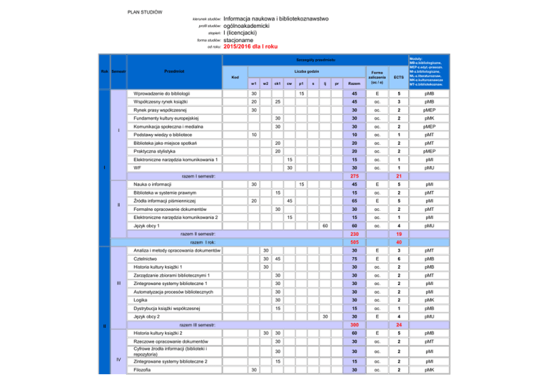 PLAN STUDIÓW kierunek studiów: profil studiów: stopień: forma studiów: od roku: Informacja naukowa i bibliotekoznawstwo ogólnoakademicki I (licencjacki) stacjonarne 2015/2016 dla I roku Szczegóły przedmiotu Przedmiot Rok Semestr Liczba godzin Forma zaliczenia (oc / e) ECTS 45 E 5 45 oc. 3 pMB 30 oc. 2 pMEP Kod w1 I Wprowadzenie do bibliologii 30 Współczesny rynek książki 20 Rynek prasy współczesnej 30 ck1 cw p1 s lj 15 25 30 oc. 2 pMK 30 30 oc. 2 pMEP pMT 10 oc. 1 Biblioteka jako miejsce spotkań 20 20 oc. 2 pMT Praktyczna stylistyka 20 20 oc. 2 pMEP 10 Elektroniczne narzędzia komunikowania 1 15 15 oc. 1 pMI WF 30 30 oc. 1 pMU 275 30 15 Biblioteka w systemie prawnym Źródła informacji piśmienniczej 15 20 45 Formalne opracowanie dokumentów 30 Elektroniczne narzędzia komunikowania 2 15 Język obcy 1 60 21 45 E 5 pMI 15 oc. 2 pMT 65 E 5 pMI 30 oc. 2 pMT 15 oc. 1 pMI 60 oc. 4 pMU razem II semestr: 230 19 razem I rok: 505 40 Analiza i metody opracowania dokumentów 30 Cztelnictwo 30 Historia kultury książki 1 30 45 30 E 3 pMT 75 E 6 pMB 30 oc. 2 pMB Zarządzanie zbiorami bibliotecznymi 1 30 30 oc. 2 pMT Zintegrowane systemy biblioteczne 1 30 30 oc. 2 pMI Automatyzacja procesów bibliotecznych 30 30 oc. 2 pMI Logika 30 30 oc. 2 pMK Dystrybucja książki współczesnej 15 15 oc. 1 pMB 30 E 4 pMU Język obcy 2 30 300 razem III semestr: II Historia kultury książki 2 IV pMB 30 razem I semestr: III Razem Komunikacja społeczna i medialna Nauka o informacji II pr Fundamenty kultury europejskiej Podstawy wiedzy o bibliotece I w2 Moduły: MB-z.bibliologiczne, MEP-z.edyt.-prasozn. MI-z.bibliologiczne, ML-z.literaturoznaw, MK-z.kulturoznawcze MT-z.bibliotekoznaw. 24 30 60 E 5 pMB Rzeczowe opracowanie dokumentów 30 30 oc. 2 pMT Cyfrowe źrodła informacji (biblioteki i repozytoria) 30 30 oc. 2 pMI 15 15 oc. 2 pMI 30 oc. 2 pMK 30 Zintegrowane systemy biblioteczne 2 Filozofia 30 Praca z czytelnikiem 20 Wprowadzenie do statystyki 15 oc. 15 oc. 200 razem IV semestr: 30 Historia nauki i naukoznawstwo 30 15 2 pMT 2 MI 17 500 razem II rok: Biblioteka w komunikacji społecznej V 20 41 30 oc. 2 pMB 45 E 5 pMK Nowoczesne systemy informacyjne 30 30 oc. 2 pMI Promocja instytucji książki 20 20 oc. 2 pMT Zarządzanie zbiorami bibliotecznymi 2 14 14 oc. 1 pMT 30 E 4 pML 30 oc. 2 pMK 30 oc. 3 Współczesna książka i literatura dla dzieci Wiedza o kulturze 30 30 Seminarium dyplomowe 1 III 30 229 razem V semestr: Budownictwo i design instytucji książki 15 Projektowanie i ocena systemów i usług informacyjnych 30 Praktyki zawodowe 120 21 15 oc. 1 pMT pMI 30 oc. 2 120 oc. 4 30 oc. 1 Praca licencjacka 0 oc. 6 Egzamin dyplomowy 0 E Seminarium dyplomowe 2 30 195 razem VI semestr: 424 razem III rok: RAZEM W CIĄGU TOKU STUDIÓW: godzin*: 1329 4 18 39 p. ECTS: 120
