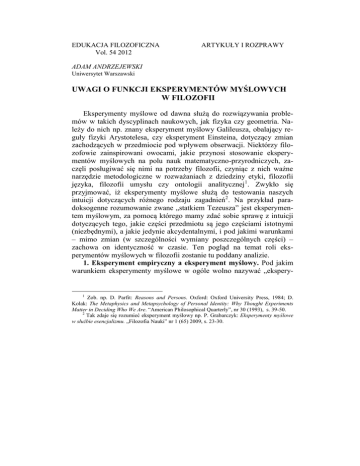 EDUKACJA FILOZOFICZNA Vol. 54 2012 ARTYKUŁY I ROZPRAWY ADAM ANDRZEJEWSKI Uniwersytet Warszawski UWAGI O FUNKCJI EKSPERYMENTÓW MYŚLOWYCH W FILOZOFII Eksperymenty myślowe od dawna służą do rozwiązywania problemów w takich dyscyplinach naukowych, jak fizyka czy geometria. Należy do nich np. znany eksperyment myślowy Galileusza, obalający reguły fizyki Arystotelesa, czy eksperyment Einsteina, dotyczący zmian zachodzących w przedmiocie pod wpływem obserwacji. Niektórzy filozofowie zainspirowani owocami, jakie przynosi stosowanie eksperymentów myślowych na polu nauk matematyczno-przyrodniczych, zaczęli posługiwać się nimi na potrzeby filozofii, czyniąc z nich ważne narzędzie metodologiczne w rozważaniach z dziedziny etyki, filozofii języka, filozofii umysłu czy ontologii analitycznej1. Zwykło się przyjmować, iż eksperymenty myślowe służą do testowania naszych intuicji dotyczących różnego rodzaju zagadnień2. Na przykład paradoksogenne rozumowanie zwane „statkiem Tezeusza” jest eksperymentem myślowym, za pomocą którego mamy zdać sobie sprawę z intuicji dotyczących tego, jakie części przedmiotu są jego częściami istotnymi (niezbędnymi), a jakie jedynie akcydentalnymi, i pod jakimi warunkami – mimo zmian (w szczególności wymiany poszczególnych części) – zachowa on identyczność w czasie. Ten pogląd na temat roli eksperymentów myślowych w filozofii zostanie tu poddany analizie. 1. Eksperyment empiryczny a eksperyment myślowy. Pod jakim warunkiem eksperymenty myślowe w ogóle wolno nazywać „ekspery- 1 Zob. np. D. Parfit: Reasons and Persons. Oxford: Oxford University Press, 1984; D. Kolak: The Metaphysics and Metapsychology of Personal Identity: Why Thought Experiments Matter in Deciding Who We Are. “American Philosophical Quarterly”, nr 30 (1993), s. 39-50. 2 Tak zdaje się rozumieć eksperyment myślowy np. P. Grabarczyk: Eksperymenty myślowe w służbie esencjalizmu. „Filozofia Nauki” nr 1 (65) 2009, s. 23-30. 70 Adam Andrzejewski mentami”? Jak należy rozszerzyć pojęcie eksperymentu, aby obejmowało zarówno eksperymenty empiryczne, jak i myślowe? W wypadku eksperymentu sensu stricto, jakim jest eksperyment empiryczny, mamy do czynienia z: (1’) pewnym rzeczywistym obiektem badawczym (badamy np., jak myszy reagują na bodźce świetlne), (2’) użyciem określonej aparatury oraz (3’) odwołaniem się do pewnej teorii. Eksperyment w zasadniczym sensie tego słowa jest to działanie mające na celu wywołanie jakiegoś stanu rzeczy, który potwierdza lub obala pewną hipotezę (albo ogólniej teorię)3. Rezultatem (resp. wynikiem) eksperymentów są zatem pewne fakty, potwierdzające lub obalające testowaną teorię. W tym drugim wypadku wyniki mogą stać się asumptem do powstania nowej teorii naukowej (jeśli nie przyjmie się tzw. hipotez ad hoc, ratujących teorię „starą”). Wnioskiem z eksperymentu jest twierdzenie, iż testowana hipoteza jest potwierdzona lub obalona. Eksperymenty myślowe nie są eksperymentami w tym sensie – metaforycznie można powiedzieć, iż nie rozgrywają się one w świecie rzeczywistym, lecz jedynie w wyobraźni4. W wypadku eksperymentów myślowych nie mamy do czynienia z żadnym fizycznym działaniem – przeprowadzane są one nie na rzeczywistych przedmiotach, lecz «w umyśle». Ich rezultatem nie są fakty, a pewne wyobrażone stany rzeczy. Pojęcia eksperymentu myślowego i empirycznego łączy jednak odwoływanie się do danej teorii: ich rezultatem jest potwierdzenie lub obalenie jakiejś hipotezy teoretycznej. Wspólna obu typom eksperymentu jest też tzw. kontrola danych (empirycznych bądź teoretycznych) „wprowadzanych” do eksperymentu. Kontrola danych w eksperymencie 3 Mówi się niekiedy, że niektóre eksperymenty przeprowadza się jedynie w celu zobrazowania teorii (np. na szkolnych zajęciach fizyki). W istocie jednak tego typu wizualizacje należy zaliczyć do eksperymentów potwierdzających teorię. Wyróżnia je tylko duży stopień subiektywnej pewności co do uzyskania przewidzianego rezultatu. Przypomina to sytuację ćwiczenia polegającego na dowodzeniu skądinąd dowiedzionych już tez jakiejś teorii zaksjomatyzowanej. 4 Tak stawia sprawę m.in. Brown pisząc, że eksperyment myślowy to coś, co przypomina eksperyment empiryczny, tyle ze odbywa się w „laboratorium naszego mózgu” (por. J. R. Brown: The Laboratory of the Mind: Thought Experiments in the Natural Sciences. Routledge 2001). Uwagi o funkcji eksperymentów myślowych w filozofii 71 polega na tym, że zmieniając jakiś określony czynnik (np. rodzaj odczynnika chemicznego, naświetlenie, otoczenie etc.) wiemy, na podstawie uprzednio zgromadzonej wiedzy, w jaki sposób wpływa to na pozostałe elementy występujące w eksperymencie (np. zmiana stopnia naświetlenia wypływa na syntezę chlorofilu etc)5. Oba typy eksperymentów łączy także element nieprzewidywalności. Zarówno w eksperymentach empirycznych, jak i w eksperymentach myślowych nie znamy z góry ich rezultatów6. Proponuję w związku z tym następujące definicje omawianych pojęć. Załóżmy, że stan rzeczy P (resp. zdanie stwierdzające, że zachodzi stan rzeczy P) potwierdza, a stan rzeczy O (resp. zdanie stwierdzające, że zachodzi stan rzeczy S) obala teorię T. Przeprowadzić eksperyment empiryczny w ramach teorii T to tyle, co wywołać stan rzeczy P lub stan rzeczy O. Przeprowadzić eksperyment myślowy w ramach teorii T to tyle, co wyobrazić sobie stan rzeczy P lub stan rzeczy O. Ogólnie – przeprowadzać eksperyment w ramach teorii T to wywoływać lub wyobrażać sobie stan rzeczy, który obala lub potwierdza (krótko – sprawdza) teorię T. Scharakteryzowane w ten sposób pojęcie eksperymentu obejmuje zarówno eksperymenty empiryczne, jak i myślowe. Dodać należy, że definicje są uproszczone, gdyż eksperymenty polegają na ogół na wywołaniu lub wyobrażeniu sobie nie pojed