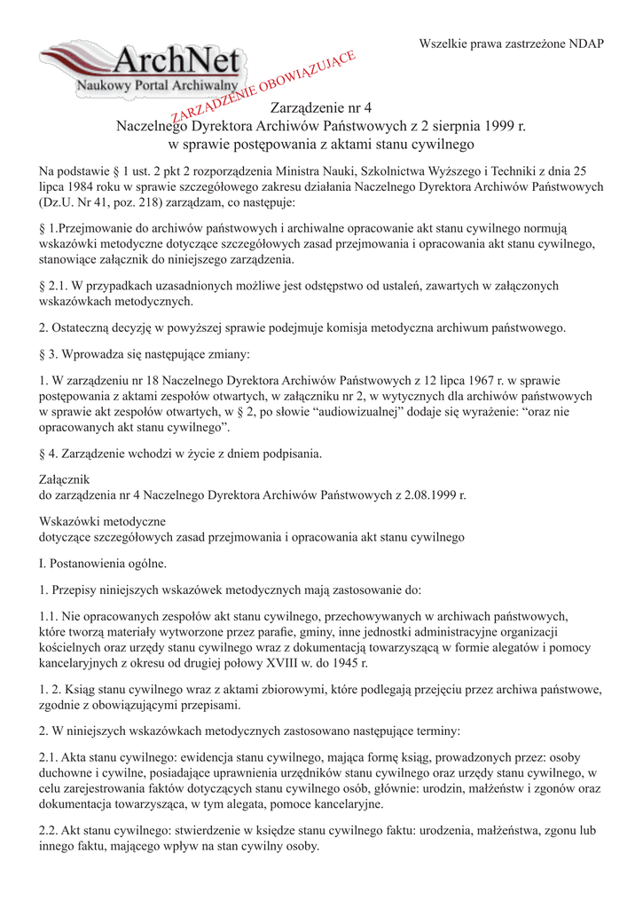 E JĄC Wszelkie prawa zastrzeżone NDAP ZU IĄ BOW IE O EN ĄDZ Zarządzenie nr 4 Naczelnego Dyrektora Archiwów Państwowych z 2 sierpnia 1999 r. w sprawie postępowania z aktami stanu cywilnego Z ZAR Na podstawie § 1 ust. 2 pkt 2 rozporządzenia Ministra Nauki, Szkolnictwa Wyższego i Techniki z dnia 25 lipca 1984 roku w sprawie szczegółowego zakresu działania Naczelnego Dyrektora Archiwów Państwowych (Dz.U. Nr 41, poz. 218) zarządzam, co następuje: § 1.Przejmowanie do archiwów państwowych i archiwalne opracowanie akt stanu cywilnego normują wskazówki metodyczne dotyczące szczegółowych zasad przejmowania i opracowania akt stanu cywilnego, stanowiące załącznik do niniejszego zarządzenia. § 2.1. W przypadkach uzasadnionych możliwe jest odstępstwo od ustaleń, zawartych w załączonych wskazówkach metodycznych. 2. Ostateczną decyzję w powyższej sprawie podejmuje komisja metodyczna archiwum państwowego. § 3. Wprowadza się następujące zmiany: 1. W zarządzeniu nr 18 Naczelnego Dyrektora Archiwów Państwowych z 12 lipca 1967 r. w sprawie postępowania z aktami zespołów otwartych, w załączniku nr 2, w wytycznych dla archiwów państwowych w sprawie akt zespołów otwartych, w § 2, po słowie “audiowizualnej” dodaje się wyrażenie: “oraz nie opracowanych akt stanu cywilnego”. § 4. Zarządzenie wchodzi w życie z dniem podpisania. Załącznik do zarządzenia nr 4 Naczelnego Dyrektora Archiwów Państwowych z 2.08.1999 r. Wskazówki metodyczne dotyczące szczegółowych zasad przejmowania i opracowania akt stanu cywilnego I. Postanowienia ogólne. 1. Przepisy niniejszych wskazówek metodycznych mają zastosowanie do: 1.1. Nie opracowanych zespołów akt stanu cywilnego, przechowywanych w archiwach państwowych, które tworzą materiały wytworzone przez parafie, gminy, inne jednostki administracyjne organizacji kościelnych oraz urzędy stanu cywilnego wraz z dokumentacją towarzyszącą w formie alegatów i pomocy kancelaryjnych z okresu od drugiej połowy XVIII w. do 1945 r. 1. 2. Ksiąg stanu cywilnego wraz z aktami zbiorowymi, które podlegają przejęciu przez archiwa państwowe, zgodnie z obowiązującymi przepisami. 2. W niniejszych wskazówkach metodycznych zastosowano następujące terminy: 2.1. Akta stanu cywilnego: ewidencja stanu cywilnego, mająca formę ksiąg, prowadzonych przez: osoby duchowne i cywilne, posiadające uprawnienia urzędników stanu cywilnego oraz urzędy stanu cywilnego, w celu zarejestrowania faktów dotyczących stanu cywilnego osób, głównie: urodzin, małżeństw i zgonów oraz dokumentacja towarzysząca, w tym alegata, pomoce kancelaryjne. 2.2. Akt stanu cywilnego: stwierdzenie w księdze stanu cywilnego faktu: urodzenia, małżeństwa, zgonu lub innego faktu, mającego wpływ na stan cywilny osoby. 2.3. Pierwopis: pierwszy egzemplarz księgi, pozostający zwykle u twórcy akt. Odpowiedniki terminu w języku polskim: unikat, rejestr główny. Odpowiedni termin w języku niemieckim: hauptregister. 2.4.Wtóropis: wtórny egzemplarz księgi, przekazany pierwotnie odpowiednim urzędom, zgodnie z prawnymi ustaleniami (w niektórych przypadkach w postaci jednej księgi dla trzech rodzajów wpisów w różnym okresie). Odpowiedniki terminu w języku polskim: duplikat, poboczny rejestr. Odpowiedni termin w języku niemieckim: neubenregister. 2.5. Alegata: Dokumenty dotyczące zawierania małżeństw. 2.6. Pomoce kancelaryjne. II. Przejmowanie do archiwów państwowych akt stanu cywilnego oraz ich przechowywanie. 1. Archiwa państwowe przejmują księgi stanu cywilnego wraz z aktami zbiorowymi po upływie 100 lat od zamknięcia księgi, zgodnie z rozporządzeniem MSWiA z 26 października 1998 r. w sprawie szczegółowych zasad sporządzania aktów stanu cywilnego, sposobu prowadzenia ksiąg stanu cywilnego, ich kontroli, przechowywania i zabezpieczania oraz wzorów aktów stanu cywilnego, ich odpisów, zaświadczeń i protokołów (Dz.U. Nr 136 z 1998 r., poz. 884), a także innymi obowiązującymi przepisami. 2. Archiwa państwowe przejmują akta stanu cywilnego w trybie określonym w zarządzeniu Naczelnego Dyrektora Archiwów Państwowych z 25 lutego 1986 r. w sprawie szczegółowych zasad porządkowania oraz trybu przekazywania materiałów archiwalnych do archiwów państwowych (MP Nr 4 z 1986 r., poz. 31). 3. Archiwa państwowe powinny przejmować akta, których stan fizyczny nie budzi zastrzeżeń konserwatorskich. Archiwa państwowe mogą udzielić jednostce przekazującej, na jej wniosek, konsultacji w zakresie konserwacji akt. 4. Archiwa państwowe powinny przejmować akta systematycznie, w odcinkach chronologicznych, obejmujących kompletne akta, zgodnie z przepisami, o których mowa w ust. II, pkt. 1 i 2. 5. Jeśli wymagają tego względy zabezpieczenia fizycznego akt, archiwum państwowe może przechowywać pierwopisy i wtóropisy ksiąg stanu cywilnego w oddzielnych magazynach archiwalnych. III. Opracowywanie akt stanu cywilnego. 1. Wyodrębnienie zespołu: 1.1. Należy łączyć w zespoły akta stanu cywilnego, które powstały w wyniku działalności jednostki wyznaniowej, mającej uprawnienia do prowadzenia księgi parafii, okręgu bóżniczego, gminy wyznaniowej lub urzędu stanu cywilnego. 1.2. Nie należy wydzielać i łączyć w odrębny zespół akt stanu cywilnego, które wchodzą w skład zespołów archiwalnych akt miast, starostw i pełnomocników do spraw metryk izraelickich. Informację o tych materiałach należy umieścić jako załącznik do wstępu do inwentarza właściwego terytorialnie zespołu akt stanu cywilnego. Informacja powinna zawierać następujące elementy: rodzaj rejestracji (w seriach), granice chronologiczne akt, nazwę i numer zespołu, sygnatury jednostek inwentarzowych. 2. Ustalenie nazwy i granic chronologicznych zespołu: 2.1. Zespoły akt stanu cywilnego, przejmowane z parafii i gmin wyznaniowych otrzymują nazwę umowną, składającą się z następujących elemen