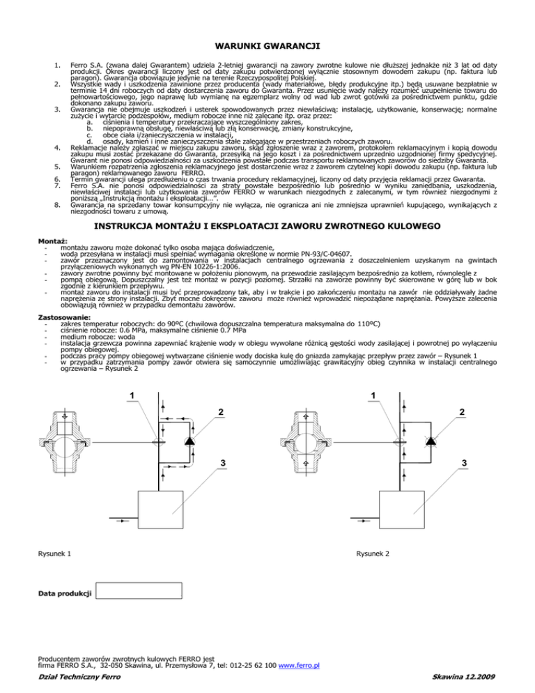 WARUNKI GWARANCJI 1. 2. 3. 4. 5. 6. 7. 8. Ferro S.A. (zwana dalej Gwarantem) udziela 2-letniej gwarancji na zawory zwrotne kulowe nie dłuŜszej jednakŜe niŜ 3 lat od daty produkcji. Okres gwarancji liczony jest od daty zakupu potwierdzonej wyłącznie stosownym dowodem zakupu (np. faktura lub paragon). Gwarancja obowiązuje jedynie na terenie Rzeczypospolitej Polskiej. Wszystkie wady i uszkodzenia zawinione przez producenta (wady materiałowe, błędy produkcyjne itp.) będą usuwane bezpłatnie w terminie 14 dni roboczych od daty dostarczenia zaworu do Gwaranta. Przez usunięcie wady naleŜy rozumieć uzupełnienie towaru do pełnowartościowego, jego naprawę lub wymianę na egzemplarz wolny od wad lub zwrot gotówki za pośrednictwem punktu, gdzie dokonano zakupu zaworu. Gwarancja nie obejmuje uszkodzeń i usterek spowodowanych przez niewłaściwą: instalację, uŜytkowanie, konserwację; normalne zuŜycie i wytarcie podzespołów, medium robocze inne niŜ zalecane itp. oraz przez: a. ciśnienia i temperatury przekraczające wyszczególniony zakres, b. niepoprawną obsługę, niewłaściwą lub złą konserwację, zmiany konstrukcyjne, c. obce ciała i/zanieczyszczenia w instalacji, d. osady, kamień i inne zanieczyszczenia stałe zalegające w przestrzeniach roboczych zaworu. Reklamacje naleŜy zgłaszać w miejscu zakupu zaworu, skąd zgłoszenie wraz z zaworem, protokołem reklamacyjnym i kopią dowodu zakupu musi zostać przekazane do Gwaranta, przesyłką na jego koszt i za pośrednictwem uprzednio uzgodnionej firmy spedycyjnej. Gwarant nie ponosi odpowiedzialności za uszkodzenia powstałe podczas transportu reklamowanych zaworów do siedziby Gwaranta. Warunkiem rozpatrzenia zgłoszenia reklamacyjnego jest dostarczenie wraz z zaworem czytelnej kopii dowodu zakupu (np. faktura lub paragon) reklamowanego zaworu FERRO. Termin gwarancji ulega przedłuŜeniu o czas trwania procedury reklamacyjnej, liczony od daty przyjęcia reklamacji przez Gwaranta. Ferro S.A. nie ponosi odpowiedzialności za straty powstałe bezpośrednio lub pośrednio w wyniku zaniedbania, uszkodzenia, niewłaściwej instalacji lub uŜytkowania zaworów FERRO w warunkach niezgodnych z zalecanymi, w tym równieŜ niezgodnymi z poniŜszą „Instrukcją montaŜu i eksploatacji...”. Gwarancja na sprzedany towar konsumpcyjny nie wyłącza, nie ogranicza ani nie zmniejsza uprawnień kupującego, wynikających z niezgodności towaru z umową. INSTRUKCJA MONTAśU I EKSPLOATACJI ZAWORU ZWROTNEGO KULOWEGO MontaŜ: montaŜu zaworu moŜe dokonać tylko osoba mająca doświadczenie, woda przesyłana w instalacji musi spełniać wymagania określone w normie PN-93/C-04607. zawór przeznaczony jest do zamontowania w instalacjach centralnego ogrzewania z doszczelnieniem uzyskanym na gwintach przyłączeniowych wykonanych wg PN-EN 10226-1:2006. zawory zwrotne powinny być montowane w połoŜeniu pionowym, na przewodzie zasilającym bezpośrednio za kotłem, równolegle z pompą obiegową. Dopuszczalny jest teŜ montaŜ w pozycji poziomej. Strzałki na zaworze powinny być skierowane w górę lub w bok zgodnie z kierunkiem przepływu. montaŜ zaworu do instalacji musi być przeprowadzony tak, aby i w trakcie i po zakończeniu montaŜu na zawór nie oddziaływały Ŝadne napręŜenia ze strony instalacji. Zbyt mocne dokręcenie zaworu moŜe równieŜ wprowadzić niepoŜądane napręŜania. PowyŜsze zalecenia obowiązują równieŜ w przypadku demontaŜu zaworów. Zastosowanie: zakres temperatur roboczych: do 90ºC (chwilowa dopuszczalna temperatura maksymalna do 110ºC) ciśnienie robocze: 0.6 MPa, maksymalne ciśnienie 0.7 MPa medium robocze: woda instalacja grzewcza powinna zapewniać krąŜenie wody w obiegu wywołane róŜnicą gęstości wody zasilającej i powrotnej po wyłączeniu pompy obiegowej. podczas pracy pompy obiegowej wytwarzane ciśnienie wody dociska kulę do gniazda zamykając przepływ przez zawór – Rysunek 1 w przypadku zatrzymania pompy zawór otwiera się samoczynnie umoŜliwiając grawitacyjny obieg czynnika w instalacji centralnego ogrzewania – Rysunek 2 1 1 2 2 3 3 Rysunek 1 Data produkcji Rysunek 2 . . Producentem zaworów zwrotnych kulowych FERRO jest firma FERRO S.A., 32-050 Skawina, ul. Przemysłowa 7, tel: 012-25 62 100 www.ferro.pl Dział Techniczny Ferro Skawina 12.2009