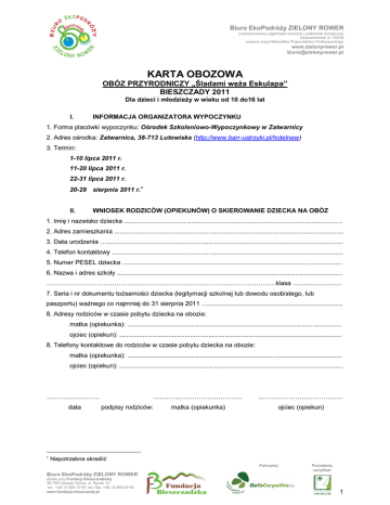 Biuro EkoPodróży ZIELONY ROWER Licencjonowany organizator turystyki i pośrednik turystyczny Zaświadczenie nr 120/06 wydane przez Marszałka Województwa Podkarpackiego www.zielonyrower.pl [email protected] KARTA OBOZOWA OBÓZ PRZYRODNICZY „Śladami węża Eskulapa” BIESZCZADY 2011 Dla dzieci i młodzieży w wieku od 10 do16 lat I. INFORMACJA ORGANIZATORA WYPOCZYNKU 1. Forma placówki wypoczynku: Ośrodek Szkoleniowo-Wypoczynkowy w Zatwarnicy 2. Adres ośrodka: Zatwarnica, 38-713 Lutowiska (http://www.barr-ustrzyki.pl/hotelnew) 3. Termin: 1-10 lipca 2011 r. 11-20 lipca 2011 r. 22-31 lipca 2011 r. 20-29 sierpnia 2011 r. II. WNIOSEK RODZICÓW (OPIEKUNÓW) O SKIEROWANIE DZIECKA NA OBÓZ 1. Imię i nazwisko dziecka ........................................................................................................................ 2. Adres zamieszkania .............................................................................................................................. 3. Data urodzenia ….................................................................................................................................. 4. Telefon kontaktowy ............................................................................................................................... 5. Numer PESEL dziecka ......................................................................................................................... 6. Nazwa i adres szkoły ............................................................................................................................ ……………………………………………………………………………………………klasa ........................... 7. Seria i nr dokumentu tożsamości dziecka (legitymacji szkolnej lub dowodu osobistego, lub paszportu) ważnego co najmniej do 31 sierpnia 2011 ….......................................................................... 8. Adresy rodziców w czasie pobytu dziecka na obozie: matka (opiekunka): ...................................................................................................................... ojciec (opiekun): .......................................................................................................................... 8. Telefony kontaktowe do rodziców w czasie pobytu dziecka na obozie: matka (opiekunka): ...................................................................................................................... ojciec (opiekun): ........................................................................................................................... …………………… data podpisy rodziców: ….…….………………………… ..………………………………. matka (opiekunka) ojciec (opiekun) Niepotrzebne skreślić Polecamy: Posiadamy certyfikat: Biuro EkoPodróży ZIELONY ROWER działa przy Fundacji Bieszczadzkiej 38-700 Ustrzyki Dolne, ul. Rynek 14 tel.: +48 13 469 72 97; tel./ fax: +48 13 469 62 90 www.fundacja.bieszczady.pl 1 Biuro EkoPodróży ZIELONY ROWER Licencjonowany organizator turystyki i pośrednik turystyczny Zaświadczenie nr 120/06 wydane przez Marszałka Województwa Podkarpackiego www.zielonyrower.pl [email protected] III. INFORMACJA RODZICÓW (OPIEKUNÓW) O DZIECKU 1. Imię i nazwisko dziecka ……………….................................................................................................. 2. Dziecko interesuje się…........................................................................................................................ ................................................................................................................................................................... (należy do kół zainteresowań ....................................................................................................... uprawia dyscyplinę sportową ……...............................................................................................) 3. Przebyte choroby (podać, w którym roku życia): odra ..........................., ospa ................................., różyczka ..................., świnka ...................., szkarlatyna .................., żółtaczka zakaźna......................., astma ................... , padaczka ................... , choroby nerek (jakie?): ...................................................... ………………………………………………………………………………………………………………………, inne choroby.............................................................................................................................................. 4. U dziecka występowały w ostatnim roku lub występują obecnie: drgawki, utraty przytomności, zaburzenia równowagi, omdlenia, częste bóle głowy, lęki nocne, trudności w zasypianiu, tiki, moczenia nocne, częste bóle brzucha, wymioty, krwawienia z nosa, przewlekły kaszel, (lub katar, anginy), duszność, bóle stawów, szybkie męczenie się, niedosłuch, jąkanie, inne: ............................................................................................................................................. 5. Dziecko jest : nieśmiałe, ma trudności w nawiązywaniu kontaktów, nadpobudliwe, inne informacje o usposobieniu i zachowaniu dziecka: ….……………………………………………………………………... ………………………………………………………………………………………………………………………. 6. Dziecko jest uczulone: tak / nie. Jeśli tak podać na co: ….………………........................................... ................................................................................................................................................................... 7. Dziecko nosi: okulary, aparat ortodontyczny, wkładki ortopedyczne, inne apar