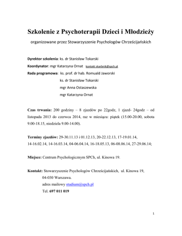 Szkolenie z Psychoterapii Dzieci i Młodzieży organizowane przez Stowarzyszenie Psychologów Chrześcijańskich Dyrektor szkolenia: ks. dr Stanisław Tokarski Koordynator: mgr Katarzyna Ornat kontakt [email protected] Rada programowa: ks. prof. dr hab. Romuald Jaworski ks. dr Stanisław Tokarski mgr Anna Ostaszewska mgr Katarzyna Ornat Czas trwania: 200 godziny – 8 zjazdów po 22godz, 1 zjazd- 24godz – od listopada 2013 do czerwca 2014, raz w miesiącu: piątek (15.00-20.00, sobota 9.00-18.15, niedziela 9.00-14.00). Terminy zjazdów: 29-30.11.13 i 01.12.13, 20-22.12.13, 17-19.01.14, 14-16.02.14, 14-16.03.14, 04-06.04.14, 16-18.05.13, 06-08.06.14, 27-29.06.14; Miejsce: Centrum Psychologicznym SPCh, ul. Kinowa 19. Kontakt: Stowarzyszenie Psychologów Chrześcijańskich, ul. Kinowa 19, 04-030 Warszawa. adres mailowy [email protected] Tel. 697 011 019 1 Szkolenie z Psychoterapii Dzieci i Młodzieży skierowane jest do psychologów, pedagogów szkolnych i pedagogów placówek opiekuńczo-wychowawczych, lekarzy ( w szczególności lekarzy pediatrów), nauczycieli i innych osób pracujących z dziećmi i młodzieżą. I. Kryteria kwalifikacji Warunkiem przyjęcia do Studium Psychoterapii Dzieci i Młodzieży SPCh jest: – Ukończone studia wyższe magisterskie tj. dyplom lekarza medycyny lub magistra w zakresie psychologii, pedagogiki, nauk społecznych, humanistycznych. − Decyzja Komisji Kwalifikacyjnej na podstawie formularza zgłoszenia. − Wniesienie w terminie wymaganych opłat. II. Program ogólny W programie szkolenia przewidziane jest dostarczenie wiedzy i umiejętności niezbędnej do prowadzenia psychoterapii wśród dzieci i młodzieży, w formie wykładów i warsztatów dotyczących takich zagadnień jak: - Podstawy kontaktu z dzieckiem i rodziną, - Psychologia kliniczna i psychopatologia dzieci i młodzieży: depresje, nerwice, zaburzenia osobowości, psychozy, problemy rodzinne, uzależnienia, przemoc w rodzinie, - Poradnictwo i psychoterapia integratywna dzieci i młodzieży, - Psychologia religii i duchowości dzieci i młodzieży, - Zasady etyczne psychoterapii dzieci i młodzieży. Program szczegółowy zał. 1 III. Zaliczenia Zaliczenia zajęć odbywają się na podstawie obecności, aktywności podczas zajęć. Obecność na zajęciach jest obowiązkowa, sprawdzana na każdych zajęciach. W sytuacjach wyjątkowych dopuszczalne jest opuszczenie do 2 dni zajęć teoretycznych w ciągu roku, ale na dyplomie podana będzie faktyczna liczba godzin. Jeśli uczestnik szkolenia opuści więcej niż 2 dni w roku, konieczne jest uzupełnienie opuszczonych zajęć z inną grupą. IV. Warunki zaliczenia Studium i otrzymania dyplomu Absolwenci Szkolenia otrzymają dyplom ukończenia Szkolenia z Psychoterapii Dzieci i Młodzieży, warunkiem uzyskania jest: 1. Obecność na wszystkich zajęciach. 2. Dokonanie opłat za Studium. Odpowiedzialność za zaliczenie wszystkich modułów szkolenia ponosi uczestnik szkolenia. 2 Możliwe jest wykluczenie ze szkolenia w przypadku nie spełniania regulaminu Studium (np. nie uiszczanie w terminie wymaganych opłat). Wykluczenie ze szkolenia musi być poprzedzone rozmową indywidualną przedstawiciela kierownictwa Studium z daną osobą. V. Opłaty Koszt studium. Opłaty należy wnieść w określonym terminie na konto SPCh – PEKAO S.A. III o/Warszawa nr 42 1240 1040 1111 0010 1541 6402. Zaliczka Opłata Członkowie SPCh 300zł+23% Vat 369zł Płatność w I racie Termin 15.10.13 Opłata 3700+23% Vat 4551zł Termin 15.11.13 Płatność w II ratach Opłata 1900+23% Vat 2337zł 1900+23% Vat 2337zł Pozostali 300zł+23% Vat 369zł 15.10.13 4100+23% Vat 5043zł 15.11.13 2100+23% Vat 2583zł 2100+23% Vat 2583zł Termin 15.11.13 06.03.14 Płatność w IX ratach Opłata 390+23% Vat 12.12.13 479,70zł 09.01.14 06.02.14 06.03.14 15.11.13 460+23% Vat 06.03.14 Termin 15.11.13 565,80zł 27.03.14 08.05.14 30.05.14 19.06.14 Osoby zakwalifikowane są zobowiązane do wpłacenia zaliczki. Zaliczka jest bezzwrotna jeśli kandydat zrezygnuje ze szkolenia. Nie dokonanie tej wpłaty po zakwalifikowaniu powoduje skreślenie z listy studentów. Rachunki wystawiane są przez sekretarza Studium na prośbę uczestnika szkolenia, do 7 dni od wpływu opłaty na konto, po przedstawieniu przez uczestnika danych koniecznych do wystawienia rachunku. Dane do rachunku można przesłać na adres [email protected] W przypadku rezygnacji ze Studium nie jest możliwy zwrot opłaty za rozpoczęty cykl nauki. Jeśli uczestnik wniesie opłatę po wymaganym terminie, opłata jest wyższa o 2 % za każdy rozpoczynający się miesiąc nauki. VII. Prowadzący Szkolenie prowadzone jest przez zespół główny szkolący w zakresie Psychoterapii i Poradnictwa w Stowarzyszeniu Psychologów Chrześcijańskich oraz zaproszonych specjalistów- praktyków w zakresie Psychoterapii Dzieci i Młodzieży. Biogramy prowadzących zał. 2 3 Zał. 1 Program szczegółowy Blok I Wprowadzenie, zawiązanie grupy omówienie zasad szkolenia Podstawy psychologii rozwojowej dzieci i młodzieży. Rozwój emocjonalny dzieci i młodzieży, społeczny, poznawczy, psychoseksualny dzieci i młodzieży. Nawiązywanie kontaktu z dziećmi w poszczególnych fazach rozwojowych. Wywiad z rodzicem. Blok II Podstawowe założenia ogólnej teorii systemów. Rozwój terapii rodzin – rys historyczny, przegląd szkół, kontekst ich rozwoju, przedstawiciele, podstawowe pojęcia. Spojrzenie na rodzinę jako na system - struktura rodziny. Koncepcja cyklu życia rodzinnego. Pomoc terapeutyczna na poszczególnych etapach cyklu życia rodziny. Wybrane elementy poszczególnych podejść systemowych. Specyficzne techniki terapeutyczne stosowane w pracy z rodziną. Teoria i praktyka genogramu – zasady konstrukcji i interpretacji, konstruowanie hipotez na podstawie informacji wniesionych przez genogram. Rola terapeuty systemowego, relacja terapeutyczna w terapii systemowej Zasady konsultacji systemowej. Schemat pierwszego wywiadu