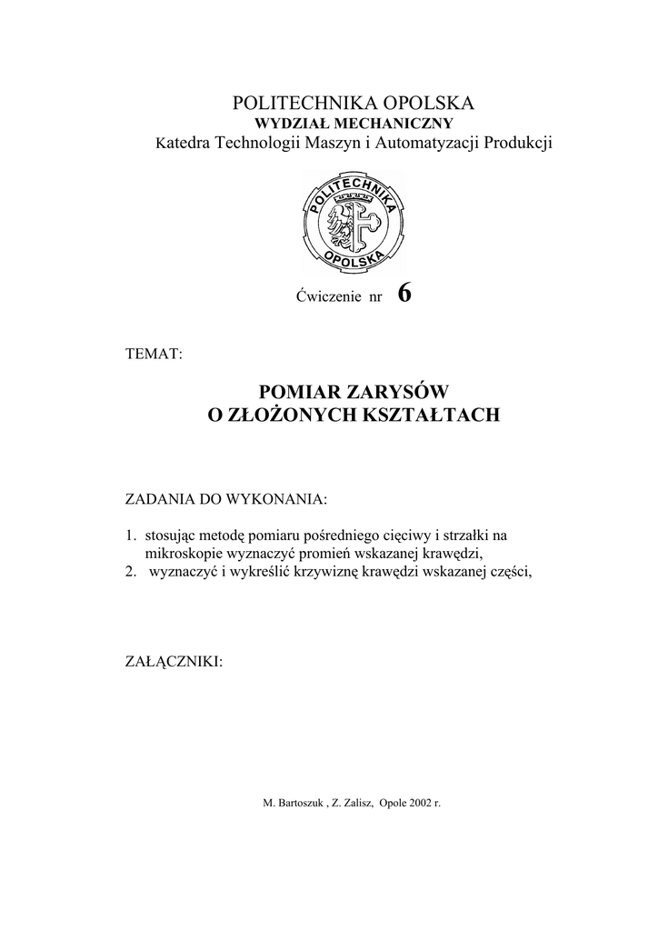 POLITECHNIKA OPOLSKA WYDZIAŁ MECHANICZNY Katedra Technologii Maszyn i Automatyzacji Produkcji Ćwiczenie nr 6 TEMAT: POMIAR ZARYSÓW O ZŁOŻONYCH KSZTAŁTACH ZADANIA DO WYKONANIA: 1. stosując metodę pomiaru pośredniego cięciwy i strzałki na mikroskopie wyznaczyć promień wskazanej krawędzi, 2. wyznaczyć i wykreślić krzywiznę krawędzi wskazanej części, ZAŁĄCZNIKI: M. Bartoszuk , Z. Zalisz, Opole 2002 r. I. Wprowadzenie W wielu przypadkach elementy części maszyn i urządzeń posiadają przekroje o stałym promieniu krzywizny. Najczęściej występują one w takich elementach jak: wałki, cylindry, tłoki, panewki łożysk, zawory, końcówki popychaczy rozrządu silników spalinowych, narzędzia promieniowe do obróbki różnych materiałów, sprawdziany, wzorniki itp. Pomiary zarysów promieni łuków o stałej krzywiźnie wykonuje się w celu sprawdzenia poprawności wykonania określonych elementów zgodnie z warunkami technicznymi postawionymi przez konstruktora w celu zapewnienia poprawnego działania urządzenia w okresie jego eksploatacji. Wybór metody pomiarowej zależy w głównej mierze od wartości promienia. 1. Pomiary promieni łuków za pomocą promieniomierzy Najprostszym sposobem pomiaru promieni łuków kołowych jest pomiar metodą bezpośredniego porównania. Polega ona na przystawianiu do mierzonego łuku kolejnych wzorców promieni o rosnących lub malejących wartościach (rys. 1) Promień mierzonej krzywizny jest równy promieniowi wzorca, który przyłożony do przedmiotu nie wykazuje prześwitów. Rys. 1. Pomiar promienia R krzywizny przedmiotu wzorcem łuku kołowego Jeżeli nie da się dobrać takiego wzorca wówczas istnieją dwa wzorce łuków kołowych, które po przyłożeniu do mierzonej krzywizny wykazują małe prześwity – jeden wzorzec na skrajach łuku, drugi w środku łuku (rys. 1). Wówczas wartość mierzonego promienia przyjmuje się jako średnią arytmetyczną promieni wzorców R1 i R2. 2 R= R1 + R2 2 Jeżeli maksymalne prześwity na skrajach łuku i w środku nie są równe, to można dokonać interpolacji z dokładnością do 0,1 różnicy pomiędzy promieniami R1 i R2. ∆R = ± R1 + R2 2 2. Pomiar bezpośredni mikroskopem warsztatowym lub uniwersalnym za pomocą głowicy rewolwerowej z zarysami łuków Głowica rewolwerowa mikroskopu zawiera wzorce kreskowe łuków o określonych promieniach. Pokrętło głowicy rewolwerowej umożliwia przemieszczanie wzorców kreskowych łuków kołowych danego zestawu i umieszczenie ich w polu widzenia mikroskopu z widocznym w tle mierzonym zarysem, tak że można je kolejno dopasowywać do tego zarysu. Zasada pomiaru jest taka sama jak opisana poprzednio przy pomiarze za pomocą promieniomierzy. Kolejność postępowania jest następująca: - umieścić fragment przedmiotu o promieniu r w środku stolika mikroskopu, - dobrać właściwe powiększenie obiektywu mikroskopu, dla odpowiedniego sektora zarysu łuków w głowicy, - ustawić ostrość mierzonej krawędzi, - sprawdzić ostrość widzenia wzorcowanych zarysów łuków, jeżeli zachodzi potrzeba – ustawić ostrość za pomocą okularu, - wprowadzić w pole widzenia zarysy kreskowe o promieniach najbliższych promieniowi mierzonemu, - starać się dopasować jeden z zarysów wzorcowych łuków do zarysu mierzonej krzywizny tak, aby się wzajemnie pokrywały – jeżeli taki stan zostanie osiągnięty, to promień mierzony jest równy promieniowi zarysu wzorcowego, - jeżeli osiągnięcie powyższego stanu jest niemożliwe, to należy dobrać dwa najbliższe wzorcowe zarysy łuków tak, aby większy z nich o promieniu R2 wykazywał szczelinę w środku łuku, mniejszy o promieniu R1, na krańcach łuku (rys. 2). Promień i niedokładność promienia oblicza się ze wzorów podanych poprzednio. 3 Rys. 2. Widok w okularze mikroskopu warsztatowego z zarysami wzorcowymi łuków i konturem mierzonego przedmiotu 3. Pomiar pośredni promienia na mikroskopie za pomocą cięciwy i strzałki Związek geometryczny pomiędzy promieniem, a strzałką i cięciwą podano na rys. 3. Wielkościami mierzonymi bezpośrednio są długość strzałki łuku (s) i odpowiadająca jej długość cięciwy łuku (c). a) b ) Rys. 3. Związek geometryczny pomiędzy promieniem oraz strzałką i cięciwą łuku kołowego. Położenie kresek krzyża okularu mikroskopu podczas pomiaru: a) strzałki, b) cięciwy Sposób pomiaru podano na rys. 3. W celu obliczenia promienia należy wykonać następujące czynności: - ustawić mierzony płaski przedmiot o promieniu R na stoliku mikroskopu i wygenerować ostrość, 4 - poziomą środkową kreskę siatki okularu ustawić stycznie do zarysu łuku i odczytać na podziałce śruby mikrometrycznej wskazanie początkowe y1, - przesunąć stolik z przedmiotem o wartość strzałki s i odczytać wskazanie końcowe y2, - przesunąć stolik tak, aby pionowa kreska siatki okularu znalazła się w położeniu x1, a następnie w x2 i odczytać odpowiadające tym położeniom wskazania mikrometru, - obliczyć wartość strzałki s i cięciwy c wykorzystując zależności: s = y 2 − y1 , c = x2 − x1 2 c R 2 = + (R − s ) 2 2 Skąd możemy obliczyć c2 s R= + 8s 2 Niedokładność pomiaru: ∂R ∂R ∆R = ∆c + ∆s ∂s ∂c gdzie: ∂R c = , ∂c 4s ∂R c2 1 =− 2 + ∂s 8s 2 ∆c = ∆s = ± ∆W + ∆R0 ∆W ∆R0 – graniczny błąd wskazań mikrometru mikroskopu, – błąd odczytu (0,1 działki elementarnej). 5 4. Pomiar pośredni promienia wypukłej powierzchni za pomocą wałeczków i mikrometru Części maszyn o wypukłej krzywiźnie, które mają znaczną grubość mierzy się na płycie mierniczej za pomocą pary wałeczków (o tej samej średnicy) i mikrometru. Schemat pomiaru podano i zależności geometryczne podano na rysunku 4. a) b ) Rys. 4. Pomiar pośredni promienia R wypukłej krzywizny za pomocą wałeczków i mikrometru: a) schemat pomiaru, b) zależności geometryczne Wielkościami mierzonymi b