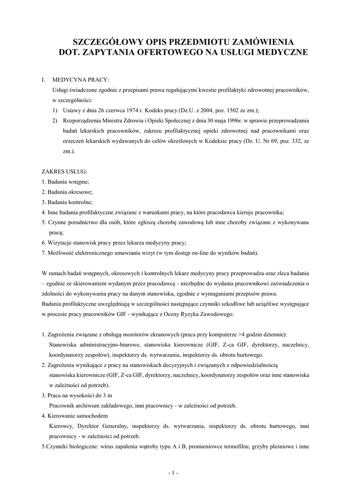 SZCZEGÓŁOWY OPIS PRZEDMIOTU ZAMÓWIENIA DOT. ZAPYTANIA OFERTOWEGO NA USŁUGI MEDYCZNE I. MEDYCYNA PRACY: Usługi świadczone zgodnie z przepisami prawa regulującymi kwestie profilaktyki zdrowotnej pracowników, w szczególności: 1) Ustawy z dnia 26 czerwca 1974 r. Kodeks pracy (Dz.U. z 2004, poz. 1502 ze zm.); 2) Rozporządzenia Ministra Zdrowia i Opieki Społecznej z dnia 30 maja 1996r. w sprawie przeprowadzania badań lekarskich pracowników, zakresu profilaktycznej opieki zdrowotnej nad pracownikami oraz orzeczeń lekarskich wydawanych do celów określonych w Kodeksie pracy (Dz. U. Nr 69, poz. 332, ze zm.). ZAKRES USŁUG: 1. Badania wstępne; 2. Badania okresowe; 3. Badania kontrolne; 4. Inne badania profilaktyczne związane z warunkami pracy, na które pracodawca kieruje pracownika; 5. Czynne poradnictwo dla osób, które zgłoszą chorobę zawodową lub inne choroby związane z wykonywana pracą; 6. Wizytacje stanowisk pracy przez lekarza medycyny pracy; 7. Możliwość elektronicznego umawiania wizyt (w tym dostęp on-line do wyników badań). W ramach badań wstępnych, okresowych i kontrolnych lekarz medycyny pracy przeprowadza oraz zleca badania – zgodnie ze skierowaniem wydanym przez pracodawcę - niezbędne do wydania pracownikowi zaświadczenia o zdolności do wykonywania pracy na danym stanowisku, zgodnie z wymaganiami przepisów prawa. Badania profilaktyczne uwzględniają w szczególności następujące czynniki szkodliwe lub uciążliwe występujące w procesie pracy pracowników GIF - wynikające z Oceny Ryzyka Zawodowego: 1. Zagrożenia związane z obsługą monitorów ekranowych (praca przy komputerze >4 godzin dziennie): Stanowiska administracyjno-biurowe, stanowiska kierownicze (GIF, Z-ca GIF, dyrektorzy, naczelnicy, koordynatorzy zespołów), inspektorzy ds. wytwarzania, inspektorzy ds. obrotu hurtowego. 2. Zagrożenia wynikające z pracy na stanowiskach decyzyjnych i związanych z odpowiedzialnością stanowiska kierownicze (GIF, Z-ca GIF, dyrektorzy, naczelnicy, koordynatorzy zespołów oraz inne stanowiska w zależności od potrzeb). 3. Praca na wysokości do 3 m Pracownik archiwum zakładowego, inni pracownicy - w zależności od potrzeb. 4. Kierowanie samochodem Kierowcy, Dyrektor Generalny, inspektorzy ds. wytwarzania, inspektorzy ds. obrotu hurtowego, inni pracownicy - w zależności od potrzeb. 5.Czynniki biologiczne: wirus zapalenia wątroby typu A i B, promieniowce termofilne, grzyby pleśniowe i inne -1- o działaniu uczulającym - inspektorzy ds. wytwarzania. 6. W ramach świadczonych usług placówka medycyny pracy wykonuje szczepienia ochronne przeciwko wirusowi zapalenia wątroby typu A i B oraz ewentualnie inne szczepienia ograniczające ryzyko zawodowe związane z kontaktami z ww. czynnikami biologicznymi. 7. Analiza stanu zdrowia pracowników, występowanie chorób zawodowych i ich przyczyn. 8. Gromadzenie, przechowywanie i przetwarzanie informacji o narażeniu zawodowym i stanie zdrowia osób objętych profilaktyczną opieką zdrowotną. 9. Inicjowanie działań wśród pracowników na rzecz ochrony ich zdrowia. 10. Czynne poradnictwo dla osób chorych na choroby zawodowe lub choroby związane z wykonywaną pracą. 11. Wystawianie orzeczeń przez lekarza. 12.Wizytacja stanowisk pracy pracowników przez lekarza. 13.Zapewnienie udziału Lekarza Medycyny Pracy w zakładowych komisjach BHP. 14. Badania medycyny pracy przeprowadzane w ramach miesięcznego abonamentu będą zawierać pełny zakres obejmujący wszystkie badania i konsultacje lekarskie wymagane obowiązującymi przepisami prawa dla pracownika na danym stanowisku pracy, na które kieruje pracodawca wydając skierowanie. 15. Konsultacje lekarza medycyny podróży w związku z podróżami służbowymi pracowników oraz zlecone przez niego szczepienia i badania diagnostyczne. II. SPECJALISTYCZNE USŁUGI MEDYCZNE - dla uprawnionych pracowników oraz w ramach dodatkowego abonamentu dla członków rodzin. W ramach abonamentu nielimitowany dostęp do konsultacji lekarzy specjalistów bez skierowania w 1. zakresie specjalizacji w szczególności w sytuacjach chorobowych, leczenia i zaostrzenia chorób przewlekłych oraz pomoc w nagłych zachorowaniach. 2.Konsultacje specjalistyczne powinny obejmować: 3. 1) wywiad 2) porada specjalisty wraz z czynnościami podstawowymi niezbędnymi do postawienia diagnozy 3) podjęcia właściwej decyzji terapeutycznej 4) monitorowania leczenia. Dostęp do lekarzy niżej wymienionych specjalności bez skierowania: 1) choroby wewnętrzne - internista i/lub lekarz medycyny rodzinnej 2) alergologia 3) chirurgia 4) dermatologia 5) diabetologia 6) endokrynologia 7) gastroenterologia 8) ginekologia i położnictwo 9) hematologia 10) kardiologia 11) laryngologia -2- 12) nefrologia 13) neurologia 14) okulistyka 15) ortopedia 16) proktologia 17) pulmonologia 18) urologia 19) onkologia 20) reumatologia 21) dietetyk 22) lekarz rehabilitacji 23) lekarze dyżurni - lekarze dostępni w ramach dyżurów w placówkach Wykonawcy. 4. Dostęp do lekarzy pozostałych specjalności ze skierowaniem, w tym konsultacje profesorskie bez żadnej dodatkowej odpłatności 5. Nielimitowana liczba badań diagnostycznych: 1) Diagnostyka laboratoryjna: a) badania hematologiczne i koaguolologiczne: eozynofilia bezwzględna, leukocyty, OB, morfologia krwi obwodowej z rozmazem, płytki krwi, retikulocyty, czas protrombinowy (tromboplastynowy, PT, INR), czas trombinowy (TT), czas tromboplastynowy (INR), D-Dimery, APTT, fibrynogen, hemoglobina glikolowana; b) badania biochemiczne i hormonalne oraz markery nowotworowe: białko c-reaktywne, ALATaminotransferaza alaninowa, ASPAT-aminotransferaza asparaginianowa, amylaza, albuminy, białko całkowite, bilirubina całkowita, bilirubina bezpośrednia, chlorki, cholesterol całkowity, cholesterol HDL, cholesterol LDL, kinaza kreatynowa (CPK), dehydrogenaza mleczanowa, fosfataza zasadowa, fosfataza kwaśna, fosforany, GGTP -gamma- glutamylotranspeptyd