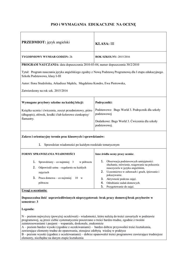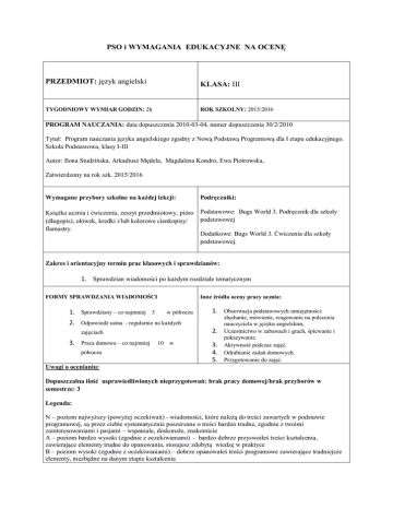 PSO i WYMAGANIA EDUKACYJNE NA OCENĘ PRZEDMIOT: język angielski KLASA: III TYGODNIOWY WYMIAR GODZIN: 2h ROK SZKOLNY: 2015/2016 PROGRAM NAUCZANIA: data dopuszczenia 2010-03-04, numer dopuszczenia 30/2/2010 Tytuł: Program nauczania języka angielskiego zgodny z Nową Podstawą Programową dla I etapu edukacyjnego. Szkoła Podstawowa, klasy I-III Autor: Ilona Studzińska, Arkadiusz Mędela, Magdalena Kondro, Ewa Piotrowska, Zatwierdzony na rok szk. 2015/2016 Wymagane przybory szkolne na każdej lekcji: Podręczniki: Książka ucznia i ćwiczenia, zeszyt przedmiotowy, pióro Podstawowe: Bugs World 3. Podręcznik dla szkoły podstawowej (długopis), ołówek, kredki i/lub kolorowe cienkopisy/ flamastry. Dodatkowe: Bugs World 3. Ćwiczenia dla szkoły podstawowej. Zakres i orientacyjny termin prac klasowych i sprawdzianów: 1. Sprawdzian wiadomości po każdym rozdziale tematycznym Inne źródła oceny pracy ucznia:. FORMY SPRAWDZANIA WIADOMOŚCI 1. Sprawdziany – co najmniej 3 w półroczu 1. Obserwacja podstawowych umiejętności: 2. Odpowiedź ustna - regularnie na każdych 2. zajęciach 3. Praca domowa – co najmniej półroczu 10 w 3. 4. 5. słuchanie, mówienie, reagowanie na polecenia nauczyciela w języku angielskim, Uczestnictwo w zabawach i grach, śpiewanie i pokazywanie. Aktywność podczas zajęć. Odrabianie zadań domowych. Przygotowanie do zajęć. Uwagi o ocenianiu: Dopuszczalna ilość usprawiedliwionych nieprzygotowań: brak pracy domowej/brak przyborów w semestrze: 3 Legenda: N – poziom najwyższy (powyżej oczekiwań) - wiadomości, które należą do treści zawartych w podstawie programowej, są przez ciebie systematycznie poszerzane o treści bardzo trudne, zgodnie z twoimi zainteresowaniami i pasjami – wspaniale, doskonale, znakomicie A – poziom bardzo wysoki (zgodnie z oczekiwaniami) – bardzo dobrze przyswoiłeś treści kształcenia, zawierające elementy trudne do opanowania, stosujesz zdobytą wiedzę w praktyce B – poziom wysoki (zgodnie z oczekiwaniami) – dobrze opanowałeś treści programowe zawierające trudniejsze elementy, niezbędne na danym etapie kształcenia C – poziom średni (zgodnie z oczekiwaniami) – opanowałeś ważne i uniwersalne treści, stanowiące podstawę poszerzania wiedzy na wyższych poziomach D – poziom niski (poniżej oczekiwań) – pomimo włożonego wysiłku, twoje umiejętności są niewystarczające, masz duże braki E – poziom najniższy (poniżej oczekiwań) – nie opanowałeś podstawowych treści i umiejętności programowych, nie podejmowałeś wysiłku i odmawiałeś wykonania zadania N otrzymuje uczeń, który: Potrafi się przedstawić, zadać pytanie o imię Potrafi określić samopoczucie oraz zapytać o nie Pyta o wiek i odpowiada na pytanie. Pyta o ulubione rzeczy i odpowiada na to pytanie Zna nazwy zwierząt i opisuje je Zna słownictwo: części ciała, nazwy członków rodziny, nazwy ubrań, nazwy przyborów szkolnych, nazwy jedzenia, zastawy stołowej, nazwy sportów, nazwy liczb 1-100, nazwy miesięcy, dni tygodnia, pór dnia, pogody Określa godziny Stosuje czasownik can Opisuje innych ludzi używając przymiotników, wygląd zewnętrzny, ubiór Rozumie polecenia n-la i reaguje na nie Rozumie sens historyjek i bajek Samodzielnie wykonuje zadania w podręczniku i ćwiczeniach Potrafi wyróżnić proste informacje z tekstu słuchanego Wypowiada się słowami, zdaniami Posługuje się słownictwem poznanym na lekcjach Udziela odpowiedzi na pytania i sam je zadaje Czyta ze zrozumieniem Czyta z podziałem na role Czyta historyjki Zna alfabet Potrafi przeliterować wybrane wyrazy Poprawnie czyta nowe słowa Pisze poprawnie ze słuchu i z pamięci Potrafi napisać krótki tekst wg wzoru Potrafi samodzielnie zredagować krótki tekst Rozpoznaje znaczenie słów (usłyszanych, napisanych) Prawidłowo używa liczby mnogiej Opanował wprowadzone słownictwo Jest pracowity, aktywny Uważa na zajęciach Potrafi pracować samodzielnie i w zespole Prowadzi słowniczek obrazkowy Śpiewa poznane piosenki Odrabia zadania domowe A otrzymuje uczeń, który: Potrafi się przedstawić, zadać pytanie o imię Potrafi określić samopoczucie oraz zapytać o nie Pyta o wiek i odpowiada na pytanie. Pyta o ulubione rzeczy i odpowiada na to pytanie Rozumie polecenia n-la i reaguje na nie Zna większość poznanego słownictwa: części ciała, nazwy członków rodziny, nazwy ubrań, nazwy przyborów szkolnych, nazwy jedzenia, zastawy stołowej, nazwy sportów, nazwy liczb 1-100, nazwy miesięcy, dni tygodnia, pór dnia, pogody Określa godziny Stosuje czasownik can Opisuje innych ludzi używając przymiotników, wygląd zewnętrzny, ubiór Rozumie polecenia n-la i reaguje na nie Samodzielnie wykonuje zadania w podręczniku i ćwiczeniach Rozumie sens historyjek i bajek Potrafi wyróżnić proste informacje z tekstu słuchanego Wypowiada się słowami, zdaniami Posługuje się słownictwem poznanym na lekcjach Udziela odpowiedzi na pytania i sam je zadaje (z małą pomocą n-la) Czyta zdaniami Poprawnie czyta nowe słowa ( z mała pomocą n-la) Zazwyczaj pisze poprawnie ze słuchu i z pamięci Potrafi napisać krótki tekst wg wzoru Rozpoznaje znaczenie słów (usłyszanych) Prawidłowo używa liczby mnogiej ( z pomocą n-la) Prawie całkowicie opanował wprowadzone słownictwo Jest pracowity, aktywny Uważa na zajęciach Potrafi pracować samodzielnie i w zespole Prowadzi słowniczek obrazkowy Śpiewa poznane piosenki Odrabia zadania domowe B otrzymuje uczeń, który: Potrafi się przedstawić, zadać pytanie o imię Potrafi określić samopoczucie oraz zapytać o nie Pyta o wiek i odpowiada na pytanie. Popełnia błędy przy przeliterowywaniu słów Opisuje innych ludzi z pomocą n-la Rozumie polecenia n-la i reaguje na nie Rozumie sens historyjek Potrafi wyróżnić proste informacje z tekstu słuchanego Wypowiada się słowami Posługuje się słownictwem poznanym na lekcjach Udziela odpowiedzi na pytania i sam j