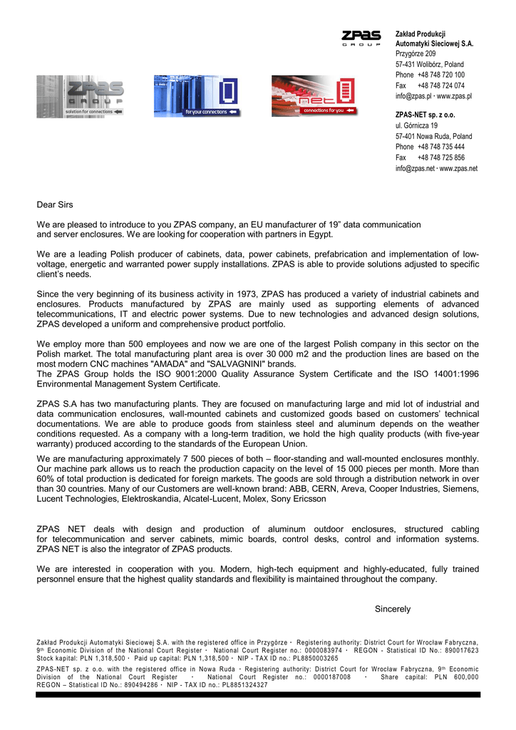 Zakład Produkcji Automatyki Sieciowej S.A. Przygórze 209 57-431 Wolibórz, Poland Phone +48 748 720 100 Fax +48 748 724 074 [email protected] · www.zpas.pl ZPAS-NET sp. z o.o. ul. Górnicza 19 57-401 Nowa Ruda, Poland Phone +48 748 735 444 Fax +48 748 725 856 [email protected] · www.zpas.net Dear Sirs We are pleased to introduce to you ZPAS company, an EU manufacturer of 19” data communication and server enclosures. We are looking for cooperation with partners in Egypt. We are a leading Polish producer of cabinets, data, power cabinets, prefabrication and implementation of lowvoltage, energetic and warranted power supply installations. ZPAS is able to provide solutions adjusted to specific client’s needs. Since the very beginning of its business activity in 1973, ZPAS has produced a variety of industrial cabinets and enclosures. Products manufactured by ZPAS are mainly used as supporting elements of advanced telecommunications, IT and electric power systems. Due to new technologies and advanced design solutions, ZPAS developed a uniform and comprehensive product portfolio. We employ more than 500 employees and now we are one of the largest Polish company in this sector on the Polish market. The total manufacturing plant area is over 30 000 m2 and the production lines are based on the most modern CNC machines "AMADA" and "SALVAGNINI" brands. The ZPAS Group holds the ISO 9001:2000 Quality Assurance System Certificate and the ISO 14001:1996 Environmental Management System Certificate. ZPAS S.A has two manufacturing plants. They are focused on manufacturing large and mid lot of industrial and data communication enclosures, wall-mounted cabinets and customized goods based on customers’ technical documentations. We are able to produce goods from stainless steel and aluminum depends on the weather conditions requested. As a company with a long-term tradition, we hold the high quality products (with five-year warranty) produced according to the standards of the European Union. We are manufacturing approximately 7 500 pieces of both – floor-standing and wall-mounted enclosures monthly. Our machine park allows us to reach the production capacity on the level of 15 000 pieces per month. More than 60% of total production is dedicated for foreign markets. The goods are sold through a distribution network in over than 30 countries. Many of our Customers are well-known brand: ABB, CERN, Areva, Cooper Industries, Siemens, Lucent Technologies, Elektroskandia, Alcatel-Lucent, Molex, Sony Ericsson ZPAS NET deals with design and production of aluminum outdoor enclosures, structured cabling for telecommunication and server cabinets, mimic boards, control desks, control and information systems. ZPAS NET is also the integrator of ZPAS products. We are interested in cooperation with you. Modern, high-tech equipment and highly-educated, fully trained personnel ensure that the highest quality standards and flexibility is maintained throughout the company. Sincerely Z akład Produkc ji Aut om at yk i Sieciow ej S. A. wit h t he regist ered offic e in Przy górz e · R egist ering aut hority: D istrict C ourt f or W roc ław F abry cz na, 9 th Ec onom ic D ivision of t he N ational C ourt R egist er · N ational C ourt R egist er no.: 0000083974 · R EG ON - St atistic al I D N o.: 89001762 3 St ock k apit al: PLN 1, 318, 500 · Paid up c apit al: PLN 1, 318, 500 · NI P - T AX I D no.: PL8850003265 Z PAS-N ET s p. z o. o. wit h t he regist ered offic e in N ow a R uda · R egist ering aut hority: District C ourt f or W roc ław F abrycz na, 9 th Ec onom ic Division of t he N ational C ourt R egist er · National C ourt R egist er no.: 0000187008 · Share c apit al: PLN 600, 00 0 R EG ON – St atistic al I D N o.: 890494286 · NI P - T AX I D no.: PL88513 24327 Page 2 Contact person: Marek Górecki E-mail: [email protected] Phone +48 748 720 155, mobile +48 609 569 196, fax +48 748 724 074