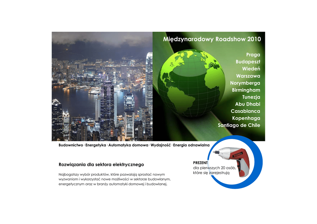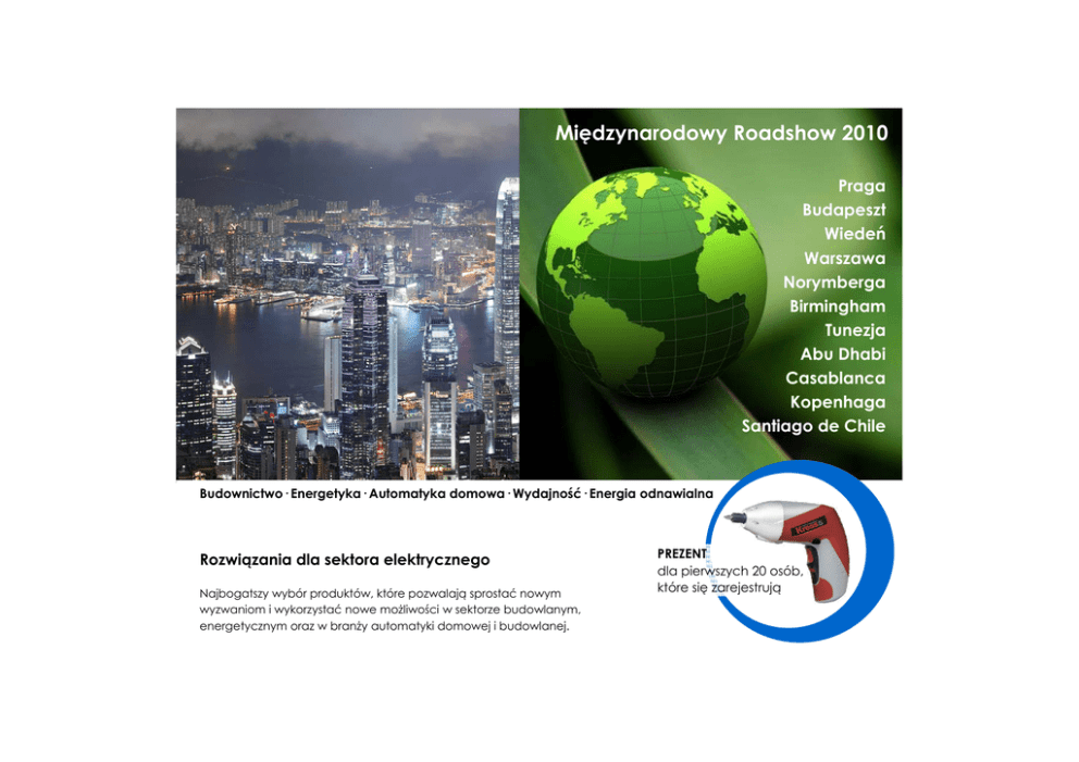 Międzynarodowy Roadshow 2010 Praga Budapeszt Wiedeń Warszawa Norymberga Birmingham Tunezja Abu Dhabi Casablanca Kopenhaga Santiago de Chile Budownictwo· Energetyka· Automatyka domowa· Wydajność· Energia odnawialna Rozwiązania dla sektora elektrycznego Najbogatszy wybór produktów, które pozwalają sprostać nowym wyzwaniom i wykorzystać nowe możliwości w sektorze budowlanym, energetycznym oraz w branży automatyki domowej i budowlanej. PREZENT dla pierwszych 20 osób, które się zarejestrują Warszawa, 6 października 2010 Hotel MERCURE Fryderyk Chopin Warsaw al.Jana Pawła II 22, 00-133 Warszawa 8:30 – 9:00 Przyjęcie i rejestracja uczestników 9:00 -12:00 Sesja ENERGETYKA – PRZEMYSŁ IMEFY, transformatory: Transformatory mocy i dystrybucji SACI, przyrządy do pomiaru i kontroli: Droga do wydajności energetycznej prowadzi przez pomiary i kontrolę wielkości elektrycznych Formularz do BEZPŁATNEJ rejestracji Nazwa firmy: …………………………………………..… SALICRU, Energoelektronika i wydajność energetyczna: Oszczędność energii w oświetleniu publicznym Imię i nazwisko: ………..…….………………………..… SOFAMEL, bezpieczeństwo i łączność: 5 złotych zasad bezpieczeństwa prac elektrycznych na podstacjach i liniach napowietrznych oraz Nowa technologia bimetalicznych końcówek kablowych ………………….…………………………………………….. Stanowisko: ……..……………………………………….. Adres: …….. …………...………….……………………….. ……………………..………………………………………… Telefon: …………………………………………………….. E-mail: ………..…………………………………………….. Prosimy o wypełnienie danych kontaktowych i przesłanie do nas formularza faksem lub drogą mailową. Oficjalny partner Roadshow 2010 9:00 -12:00 Sesja BUDOWNICTWO – WYKONAWSTWO APOLO, Systemy mocujące: Czas na wagę złota FERMAX, Systemy drzwi wejściowych i kontroli dostępu: Audio i wideodomofony FERMAX Jakość i Design SODECA, Systemy wentylacyjne: Urządzenia energooszczędne 12:00 – 13:00 Poczęstunek Imprezę sponsorują:: Zarejestrować można się również wysyłając e-mail na adres: [email protected]