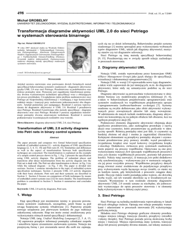 498 PAK v ol . 5 5 , nr 7/ 2 0 0 9 Michał GROBELNY UNIWERSYTET ZIELONOGÓ RSK I, WYD ZIA Ł ELEK TROTEC H NIK I, INF ORM A TYK I I TELEK OM UNIK A C J I Transformacja diagramów aktywności UML 2.0 do sieci P etriego w systemach sterowania b inarnego Mgr inż. Michał GROBELNY W ro k u 2 0 0 7 u k o ń c z y ł s tu d ia n a W y d z ia le E le k tro te c h n ik i, In fo rm a ty k i i T e le k o m u n ik a c ji U n iw e rs y te tu Z ie lo n o g ó rs k ie g o . A b s o lw e n t Z in te g ro w a n y c h S tu d ió w Z a g ra n ic z n y c h U n iw e rs y te tu Z ie lo n o g ó rs k ie g o i F a c h h o c h s c h u l e G i e s s e n -F r i e d b e r g ( N i e m c y ) . U c z e s tn ik s tu d ió w d o k to ra n c k ic h . Z a in te re s o w a n ia n a u k o w e o b e jm u ją m e to d y s p e c y fik a c ji o s a d z o n y c h s y s te m ó w s te ro w a n ia . e-m a i l : M . G r o b el n y @ w ei t . u z . z g o r a . p l S tr e s z c z e n ie Art y k u ł z aw iera om ó w ienie oraz p oró w nanie dw ó ch f orm al ny ch m et od s p ecy f ik acj i b ehaw ioral nej s y s t em ó w os adz ony ch - diag ram ó w ak t y w noś ci j ę z y k a U M L 2 .0 oraz s ieci Pet rieg o. Prz eds t aw ione s ą p odob ień s t w a oraz ró ż nice p om ię dz y nim i. Poru s z one j es t z ag adnienie t rans f orm acj i p om ię dz y dw om a w y m ieniony m i t echnik am i s p ecy f ik acj i w raz z ob raz u j ą cy m t en p roces p rz y k ł adem . U w z g l ę dniono t ak ż e p rob l em nadm iarow oś ci s ieci Pet rieg o p o b ez p oś redniej t rans f orm acj i i w y nik aj ą cą z t eg o k oniecz noś ć redu k cj i m iej s c i t ranz y cj i p rz y z achow aniu j ednoz nacz noś ci ob u diag ram ó w . Art y k u ł p odz iel ony j es t nas t ę p u j ą co. R oz dz iał 2 z aw iera w p row adz enie do diag ram ó w ak t y w noś ci w U M L 2 .0 . R oz dz iał 3 p rz eds t aw ia s ieci Pet rieg o. R oz dz iał 4 p oró w nu j e ob ie m et ody s p ecy f ik acj i - diag ram y ak t y w noś ci oraz s ieci Pet rieg o. R oz dz iał 5 p oru s z a z ag adnienie t rans f orm acj i p om ię dz y dw om a om aw iany m i t echnik am i. R oz dz iał 6 z aw iera p ods u m ow anie w cz eś niej s z y ch roz dz iał ó w oraz w nios k i. S ł o w a k l u c z o w e : diag ram y ak t y w noś ci U M L 2 .0 , s ieci Pet rieg o. T r an s f o r m at io n o f U ML 2 . 0 act iv it y d iag r am s in t o P e t r i n e t s in b in ar y co n t r o l s y s t e m s A b str a c t T he p ap er p res ent s and com p ares t w o f orm al b ehav iou ral s p ecif icat ion m et hods of em b edded s y s t em s [ 1 ] – act iv it y diag ram s of U M L s p ecif icat ion l ang u ag e [ 2 , 3 , 4 , 1 3 , 1 4 ] and Pet ri net s [ 9 , 1 5 ] . S im il arit ies and dif f erences as w el l as t he as p ect of t rans f orm at ion b et w een b ot h s p ecif icat ion t echniq u es are concerned. T he t rans f orm at ion is ex p l ained on t he ex am p l e of a s am p l e cont rol p roces s s how n in F ig . 1 . F ig . 2 p res ent s t he s p ecif icat ion u s ing U M L act iv it y diag ram . T he p rob l em of redu ndant p l aces and t rans it ions af t er direct t rans f orm at ion f rom t he act iv it y diag ram int o t he Pet ri net is deal t w it h. T he Pet ri net af t er t rans f orm at ion is s how n in F ig . 3 ( a) , w hil e t he redu ced diag ram - in F ig . 3 ( b ) . T he p ap er is div ided int o s ect ions . S ect ion 1 cont ains int rodu ct ion t o t he t op ic of em b edded s y s t em s p ecif icat ion t echniq u es . S ect ion 2 p res ent s U M L 2 .0 act iv it y diag ram s w it h t heir b as ic el em ent s . Pet ri net s and t heir s y nt act ic are des crib ed in S ect ion 3 . S ect ion 4 f ocu s es on com p aris on of b ot h t echniq u es b y m eans of em b edded cont rol s y s t em s ( s ee [ 1 2 ] f or m ore det ail s ) . T he t rans f orm at ion p rob l em is cons idered in S ect ion 5 . S ect ion 6 s u m m aris es and concl u des t he p ap er. K e y w o r d s : U M L 2 .0 act iv it y diag ram s , Pet ri net s . 1 . W s tę p E t ap s p ec yf ik ac j i j es t niezm iernie is t ot ny w p roc es ie p ows t awania s ys t em ó w os ad zonyc h , s zc zeg ó lnie, j eż eli b rane s ą p od u wag ę b ezp iec zne s ys t em y wb u d owane [ 1 ] . Pop rawny p roj ek t noweg o u rzą d zenia j es t p ierws zym k rok iem d o j eg o realizac j i zak oń c zonej s u k c es em . E t ap t en m oż e zos t ać zrealizowany p rzy wyk orzys t aniu ró ż nyc h m et od s p ec yf ik ac j i i d ok u m ent ac j i. N ot ac j a U M L (ang . Unified Modelling Language) [ 2 , 3 ,4 , 1 3 , 1 4 ] u s p rawnia p rzep ł yw inf orm ac j i p om ię d zy c zł onk am i zes p oł u i u m oż liwia lep s ze zrozu m ienie zac h owania s ys t em u . N ot ac j a m a p rzej rzys t ą f orm ę i j es t zrozu m iał a nawet d la os ó b nie zaj m u j ą - c yc h s ię na c o d zień inf orm at yk ą . B eh awioralny p roj ek t s ys t em u os ad zoneg o [ 1 ] m oż na s p orzą d zić p rzy wyk orzys t aniu wyb ranyc h t yp ó w d iag ram ó w U M L , t ak ic h j ak d iag ram y ak t ywnoś c i, m as zyny s t anó w c zy t eż d iag ram ó w s ek wenc j i. S iec i Pet rieg o s ą inną m et od ą s p ec yf ik ac j i b eh awioralnej [ 9 , 1 5 ] . Przed s t awiaj ą one w zwię zł y s p os ó b relac j e zac h od zą c e w p roc es ac h s t erowania. 2 . D iag r am y ak t y w n o ś ci U ML N ot ac j a U M L zos t ał a wp rowad zona p rzez k ons orc j u m O M G (O b j ec t Managem ent G r oup ) j ak o j ę zyk s ł u ż ą c y d o s p ec yf ik ac j i, wizu alizac j i i d ok u m ent ac j i op rog ram owania [ 3 ] . N ot ac j a U M L w wers j i 2 .0 wp rowad ził a nowe t yp y d iag ram ó w, a t ak ż e wiele u s p rawnień d o j u ż is t niej ą c yc h , m .in. d o d iag ram ó w ak t ywnoś c i, k t ó re s t ał y s ię s em ant yc znie p od ob ne s ą d o s iec i Pet rieg o. D iag ram y ak t ywnoś c i s ą p ows zec h nie wyk orzys t ywane w d zied zinie b i