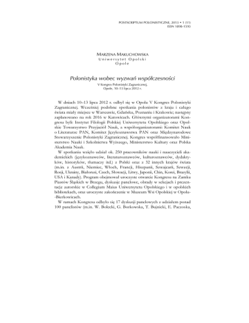 POSTSCRIPTUM POLONISTYCZNE, 2013 • 1 (11) ISSN 1898-1593 MARZENA MAKUCHOWSKA Uniwersytet Opolski Opole Polonistyka wobec wyzwań współczesności V Kongres Polonistyki Zagranicznej, Opole, 10–13 lipca 2012 r. W dniach 10–13 lipca 2012 r. odbył się w Opolu V Kongres Polonistyki Zagranicznej. Wcześniej podobne spotkania polonistów z kraju i całego świata miały miejsce w Warszawie, Gdańsku, Poznaniu i Krakowie; następny zaplanowano na rok 2016 w Katowicach. Głównymi organizatorami Kongresu byli: Instytut Filologii Polskiej Uniwersytetu Opolskiego oraz Opolskie Towarzystwo Przyjaciół Nauk, a współorganizatorami: Komitet Nauk o Literaturze PAN, Komitet Językoznawstwa PAN oraz Międzynarodowe Stowarzyszenie Polonistyki Zagranicznej. Kongres współfinansowało Ministerstwo Nauki i Szkolnictwa Wyższego, Ministerstwo Kultury oraz Polska Akademia Nauk. W spotkaniu wzięło udział ok. 250 pracowników nauki i nauczycieli akademickich (językoznawców, literaturoznawców, kulturoznawców, dydaktyków, historyków, tłumaczy itd.) z Polski oraz z 32 innych krajów świata (m.in. z Austrii, Niemiec, Włoch, Francji, Hiszpanii, Szwajcarii, Szwecji, Rosji, Ukrainy, Białorusi, Czech, Słowacji, Litwy, Japonii, Chin, Korei, Brazylii, USA i Kanady). Program obejmował uroczyste otwarcie Kongresu na Zamku Piastów Śląskich w Brzegu, dyskusje panelowe, obrady w sekcjach i prezentacje autorskie w Collegium Maius Uniwersytetu Opolskiego i w opolskich bibliotekach, oraz uroczyste zakończenie w Muzeum Wsi Opolskiej w Opolu-Bierkowicach. W ramach Kongresu odbyło się 17 dyskusji panelowych z udziałem ponad 100 panelistów (m.in. W. Bolecki, G. Borkowska, T. Bujnicki, E. Paczoska, 268 POSTSCRIPTUM POLONISTYCZNE, 2013 • 1 (11) A. Lipatow, W. Miodunka, J. Tambor, R. Cudak, A. Dąbrowska, L. Madelska, B. Bakuła, L. Wiśniewska, W. Chlebda, J. Bartmiński, A. Niewiara, S. Dubisz, M. Grochowski, R. Fieguth, K. Van Heuckelom, A. Nagórko, A. Nowicka-Jeżowa, M. Delaperrière, Z. Solski, H. Włodarczyk, Z. Zarębianka, M. Masłowski, S.J. Żurek). W 40 sekcjach wygłoszono ok. 150 referatów (80 przez gości zagranicznych, 70 przez uczestników polskich). Dokonano też 6 prezentacji autorskich, na których m.in. przedstawione zostały: elektroniczny Wielki słownik języka polskiego PAN (P. Żmigrodzki i in.), serie wydawnicze Badania Polonistyczne za Granicą (B. Śniecikowska i in.) i Nauka o Literaturze Polskiej za Granicą (A. Nowicka-Jeżowa, I. Jokiel), półrocznik Postscriptum Polonistyczne (R. Cudak i in.) oraz książka M. Delaperrierère. Podczas uroczystego otwarcia Kongresu w Muzeum Piastów Śląskich w Brzegu wyróżniono tytułem doktora honoris causa Uniwersytetu Opolskiego dwóch wybitnych polonistów zagranicznych: prof. dra Cheonga Byunga Kwona z Korei Południowej, który m.in. przetłumaczył na język koreański Pana Tadeusza, oraz prof. dr. Rolfa Fiegutha ze Szwajcarii, równie zasłużonego wydawcy i badacza literatury polskiej. Oprócz tego prof. dr Aleksander Lipatow z Rosji (Moskwa) został uhonorowany nagrodą im. Jana Kochanowskiego Ministra Kultury i Dziedzictwa Narodowego, a Natalia Ananiewa (Moskwa), Andriej Babanow (Sankt Petersburg), Algis Kaleda (Wilno), Ałła Krawczuk (Lwów) i Swietłana Musijenko (Grodno) otrzymali Medale Mickiewicz-Puszkin przyznane przez Stowarzyszenie Współpracy Polska-Wschód. 11 lipca odbyło się walne posiedzenie Międzynarodowego Stowarzyszenia Studiów Polonistycznych, na którym wybrano nowy zarząd Stowarzyszenia (na jego czele stanęła prof. dr hab. Magdalena Popiel z Uniwersytetu Jagiellońskiego). *** Najważniejsze cele kongresowych spotkań polonistów z całego świata wyznacza nieustająca potrzeba aktualizowania koncepcji i strategii dla polonistyki jako dziedziny działalności badawczej i edukacyjnej. Kongresy służą refleksji nad zadaniami polonistyki w aktualnych i prognozowanych na (bliższą i dalszą) przyszłość okolicznościach kulturowych, społecznych, politycznych i gospodarczych oraz wypracowaniu sposobów realizacji tych zadań dla zapewnienia jej odpowiedniego poziomu użyteczności społecznej i prestiżu. Uczestnicy Kongresu opolskiego – podczas dyskusji panelowych, obrad w sekcjach (w sumie ok. 250 wystąpień), a także w kuluarach – poszukiwali odpowiedzi na współczesne wyzwania stojące przed humanistyką MARZENA MAKUCHOWSKA: Polonistyka wobec wyzwań współczesności… 269 i polonistyką, dzielili się swymi doświadczeniami, przemyśleniami, bogatymi osiągnięciami badawczymi i dydaktycznymi. Odświeżali, umacniali i nawiązywali wzajemne kontakty, integrujące środowisko. W ramach rozważań nad obecnym miejscem polonistyki w świecie ukazano ją na tle (i jako element) studiów środkowoeuropejskich (W. Bolecki, D. Blazina, M. Bakuła). To usytuowanie polonistyki jawi się jako szansa na jej wzbogacenie (rozwój w kierunku komparatystyki, głębszych interakcji z innymi kulturami narodowymi itp.), ale także jako źródło problemów (N. Jež), a nawet pewnych zagrożeń (L. Palfalvi). Mówiono o pracy poszczególnych ośrodków – ich historii, osiągnięciach i perspektywach (m.in. A. Gall w Niemczech, K. Rikev w Bułgarii, L. Suchomłynow na Ukrainie, W. Ušinskienè i G. Różańska na Litwie, L. Nagy na Węgrzech, A. Babanov w Rosji, M. Kirszniak w Burgundii, H. Siewierski w Brazylii). Dyskusja toczyła się również wokół kwestii integracji środowiska polonistycznego i współpracy ośrodków (R. Cudak, J. Ławski, A. Dąbrowska), możliwości skuteczniejszej konfrontacji i syntezy osiągnięć, z większym wyczuciem innych (nie tylko polskich i „polonocentrycznych”) perspektyw (A. Dąbrowska). Szczególnie ważną kategorią badawczą okazała się „polskość”, jej pojmowanie, znaczenie i stosunek do niej, zarówno wewnątrz kultury własnej, jak w kulturach obcych. Obrazy (auto- i heterostereotypy) Polski, Polaka (Polki) i zespołu cech „typowo p