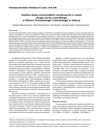 Perinatologia, Neonatologia i Ginekologia, tom 2, zeszyt 1, 53-56, 2009 Analiza stanu noworodków urodzonych o czasie drogą cięcia cesarskiego w Klinice Perinatologii i Ginekologii w Zabrzu BARBARA KRÓLAK-OLEJNIK1, ZENON PIOTR HALABA2, JACEK KARPE3, ANNA KRAJEWSKA4, KAROLINA HALABA4 Streszczenie W ostatnim dwudziestoleciu obserwujemy narastający wskaźnik cięć cesarskich. Korzyści wynikające z cięcia cesarskiego dla noworodka są niewielkie lub trudne do określenia. Celem pracy jest porównanie pourodzeniowego stanu klinicznego, parametrów antropomerycznych i czasu hospitalizacji, noworodków urodzonych o czasie, drogą cięcia cesarskiego oraz drogą pochwową. Spośród 2478 noworodków urodzonych w Klinice Perinatologii i Ginekologii w Zabrzu w latach 2000-2001 i 2007-2008, wyodrębniono grupę 1648 spełniających kryteria włączenia do badań. Odsetek noworodków urodzonych drogą cięcia cesarskiego wynosił odpowiednio 66,91% i 65,8% . Nie obserwowano znamiennych statystycznie różnic w ocenie noworodków w skali Apgar w 1. i 3. minucie. Spośród parametrów antropometrycznych masa i długość ciała oraz obwód klatki piersiowej były mniejsze u dzieci urodzonych drogą cięcia cesarskiego, ale jedynie różnice w masie ciała były istotne statystycznie (p = 0,001). Dzieci urodzone siłami natury miały znamiennie statystycznie większy obwód głowy (p = 0,002). Czas hospitalizacji w obu analizowanych grupach nie różnił się istotnie statystycznie. Wysoki odsetek cięć cesarskich wynikał ze stopnia referencyjności ośrodka. Analiza nie wykazała korzyści dla noworodka wynikających ze sposobu zakończenia ciąży. Słowa kluczowe: cięcie cesarskie, poród o czasie, noworodek W ostatnim dwudziestoleciu obserwujemy narastający wskaźnik cięć cesarskich, które coraz częściej stanowią sposób na problemy pojawiające się w czasie porodu. Zrozumiały jest wysoki odsetek operacyjnego ukończenia ciąży w ośrodkach III stopnia referencyjności, w których hospitalizowane są pacjentki z ciążą powikłaną. Jednakże również w oddziałach I stopnia referencyjności odsetek ten jest bardzo wysoki i sięga 35%. Zgodnie z zaleceniami Światowej Organizacji Zdrowia z 1985 r. częstość cięć cesarskich nie powinna być większa niż 10-15% wszystkich porodów, a według opinii Amerykańskiego Kolegium Położników i Ginekologów z 2000 r. odsetek ten nie powinien przekroczyć 15% [1, 2]. W polskich szpitalach i klinikach odsetek waha się od 20 do 50% [3]. Wielokrotnie stroną dążącą do porodu operacyjnego jest kobieta ciężarna, który zwykle uważa cięcie cesarskie za bezpieczniejsze dla dziecka. Stanowisko polskich położników i prawników [4, 5] jest jednoznaczne. Jeśli nie ma wskazań uzasadnionych czynnikami medycznymi, lekarz ma obowiązek pouczyć pacjentkę o możliwościach przeprowadzenia porodu siłami i drogami natury. W świetle art. 160 § 2 Kodeksu Karnego dopuszczenie do poważnego zabiegu operacyjnego oczywiście zbędnego w świetle wiedzy medycznej i doświadczenia lekarskiego, które naraża kobietę na bezpośrednie niebezpieczeństwo utraty życia albo ciężkiego uszczerbku na zdrowiu, wypełnia znamiona przestępstwa. Zgodnie z polskim prawodawstwem nie obowiązuje zatem termin cięcia cesarskiego na życzenie. Rośnie więc liczba kontrowersyjnych „wskazań okulistycznych i ortopedycznych”. Ważnym i dyskutowanym problemem położniczym jest wybór formy porodu po przebytym cięciu cesarskim [6-8]. Cięcie cesarskie jest operacją i w porównaniu z porodem siłami natury obciążane jest kilkakrotnie (3-10 razy) większym ryzykiem powikłań śród- i pooperacyjnych związanych z samą operacją [9, 10]. W każdym przypadku powinno być udokumentowane wskazaniami medycznymi. W wielu opracowaniach analizowane są wskazania do cięcia cesarskiego i ewentualne powikłania dotyczące matki [9-11]. Korzyści wynikające z cięcia cesarskiego dla noworodka są niejednokrotnie niewielkie lub trudne do określenia [12-14]. Celem pracy jest porównanie pourodzeniowego stanu klinicznego, parametrów antropomerycznych i czasu hospitalizacji, noworodków urodzonych o czasie drogą cięcia cesarskiego oraz drogą pochwową. Materiał i metody Przeprowadzono analizę retrospektywną historii rozwoju noworodków urodzonych o czasie w Klinice Perinatologii i Ginekologii w Zabrzu, Śląskiego Uniwersytetu Medycznego w Katowicach, w dwóch rocznych okresach (15.11.2000 - 15.11.2001 r. i 15.06.2007 - 15.06. 2008 r.). 1 Katedra i Oddział Kliniczny Ginekologii, Perinatologii i Neonatologii w Zabrzu, Śląski Uniwersytet Medyczny w Katowicach 2 Szpital Specjalistyczny nr 2 w Bytomiu 3 Katedra Pediatrii, Klinika Intensywnej Terapii i Patologii Noworodka w Zabrzu, Śląski Uniwersytet Medyczny w Katowicach 4 Student, Wydział Lekarski z Oddziałem Lekarsko-Dentystycznym w Zabrzu, Śląski Uniwersytet Medyczny w Katowicach 54 B. Królak-Olejnik, Z.P. Halaba, J. Karpe, A. Krajewska, K. Halaba Z badań wykluczono dzieci z wadami wrodzonymi. Noworodki podzielono na dwie grupy: urodzone drogami i siłami natury oraz drogą cięcia cesarskiego. Oceniano: czas trwania ciąży, wiek matki w dniu porodu, punktację po porodzie w skali Apgar po 1. i 3. minucie, parametry antropometryczne (masa urodzeniowa ciała, długość, obwód głowy i klatki piersiowej ) oraz długość pobytu w szpitalu. W analizie statystycznej zastosowano pakiet Statistica 8.0 PL StatSoft Inc.(2007). Po określeniu rozkładu testem Kołmogorowa-Smirnowa próby o rozkładzie normalnym testowano testem t-Studenta, wykonano również jednoczynnikową analizę wariancji (ANOVA) i test post-hoc RIR Tukeya. Dla prób o rozkładzie innym niż normalny zastosowano test U Manna-Whitneya oraz test Kruskala-Wallisa. Wyniki przedstawiono w postaci średniej i odchylenia standardowego, mediany oraz minimum i maksimum. Liczebności w wyodrębnionych grupach porównano testem chi2. J