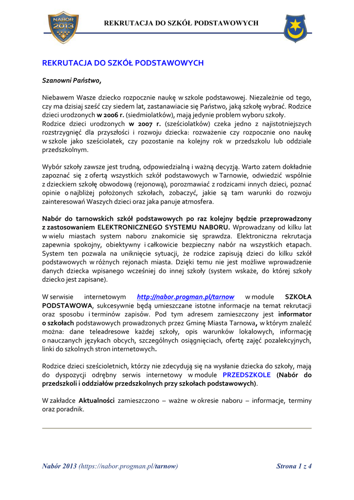 REKRUTACJA DO SZKÓŁ PODSTAWOWYCH REKRUTACJA DO SZKÓŁ PODSTAWOWYCH Szanowni Państwo, Niebawem Wasze dziecko rozpocznie naukę w szkole podstawowej. Niezależnie od tego, czy ma dzisiaj sześć czy siedem lat, zastanawiacie się Państwo, jaką szkołę wybrać. Rodzice dzieci urodzonych w 2006 r. (siedmiolatków), mają jedynie problem wyboru szkoły. Rodzice dzieci urodzonych w 2007 r. (sześciolatków) czeka jedno z najistotniejszych rozstrzygnięć dla przyszłości i rozwoju dziecka: rozważenie czy rozpocznie ono naukę w szkole jako sześciolatek, czy pozostanie na kolejny rok w przedszkolu lub oddziale przedszkolnym. Wybór szkoły zawsze jest trudną, odpowiedzialną i ważną decyzją. Warto zatem dokładnie zapoznać się z ofertą wszystkich szkół podstawowych w Tarnowie, odwiedzić wspólnie z dzieckiem szkołę obwodową (rejonową), porozmawiać z rodzicami innych dzieci, poznać opinie o najbliżej położonych szkołach, zobaczyć, jakie są tam warunki do rozwoju zainteresowań Waszych dzieci oraz jaka panuje atmosfera. Nabór do tarnowskich szkół podstawowych po raz kolejny będzie przeprowadzony z zastosowaniem ELEKTRONICZNEGO SYSTEMU NABORU. Wprowadzany od kilku lat w wielu miastach system naboru znakomicie się sprawdza. Elektroniczna rekrutacja zapewnia spokojny, obiektywny i całkowicie bezpieczny nabór na wszystkich etapach. System ten pozwala na uniknięcie sytuacji, że rodzice zapisują dzieci do kilku szkół podstawowych w różnych rejonach miasta. Dzięki temu nie jest możliwe wprowadzenie danych dziecka wpisanego wcześniej do innej szkoły (system wskaże, do której szkoły dziecko jest zapisane). W serwisie internetowym http://nabor.progman.pl/tarnow w module SZKOŁA PODSTAWOWA, sukcesywnie będą umieszczane istotne informacje na temat rekrutacji oraz sposobu i terminów zapisów. Pod tym adresem zamieszczony jest informator o szkołach podstawowych prowadzonych przez Gminę Miasta Tarnowa, w którym znaleźć można: dane teleadresowe każdej szkoły, opis warunków lokalowych, informację o nauczanych językach obcych, szczególnych osiągnięciach, ofertę zajęć pozalekcyjnych, linki do szkolnych stron internetowych. Rodzice dzieci sześcioletnich, którzy nie zdecydują się na wysłanie dziecka do szkoły, mają do dyspozycji odrębny serwis internetowy w module PRZEDSZKOLE (Nabór do przedszkoli i oddziałów przedszkolnych przy szkołach podstawowych). W zakładce Aktualności zamieszczono – ważne w okresie naboru – informacje, terminy oraz poradnik. Nabór 2013 (https://nabor.progman.pl/tarnow) Strona 1 z 4 REKRUTACJA DO SZKÓŁ PODSTAWOWYCH PRZEBIEG REKRUTACJI Do klasy pierwszej szkoły podstawowej ogólnodostępnej prowadzonej przez gminę przyjmuje się obowiązkowo dzieci zamieszkałe w obwodzie danej szkoły podstawowej oraz w dalszej kolejności na wniosek rodziców (prawnych opiekunów), dzieci zamieszkałe poza obwodem danej szkoły podstawowej, jeśli szkoła dysponuje wolnymi miejscami. Dzieci urodzone w 2006 r. (siedmiolatki) podlegają obowiązkowi szkolnemu. Zgodnie z art. 18 ustawy o systemie oświaty, rodzice dzieci siedmioletnich są zobowiązani do dopełnienia czynności związanych ze zgłoszeniem dziecka do szkoły podstawowej, a dyrektor szkoły obwodowej musi je przyjąć oraz kontrolować realizację obowiązku szkolnego. Zgłoszenia do szkoły podstawowej należy dokonać w terminie do 22 kwietnia 2013 r. Dzieci urodzone w 2007 r. (sześciolatki) - od 1 września 2013 r. mają obowiązek uczestniczenia w wychowaniu przedszkolnym lub mogą pójść do szkoły. Jeżeli rodzic decyduje się na posłanie dziecka do szkoły jako sześciolatka we wrześniu 2013 r., to zgłoszenie do szkoły podstawowej należy dokonać w terminie do 22 kwietnia 2013 r. Uwaga! Warunkiem przyjęcia dziecka sześcioletniego do szkoły podstawowej w roku szkolnym 2013/2014 – na wniosek rodziców – jest wcześniejsze objęcie dziecka wychowaniem przedszkolnym oraz posiadanie przez szkołę warunków organizacyjnych umożliwiających dzieciom sześcioletnim podjęcie nauki w szkole. Jeżeli Państwa dzieci nie były dotychczas objęte żadną formą wychowania przedszkolnego, będą mogły zostać przyjęte do szkoły podstawowej, jeśli uzyskają pozytywną opinię poradni psychologicznopedagogicznej o możliwości wcześniejszego rozpoczęcia nauki w szkole. SKŁADANIE ZGŁOSZEŃ KANDYDATÓW DO SZKÓŁ PODSTAWOWYCH Zgłoszeń kandydatów do szkół podstawowych można dokonywać od 11 lutego 2013 r. do 22 kwietnia 2013 r. Wyboru szkoły dokonujecie Państwo wypełniając Kartę zgłoszenia dziecka do szkoły podstawowej. Należy wypełnić całą kartę. Kartę zgłoszenia można pobrać ze strony naboru dla szkół podstawowych: https://nabor.progman.pl/tarnow ; w zakładce Formularze jest do pobrania Dokument: Karta zgłoszenia dziecka do szkoły podstawowej (PDF) - „Zgłoszenie do szkoły podstawowej na rok szkolny 2013/2014”; otrzymacie ją Państwo również w „swojej” szkole podstawowej lub przedszkolu. W prawym górnym rogu Karty zgłoszenia, deklarujecie Państwo wybór szkoły podstawowej, na której najbardziej Państwu zależy, wpisując jej numer i adres. Może to być szkoła obwodowa lub inna preferowana spoza obwodu. Nabór 2013 (https://nabor.progman.pl/tarnow) Strona 2 z 4 REKRUTACJA DO SZKÓŁ PODSTAWOWYCH Wybierając szkołę spoza obwodu jako najbardziej odpowiednią dla dziecka (wpisana w prawym górnym rogu zgłoszenia), a dziecko nie zostanie do niej przyjęte, system automatycznie przypisze dziecko do szkoły obwodowej. Uwaga! W Karcie zgłoszenia, na samym dole, obowiązkowo podajemy informację o szkole obwodowej. Należy ustalić przynależność miejsca zamieszkania dziecka do obwodu szkoły podstawowej. Wykaz ulic należących do obwodów szkół podstawowych można znaleźć w zakładce Aktualności oraz w każdej szkole podstawowej. Wybierając szkołę obwodową jako najbardziej odpowied