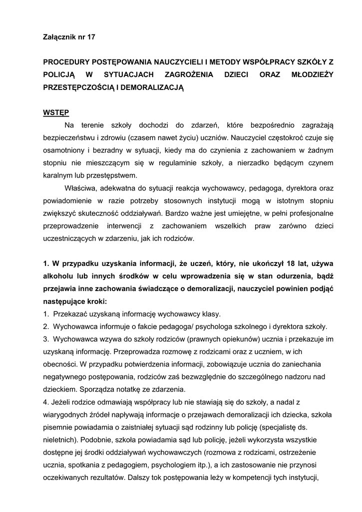 Załącznik nr 17 PROCEDURY POSTĘPOWANIA NAUCZYCIELI I METODY WSPÓŁPRACY SZKÓŁY Z POLICJĄ W SYTUACJACH ZAGROŻENIA DZIECI ORAZ MŁODZIEŻY PRZESTĘPCZOŚCIĄ I DEMORALIZACJĄ WSTĘP Na terenie szkoły dochodzi do zdarzeń, które bezpośrednio zagrażają bezpieczeństwu i zdrowiu (czasem nawet życiu) uczniów. Nauczyciel częstokroć czuje się osamotniony i bezradny w sytuacji, kiedy ma do czynienia z zachowaniem w żadnym stopniu nie mieszczącym się w regulaminie szkoły, a nierzadko będącym czynem karalnym lub przestępstwem. Właściwa, adekwatna do sytuacji reakcja wychowawcy, pedagoga, dyrektora oraz powiadomienie w razie potrzeby stosownych instytucji mogą w istotnym stopniu zwiększyć skuteczność oddziaływań. Bardzo ważne jest umiejętne, w pełni profesjonalne przeprowadzenie interwencji z zachowaniem wszelkich praw zarówno dzieci uczestniczących w zdarzeniu, jak ich rodziców. 1. W przypadku uzyskania informacji, że uczeń, który, nie ukończył 18 lat, używa alkoholu lub innych środków w celu wprowadzenia się w stan odurzenia, bądź przejawia inne zachowania świadczące o demoralizacji, nauczyciel powinien podjąć następujące kroki: 1. Przekazać uzyskaną informację wychowawcy klasy. 2. Wychowawca informuje o fakcie pedagoga/ psychologa szkolnego i dyrektora szkoły. 3. Wychowawca wzywa do szkoły rodziców (prawnych opiekunów) ucznia i przekazuje im uzyskaną informację. Przeprowadza rozmowę z rodzicami oraz z uczniem, w ich obecności. W przypadku potwierdzenia informacji, zobowiązuje ucznia do zaniechania negatywnego postępowania, rodziców zaś bezwzględnie do szczególnego nadzoru nad dzieckiem. Sporządza notatkę ze zdarzenia. 4. Jeżeli rodzice odmawiają współpracy lub nie stawiają się do szkoły, a nadal z wiarygodnych źródeł napływają informacje o przejawach demoralizacji ich dziecka, szkoła pisemnie powiadamia o zaistniałej sytuacji sąd rodzinny lub policję (specjalistę ds. nieletnich). Podobnie, szkoła powiadamia sąd lub policję, jeżeli wykorzysta wszystkie dostępne jej środki oddziaływań wychowawczych (rozmowa z rodzicami, ostrzeżenie ucznia, spotkania z pedagogiem, psychologiem itp.), a ich zastosowanie nie przynosi oczekiwanych rezultatów. Dalszy tok postępowania leży w kompetencji tych instytucji, zgodnie z warunkami określonymi w ustawie z dnia 26 października 1982 r. o postępowaniu w sprawach nieletnich. 2. W przypadku, gdy nauczyciel podejrzewa, że na terenie szkoły znajduje się uczeń będący pod wpływem alkoholu lub narkotyków powinien podjąć następujące kroki: 1. Powiadomić o swoich przypuszczeniach wychowawcę klasy. 2. Odizolować ucznia od reszty klasy, ale ze względów bezpieczeństwa nie pozostawiać go samego; stworzyć warunki, w których nie będzie zagrożone jego życie ani zdrowie. 3. Wezwać lekarza w celu stwierdzenia stanu trzeźwości lub odurzenia, ewentualnie udzielenia pomocy medycznej. 4. Zawiadomić o tym fakcie dyrektora szkoły oraz rodziców/opiekunów, których zobowiązuje się do niezwłocznego odebrania ucznia ze szkoły. Gdy rodzice/opiekunowie odmówią odebrania dziecka, o pozostaniu ucznia w szkole, czy przewiezieniu do placówki służby zdrowia, albo przekazaniu go do dyspozycji funkcjonariuszom policji- decyduje lekarz, po ustaleniu aktualnego stanu zdrowia ucznia i w porozumieniu z dyrektorem szkoły/placówki. 5 .Szkoła zawiadamia najbliższą jednostkę policji, gdy rodzice ucznia będącego pod wpływem alkoholu- odmawiają przyjścia do szkoły, a jest on agresywny wobec kolegów lub nauczycieli, bądź swoim zachowaniem daje powód do zgorszenia albo zagraża życiu lub zdrowiu innych osób. 6. W przypadku stwierdzenia stanu nietrzeźwości ( stężenie we krwi powyżej 0,5 ‰ alkoholu lub w wydychanym powietrzu powyżej 0,25 mg alkoholu w 1 dm 3), policja ma możliwość przewiezienia ucznia do izby wytrzeźwień, albo do policyjnych pomieszczeń dla osób zatrzymanych- na czas niezbędny do wytrzeźwienia (maksymalnie do 24 godzin). O fakcie umieszczenia zawiadamia się rodziców/opiekunów oraz sąd rodzinny jeśli uczeń nie ukończył 18 lat. 7. Jeżeli zdarzenia, w których uczeń (przed ukończeniem 18 lat) znajduje się pod wpływem alkoholu lub narkotyków na terenie szkoły, powtarzają się, świadczy to o jego demoralizacji. Nakłada to na szkołę obowiązek powiadomienia policji (specjalisty ds. nieletnich) lub sądu rodzinnego o tej szczególnej sytuacji. 8. Wychowawca sporządza notatkę ze zdarzenia. 3. W przypadku, gdy nauczyciel znajduje na terenie szkoły substancję przypominającą wyglądem narkotyk powinien podjąć następujące kroki: 1. Zachowując środki ostrożności zabezpieczyć substancję przed dostępem do niej osób niepowołanych oraz ewentualnym jej zniszczeniem do czasu przyjazdu policji, próbuje (o ile to jest możliwe w zakresie działań pedagogicznych) ustalić, do kogo znaleziona substancja należy. 2 .Powiadomić o zaistniałym zdarzeniu dyrektora szkoły i wezwać policję. 3. Po przyjeździe policji niezwłocznie przekazuje zabezpieczoną substancję i przekazuje informacje dotyczące szczegółów zdarzenia. 4. W przypadku, gdy nauczyciel podejrzewa, że uczeń posiada przy sobie substancję przypominającą narkotyk, powinien podjąć następujące kroki: 1. Nauczyciel w obecności innej osoby (wychowawca, pedagog, dyrektor itp.) ma prawo żądać, aby uczeń przekazał mu tę substancję, pokazał zawartość torby szkolnej oraz kieszeni (we własnej odzieży), ewentualnie innych przedmiotów budzących podejrzenie co do ich związku z poszukiwaną substancją. Nauczyciel nie ma prawa samodzielnie wykonać czynności przeszukania odzieży ani teczki ucznia- jest to czynność zastrzeżona wyłącznie dla policji. 2. O swoich spostrzeżeniach powiadamia dyrektora szkoły oraz rodziców/opiekunów ucznia i wzywa ich do natychmiastowego stawiennictwa. 3. W przypadku, gdy uczeń, mimo we