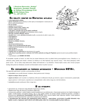 1 Drużyna Harcerska „Knieja” Drużynowy Jarosław Zasacki ul. Stefana Wyszyńskiego 21/61 65-536 Zielona Góra TEL. 607-429-314 CO NALEŻY ZABRAĆ NA HARCERSKI WYJAZD: • ważna legitymacja szkolna, • śpiwór i karimata (jeżeli jedziemy na obóz śpimy na kanadyjkach z materacami, ale śpiwór nadal jest potrzebny), • dres do spania, • mundur (jeśli posiadamy), • menażka, kubek, łyżka, widelec, nóż, • latarka z zapasowymi bateriami, • wodę gdyby zachciało nam się pić między posiłkami, • pieniądze na kartki i pamiątki (jeżeli planujemy takowe kupić), • śpiewnik, notatnik, długopis, ołówek, • ręczniki (duży i mały), przybory do mycia (mydło, szczoteczka do zębów i pasta, itd.), • strój kąpielowy, • strój sportowy, • przybory do szycia, • ubranie na chłodne wieczory, • bieliznę, • okrycie przeciwdeszczowe, • ciemne rzeczy do pobrudzenia lub moro, • środek przeciwko komarom, krem do opalania, • nakrycie głowy, • mały plecak na wycieczki, • wygodne buty na wędrówkę (po sprawdzeniu ich wygody). • co do obozu to prosimy jeszcze o zabranie 16.07.2012r. jedzenia na drogę do Wapienicy (ponieważ pierwszym posiłkiem będzie obiad), • i najważniejsze czyli DOBRY HUMOR. W przypadku wyjazdu na biwak i na obóz lista jest niemal identyczna różni się jednak ilością poszczególnych rzeczy. Menażkę tu i tu zabieramy jedną, jednak jeżeli chodzi o ubrania czy bieliznę to na obóz będziemy tego znacznie więcej. 7 dnia obozu planujemy zrobić pranie ręczne - tak by każdy mógł jednocześnie zdobyć doświadczenie w tej dziedzinie. Ubrania będzie można sobie również przeprać każdego dnia ponieważ zbudujemy suszarnie na której będzie można wszystko wysuszyć. CO ZAPEWNIAMY W RAMACH WPISOWEGO - WAPIENICA 2012R, Tak naprawdę zapewniamy wszystko co jest potrzebne na obozie: • wyżywienie (cztery posiłki dziennie: śniadanie, obiad, podwieczorek i kolację), • dojazd na miejsce obozu i powrót, • zajęcia na obozie (czyli wszystko to co będziemy robić przez te kilkanaście dni jak: gry terenowe, zajęcia z terenoznastwa, pośpiewajki, zajęcia sportowe i wiele innych, a najciekawsze to niespodzianka i tylko rodzice mogę się o nich dowiedzieć), • wycieczki (przejazdy autobusami, bilety wstępu itp.). O CO PROSIMY: • upewnienie się, że harcerze mają aktualne legitymacje szkolne, • dopilnowanie tego aby harcerze się dobrze spakowali, • wyznaczymy godziny w jakich będzie można kontaktować się telefonicznie z harcerzami ponieważ nie będzie dostępu do prądu i trzeba będzie oszczędzać baterie. Ale w razie gdyby telefon się komuś jednak rozładował prosimy o kontakt z drużynowym Jarosławem Zasackim(607-429-314 PLUS), który zawsze będzie miał włączony telefon i jeżeli państwo będziecie chcieli porozmawiać z pociechą to poprosi ją do telefonu, • o niezabieranie lub zabranie jak najmniejszej ilości słodyczy - zapewniamy wyżywienie (4 posiłki dziennie) więc będzie co jeść, a lepiej jest zjeść zdrowo niż oddać pełny talerz bo wcześniej zjadło się dużo słodyczy. JAK SIĘ SPAKOWAĆ 1. Zabieramy tylko to co jest potrzebne. Jeżeli nie przestrzegamy tej zasady to lepiej nawet nie zabierajmy się za pakowanie bo nawet jak zrobimy to dobrze to dalej będziemy nieśli po prostu worek kamieni. Istotne jest to aby na początku zrobić sobie dlatego listę tego co chcemy zabrać. Potem dokładnie przemyśleć czy to co wypisaliśmy naprawdę się nam przyda. Bo mi samemu zdarzało się brać czasem przedmioty, które jak twierdziłem w domu na pewno użyję, a kończyło się tak, że drugi raz oglądałem je jedynie podczas pakowania na koniec wyjazdu i nie byłem w stanie ich zmieścić. 2. Gdy pakujemy się w drogę powrotną rzeczy jakby zwiększyły swoją objętość. Mimo, że mamy mniej do spakowania bo słodycze zjedliśmy, a wodę wypiliśmy - rzeczy, które w domu bez problemu wchodziły na swoje miejsce teraz zalegają nam na kanadyjce, a plecak już jest pełny. Najlepszym lekarstwem na to jest pakowanie się samemu od początku do końca przed wyjazdem wtedy zapamiętacie gdzie co pasowało i w razie czego możecie jeszcze zareagować i zostawić mniej potrzebne rzeczy w domu. Trzecia zasada to: 3. Spakowanie wszystkiego w jeden plecak. Jeżeli oczywiście macie na tyle duży bo nikt nie zrobi tego mając szkolny plecak. Chodzi tutaj głównie o to aby mieć wolne ręce ponieważ gdy będziemy mieli plecak na plecach i po torbie w rękach będzie nam bardzo niewygodnie. A po kilkudziesięciu metrach wszystko będzie nas bolało jakbyśmy przeszli kilka kilometrów i do tego pod górę. Dlatego postarajcie się zmieścić wszystko do jednego plecaka. 4. Najpotrzebniejsze rzeczy spakuj tak by były łatwo i szybko dostępne. Legitymacje szkolne, płaszcz przeciwdeszczowy, środki higieny, napoje. Argument przemawiający za tą zasadą jest bardzo prosty i mam nadzieję, że już wszystkim znany: nie chcesz za każdym razem wyjmując napój wyjmować wszystkiego z plecaka, a potem ponownie wpakowywać do plecaka - szkoda czasu i sił. Ostatnia zasada jest również ważna i zarazem krótka. 5. Nie lekceważ żadnej wędrówki, Plecak mamy na plecach dlatego zawsze powinien być prawidłowo spakowany nie zależenie od tego ile będziemy go mieli na plecach i gdy dobrze go spakujemy będzie wygodniej i bezpieczniej również dla innych osób z którymi wędrujemy. A gdy raz nauczymy się dobrze pakować będziemy to robić zawsze bez zastanowienia. ZOBRAZOWANIE DOBRZE SPAKOWANEGO PLECAKA: 1. Pakowanie - ciężar przedmiotów 1. Pakowanie - rodzaj przedmiotów Pierwszy obrazek jest najważniejszy pokazuje jak należy spakować się biorąc pod uwagę masę przedmiotów jakie zabieramy. Najcięższe rzeczy muszą być blisko pleców w środkowej części plecaka (to będzie jego środek ciężkości), do górnej komory instalujemy przedmioty o 