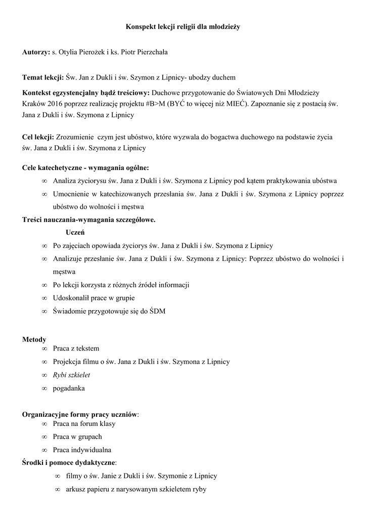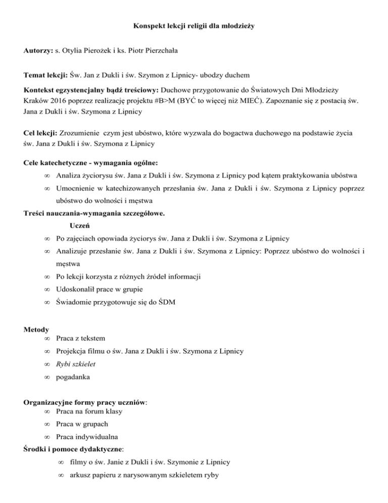Konspekt lekcji religii dla młodzieży Autorzy: s. Otylia Pierożek i ks. Piotr Pierzchała Temat lekcji: Św. Jan z Dukli i św. Szymon z Lipnicy- ubodzy duchem Kontekst egzystencjalny bądź treściowy: Duchowe przygotowanie do Światowych Dni Młodzieży Kraków 2016 poprzez realizację projektu #B>M (BYĆ to więcej niż MIEĆ). Zapoznanie się z postacią św. Jana z Dukli i św. Szymona z Lipnicy Cel lekcji: Zrozumienie czym jest ubóstwo, które wyzwala do bogactwa duchowego na podstawie życia św. Jana z Dukli i św. Szymona z Lipnicy Cele katechetyczne - wymagania ogólne: • Analiza życiorysu św. Jana z Dukli i św. Szymona z Lipnicy pod kątem praktykowania ubóstwa • Umocnienie w katechizowanych przesłania św. Jana z Dukli i św. Szymona z Lipnicy poprzez ubóstwo do wolności i męstwa Treści nauczania-wymagania szczegółowe. Uczeń • Po zajęciach opowiada życiorys św. Jana z Dukli i św. Szymona z Lipnicy • Analizuje przesłanie św. Jana z Dukli i św. Szymona z Lipnicy: Poprzez ubóstwo do wolności i męstwa • Po lekcji korzysta z różnych źródeł informacji • Udoskonalił prace w grupie • Świadomie przygotowuje się do ŚDM Metody • Praca z tekstem • Projekcja filmu o św. Jana z Dukli i św. Szymona z Lipnicy • Rybi szkielet • pogadanka Organizacyjne formy pracy uczniów: • Praca na forum klasy • Praca w grupach • Praca indywidualna Środki i pomoce dydaktyczne: • filmy o św. Janie z Dukli i św. Szymonie z Lipnicy • arkusz papieru z narysowanym szkieletem ryby Literatura • • • • • • Z Chrystusem zwyciężysz szatana, Święty cudotwórca z Dukli, Nr 65, lipiec/sierpień 2012 r., Rok XII http://www.bernardyni.ofm.pl/zakon/sw/jan_duk.htm, Św. Jan z Dukli http://brewiarz.pl/czytelnia/swieci/07-08a.php3, Św. Jan z Dukli http://www.niedziela.pl/artykul/109825/nd/Rok-2014-ogloszony-Rokiem-sw-Jana-z-Dukli, Czesław Gniecki OFM , Św. Szymon z Lipnicy, http://www.opoka.org.pl/biblioteka/T/TS/swieci/s_szymon_zlipnicy.html Św. Szymon - wyprawa do Rzymu i Asyżu, film, http://www.youtube.com/watch?v=8mWkiDz_Y8Y • Ks. Edward Staniek, Kraków Miasto wielu Świętych, Rafael 2014 Zdania do zapisania Św. Jan z Dukli Św. Szymon z Lipnicy Pochodził z starego mieszczańskiego rodu, (ok. 1414 r.) prawdopodobnie studiował w Akademii Krakowskiej. Był zdolny i wykształcony, ale się nie Urodził się w 1438 r. w Lipnicy Murowanej. Ojciec wynosił ponad innych. Wybrał pustelnię w pobliżu rodzinnej Dukli, pokryte lasem wzgórze Zaśpit. Nie miał nic dla siebie. Tu pracował dla innych i modlił się za innych. Gdy uznał, ze to nie jego droga nadzieję, że obejmie po nich piekarnię. Jako chłopiec wymykał się poza mury miasta i bawił się z pasącymi krowy chłopcami a potem wstępował do kościoła. Szkołę miał bardzo blisko i był bardzo wstąpił do franciszkanów w Krośnie. Pokornie przeszedł formacje zakonną i po uzyskaniu święceń kapłańskich został kaznodzieją w języku polskim i niemieckim. Pełnił wiele ważnych funkcji w zdolny. Podczas choroby ojca sprzedawał chleb a biednych obdzielał nim. Rodzice zawieźli syna do Krakowa gdzie najpierw uczył się przy kościele mariackim a potem w założonej Akademii zakonie, ale przyszedł po to, by podnosić poziom duchowy życia zakonnego. Kiedy dowiedział się, że w Krakowie powstał ubogi klasztor, w którym ściśle przestrzegano regułę, a potem w innych miastach następne św. Jan zapragnął do nich dołączyć. Przed śmiercią utracił wzrok. W ostatnich latach życia Krakowskiej. Tu biegał na Rynek, by słuchać słynnego kaznodzieję Jana Kapistrana. W Akademii uczył się bardzo dobrze. W 1457 r. został bakałarzem. Chciano, by został na uczelni, ale on wstąpił do klasztoru na Stradomiu. Nie chciał mieć nic oprócz Biblii i krzyża. Pieszo powędrował do musiał zmierzyć się ze słabością ciała. Doskwierały mu owrzodzone nogi. Był absolutnie wolny i mocny duchem. Nie bał się przeciwności. Potrafił działać na Rzymu i Ziemi Świętej. Szedł z workiem w połatanym habicie. W czasach epidemii w Krakowie pomagał chorym, pocieszał spowiadał. Nie bał się, chwałę Bożą, mimo przeciwności że się zarazi. Tak też się stało. 18 lipca, po 5. Dniach cierpienia znoszonego w cichości umarł. był piekarzem. Matka tez pomagała w pieczeniu chleba. Oboje uczyli syna wypieku chleba i mieli Przebieg zajęć Treści i zadania metodyczno-dydaktyczne Pomoce dydaktyczne Czas Powitanie i czynności organizacyjne Nauczyciel sprawdza liste obecności i wprowadza do modlitwy. Intencja modlitwy: módlmy się, abyśmy potrafili dostrzegać i cenić w naszym życiu tylko prawdziwe wartości. Módlmy się wezwaniem do św. Jana z Dukli i Szymona z Lipnicy Życie świętych Nauczyciel czyta lub opowiada w miarę możliwości dokładnie o życiu św. Jana z Dukli (obchodzimy ROK św. Jana z Dukli, zatwierdzony przez Sejm RP) i św. Szymona z Lipnicy (Patrona młodzieży akademickiej) Ubóstwo św. Jan z Dukli i św. Szymona z Lipnicy. Teraz nauczyciel rozdaje teksty z wcześniej przeczytanymi Zał. 1, zał. 2 lub opowiedzianymi życiorysami św. Jana z Dukli i św. Szymona z Lipnicy. Jeśli uczniowie obejrzeli filmy w domu, to teraz wczytują się w teksty o omawianych świętych. Szukają świadectw ubóstwa, które praktykowałi św. Jan z Dukli i św. Szymon z Lipnicy. 10 minut Życie świętych - utrwalenie Uczniowie porządkują wydarzenia z życia św. Szymona z Zał. 3 Lipnicy i św. Jana z Dukli. 2 minuty Wolność – odwaga – męstwo Uczniowie wpisują jakie były przyczyny postaw wolności i odwagi-męstwa w przeciwnościach omawianych świętych. (Metoda Rybi szkielet zwana jest również „Schematem przyczyn i skutków”. Jej nazwa pochodzi od formy graficznej przypominającej szkielet ryby. Jest to metoda rozwiązywania problemów w twórczy sposób, poszukiwania, porządkowania i wykorzystywania informacji z r