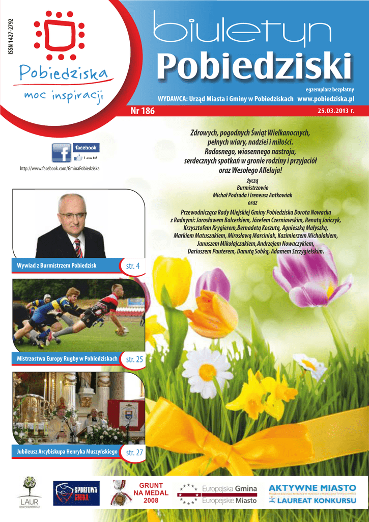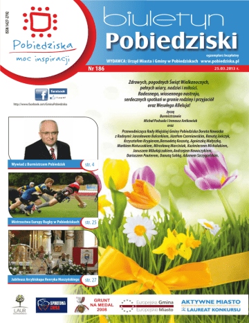 ISSN 1427-2792 L IULETYN Pobiedziski egzemplarz bezpłatny WYDAWCA: Urząd Miasta i Gminy w Pobiedziskach www.pobiedziska.pl Nr 186 25.03.2013 r. Zdrowych, pogodnych Świąt Wielkanocnych, pełnych wiary, nadziei i miłości. Radosnego, wiosennego nastroju, serdecznych spotkań w gronie rodziny i przyjaciół oraz Wesołego Alleluja! http://www.facebook.com/GminaPobiedziska życzą Burmistrzowie Michał Podsada i Ireneusz Antkowiak oraz Przewodnicząca Rady Miejskiej Gminy Pobiedziska Dorota Nowacka z Radnymi: Jarosławem Balcerkiem, Józefem Czerniawskim, Renatą Jończyk, Krzysztofem Krygierem,Bernadetą Koszutą, Agnieszką Małyszką, Markiem Matuszakiem, Mirosławą Marciniak, Kazimierzem Michalakiem, Januszem Mikołajczakiem,Andrzejem Nowaczykiem, Dariuszem Pauterem, Danutą Sobką, Adamem Szczygielskim. Wywiad z Burmistrzem Pobiedzisk str. 4 Mistrzostwa Europy Rugby w Pobiedziskach str. 25 Jubileusz Arcybiskupa Henryka Muszyńskiego str. 27 GRUNT NA MEDAL 2008 INFORMACJE UMiG www.pobiedziska.pl Sprawozdanie Burmistrza Miasta i Gminy Pobiedziska w okresie od 28.02.2013 r. do 21.03.2013 r. Trwają prace budowlane przy: . . budowie sieci kanalizacji sanitarnej w ramach projektu "Kanalizacja obszaru Parku Krajobrazowego Puszcza Zielonka i okolic", przebudowie ul. Poznańskiej od ul. Kaczyńskiej do ul. Wodnej w Pobiedziskach oraz budowie ul. Poznańskiej od ul. Wodnej do ul. Gajowej w Pobiedziskach wraz z wykonaniem kanalizacji deszczowej: Zadanie I - wykonawca POL-DRÓG Sp. z o.o. z Piły, wartość wykonywanych prac 3 648 870,07 zł brutto Zadanie II i III - wykonawca Zakład Wielobranżowy TRANS-BRUK M. Begier z Nekli, war tość wykonywanych prac 1 589 732,44 zł brutto, ze względów bezpieczeństwa przyspieszono prace związane z rozbiórką budynku mieszkalnego i dwóch budynków gospodarczych zlokalizowanych w Pobiedziskach przy ul. Jeziornej 4, wykonawca ZHiU Bogdan Chlebowicz z Gorzowa, wartość prac 26 600,00 zł brutto, rozbiórce budynku mieszkalnego w m. Jankowo Młyn 2, wykonawca ZHiU Bogdan Chlebowicz z Gorzowa, wartość prac 11. 070,00 zł brutto. . . . . . . . . budowa sieci kanalizacji sanitarnej przebudowa ul.Poznańskiej Zakończono prace związane z: rozbiórką budynku mieszkalnego wielorodzinnego zlokalizowanego w Pobiedziskach - Rynek 11, Kostrzyńska 2, wartość: 91.020,00 zł, wykonawca ZHiU Bogdan Chlebowicz. Przygotowywane są przetargi na: termomodernizację i remont świetlicy w Latalicach, remont i adaptacje budynku harcówki w Stęszewku - Wrota Puszczy Zielonki, dostawę i montaż 10 lamp hybrydowych na terenie gminy. rozbiórka budynków - Pobiedziska, ul.Jeziorna 4 Zakończono postępowania przetargowe na: równanie i profilowanie dróg i ulic o nawierzchni gruntowej w Gminie Pobiedziska w roku 2013. Ponadto: . . 2 odbyło się spotkanie z sołtysami, podczas którego przekazano informacje o: naborze wniosków o przyznanie pomocy na "Modernizację gospodarstw rolnych", zakazie wypalania traw, szczegółowych warunkach przyznawania pomocy finansowej w ramach działania "Przywracanie potencjału produkcji rolnej zniszczonego w wyniku wystąpienia klęsk żywiołowych", odpowiedzi Ministra Rolnictwa na pismo Burmistrza w sprawie wyznaczania kryteriów kwalifikujących tereny do dopłat z tytułu ONW na lata 2014-2020, przeprowadzono liczne szkolenia dla rolników na temat: "Ochrona środowiska na poziomie gospodarstwa rolnego", z nr 186 * marzec 2013 rozbiórka budynku - Pobiedziska, Rynek 11, Kostrzyńska 2 szkolenia dla pracowników samorządowych INFORMACJE UMiG www.pobiedziska.pl . zakresu wymagań wzajemnej zgodności - cross-compliance , . . Pobiedziskie Spotkania Akademickie . . . posiedzenie sejmowe Komisji Infrastruktury . . . . spotkanie z przedsiębiorcami . . Gala Przyjaciół Kultury . . . . . "Program rolnośrodowiskowy szansą dla rolnika i środowiska", "Gospodarstwo ekologiczne źródłem dochodu dla małych i średnich gospodarstw" oraz "BHP w rolnictwie, uczestniczono w spotkaniach z seniorami Sołectwa Biskupice, Góra i Jerzykowo, problem drogi krajowej nr 5 trafił do Sejmu, uczestniczyłem w posiedzeniu sejmowych Komisji Infrastruktury oraz Komisji Samorządu Terytorialnego i Polityki Regionalnej. Pierwszym z poruszonych tematów była zmiana ustawy o drogach publicznych. Dzięki działaniom samorządowców oraz licznym rozmowom z posłami z naszego regionu, udało się doprowadzić do powołania podkomisji, która ma zająć się tym tematem, uczestniczono w spotkaniu ZMPZ w sprawie zmian i przyjęcia statutu związku, zorganizowano kolejny wykład z cyklu Pobiedziskich Spotkań Akademickich, prelekcję ,,Czy inteligencja jako warstwa społeczna jest jeszcze potrzebna?" wygłosiła prof. Renata Suchocka, odbyło się spotkanie robocze członków Związku Międzygminnego "Gospodarka Odpadami Aglomeracji Poznańskiej". Podczas spotkania omówiono propozycje uchwał dotyczących nowego systemu gospodarki odpadami (m.in. w sprawie podziału obszaru Związku Międzygminnego na sektory odbierania odpadów oraz w sprawie metody naliczania opłaty za gospodarowanie odpadami komunalnymi i ustalenia stawki tej opłaty), w ZS w Pobiedziskach dla uczniów gimnazjum przeprowadzono wykłady przybliżające pracę samorządu terytorialnego, uczestniczono w konferencji prasowej zorganizowanej w GDDKiA dotyczącej przejęcia przez w/w instytucję utrzymanie drogi krajowej nr 5, trwają szkolenia dla pracowników samorządowych w ramach projektu "Wdrożenie usprawnień zarządczych w Urzędzie Miasta i Gminy Pobiedziska", wniosek na realizację filmu promocyjnego Turystyczna Gmina Pobiedziska, którego celem jest wypromowanie walorów turystyczno-rekreacyjnych naszej gminy, złożony do Światowida zajął 10 miejsce na liście rankingowej, natomiast wniosek o dofinansowanie "Wyposażenia domu sołeckiego w Węglewie" został odrzucony, uczestniczono w konferencji dotyczącej organów odpowiedzialnych za bezpieczeństwo i porządek publiczny p