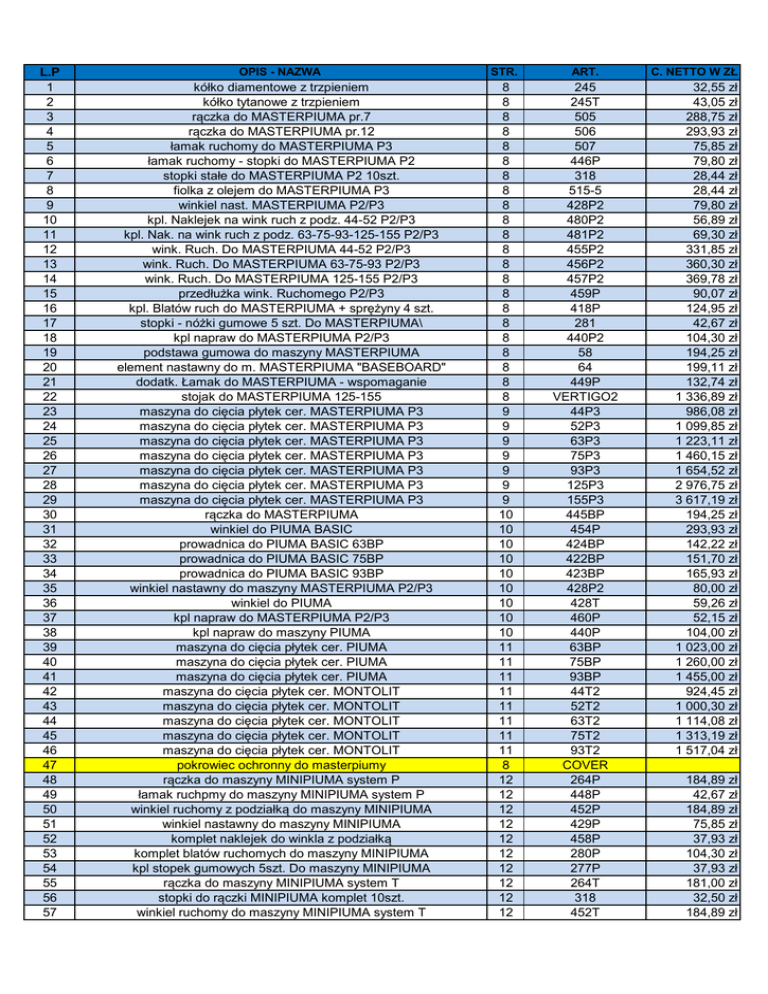 L.P 1 2 3 4 5 6 7 8 9 10 11 12 13 14 15 16 17 18 19 20 21 22 23 24 25 26 27 28 29 30 31 32 33 34 35 36 37 38 39 40 41 42 43 44 45 46 47 48 49 50 51 52 53 54 55 56 57 OPIS - NAZWA STR. ART. kółko diamentowe z trzpieniem kółko tytanowe z trzpieniem rączka do MASTERPIUMA pr.7 rączka do MASTERPIUMA pr.12 łamak ruchomy do MASTERPIUMA P3 łamak ruchomy - stopki do MASTERPIUMA P2 stopki stałe do MASTERPIUMA P2 10szt. fiolka z olejem do MASTERPIUMA P3 winkiel nast. MASTERPIUMA P2/P3 kpl. Naklejek na wink ruch z podz. 44-52 P2/P3 kpl. Nak. na wink ruch z podz. 63-75-93-125-155 P2/P3 wink. Ruch. Do MASTERPIUMA 44-52 P2/P3 wink. Ruch. Do MASTERPIUMA 63-75-93 P2/P3 wink. Ruch. Do MASTERPIUMA 125-155 P2/P3 przedłużka wink. Ruchomego P2/P3 kpl. Blatów ruch do MASTERPIUMA + sprężyny 4 szt. stopki - nóżki gumowe 5 szt. Do MASTERPIUMA\ kpl napraw do MASTERPIUMA P2/P3 podstawa gumowa do maszyny MASTERPIUMA element nastawny do m. MASTERPIUMA "BASEBOARD" dodatk. Łamak do MASTERPIUMA - wspomaganie stojak do MASTERPIUMA 125-155 maszyna do cięcia płytek cer. MASTERPIUMA P3 maszyna do cięcia płytek cer. MASTERPIUMA P3 maszyna do cięcia płytek cer. MASTERPIUMA P3 maszyna do cięcia płytek cer. MASTERPIUMA P3 maszyna do cięcia płytek cer. MASTERPIUMA P3 maszyna do cięcia płytek cer. MASTERPIUMA P3 maszyna do cięcia płytek cer. MASTERPIUMA P3 rączka do MASTERPIUMA winkiel do PIUMA BASIC prowadnica do PIUMA BASIC 63BP prowadnica do PIUMA BASIC 75BP prowadnica do PIUMA BASIC 93BP winkiel nastawny do maszyny MASTERPIUMA P2/P3 winkiel do PIUMA kpl napraw do MASTERPIUMA P2/P3 kpl napraw do maszyny PIUMA maszyna do cięcia płytek cer. PIUMA maszyna do cięcia płytek cer. PIUMA maszyna do cięcia płytek cer. PIUMA maszyna do cięcia płytek cer. MONTOLIT maszyna do cięcia płytek cer. MONTOLIT maszyna do cięcia płytek cer. MONTOLIT maszyna do cięcia płytek cer. MONTOLIT maszyna do cięcia płytek cer. MONTOLIT pokrowiec ochronny do masterpiumy rączka do maszyny MINIPIUMA system P łamak ruchpmy do maszyny MINIPIUMA system P winkiel ruchomy z podziałką do maszyny MINIPIUMA winkiel nastawny do maszyny MINIPIUMA komplet naklejek do winkla z podziałką komplet blatów ruchomych do maszyny MINIPIUMA kpl stopek gumowych 5szt. Do maszyny MINIPIUMA rączka do maszyny MINIPIUMA system T stopki do rączki MINIPIUMA komplet 10szt. winkiel ruchomy do maszyny MINIPIUMA system T 8 8 8 8 8 8 8 8 8 8 8 8 8 8 8 8 8 8 8 8 8 8 9 9 9 9 9 9 9 10 10 10 10 10 10 10 10 10 11 11 11 11 11 11 11 11 8 12 12 12 12 12 12 12 12 12 12 245 245T 505 506 507 446P 318 515-5 428P2 480P2 481P2 455P2 456P2 457P2 459P 418P 281 440P2 58 64 449P VERTIGO2 44P3 52P3 63P3 75P3 93P3 125P3 155P3 445BP 454P 424BP 422BP 423BP 428P2 428T 460P 440P 63BP 75BP 93BP 44T2 52T2 63T2 75T2 93T2 COVER 264P 448P 452P 429P 458P 280P 277P 264T 318 452T C. NETTO W ZŁ 32,55 zł 43,05 zł 288,75 zł 293,93 zł 75,85 zł 79,80 zł 28,44 zł 28,44 zł 79,80 zł 56,89 zł 69,30 zł 331,85 zł 360,30 zł 369,78 zł 90,07 zł 124,95 zł 42,67 zł 104,30 zł 194,25 zł 199,11 zł 132,74 zł 1 336,89 zł 986,08 zł 1 099,85 zł 1 223,11 zł 1 460,15 zł 1 654,52 zł 2 976,75 zł 3 617,19 zł 194,25 zł 293,93 zł 142,22 zł 151,70 zł 165,93 zł 80,00 zł 59,26 zł 52,15 zł 104,00 zł 1 023,00 zł 1 260,00 zł 1 455,00 zł 924,45 zł 1 000,30 zł 1 114,08 zł 1 313,19 zł 1 517,04 zł 184,89 zł 42,67 zł 184,89 zł 75,85 zł 37,93 zł 104,30 zł 37,93 zł 181,00 zł 32,50 zł 184,89 zł 58 59 60 61 62 63 64 65 66 67 68 69 70 71 72 73 74 75 76 77 78 79 80 81 82 83 84 85 86 87 88 89 90 91 92 93 94 95 96 97 98 99 100 101 102 103 104 105 106 107 108 109 110 111 112 113 114 115 kpl naklejek do winkla do maszyny MINIPIUMA sys. T maszyna do cięcia płytek MINIPIUMA maszyna do cięcia płytek MINIPIUMA + pudełko maszyna do cięcia płytek MINIPIUMA maszyna do cięcia płytek MINIPIUMA + pudełko maszyna do cięcia płytek MINIPIUMA maszyna do cięcia płytek MINIPIUMA + pudełko maszyna do cięcia płytek MINIPIUMA maszyna do cięcia płytek MINIPIUMA + pudełko rączka do maszyny MONTOLIT 24 rączka do maszyny MONTOLIT 26-26A-43-43A rączka do maszyny MONTOLIT 26A2-43A2 kpl blatów ruch. do m. MONTOLIT 26A-26A2-43A-43A2 stopki gumowe do maszyny MINIMONTOLIT 5szt. kółko do maszyny SL rączka do maszyny SL łamak ruchomy do masz. SL amak ruchomy do maszyny SL kpl blatów do maszyny SL przedłużka winkla do maszyny SL przedłużka winkla do maszyny SL53 - SL63 winkiel nastawny do maszyny SL maszyna do cięcia płytek cer maszyna do cięcia płytek cer maszyna do cięcia płytek cer maszyna do cięcia płytek ceramicznych SMART maszyna do cięcia płytek ceramicznych SMART maszyna do cięcia płytek ceramicznych SMART maszyna do cięcia płytek ceramicznych SMART kółko diamentowe do maszyny 21-22-25-27-28-29 kółko diamentowe do maszyny MASTERMONTOLIT kółko tytanowe do maszyny MASTERMONTOLIT winkiel nastawny do maszyny 46 winkiel nastawny do maszyny art. 31 winkiel nastawny do maszyny art. 34 winkiel nastawny do maszyny art. 47-49-92 wink.nast.do maszyny MASTERMONTOLIT art.47M i 92 rączka - pochwyt stalowy do maszyny 31 rączka - pochwyt stalowy do maszyny 34 rączka - pochwyt stalowy do maszyny 27-29 rączka z rolkami do maszyny art. 28 rączka z rolkami do maszyny art. 34, 46, 47, 92, 121 przedłużka do art. 392 przedłużka do art. 392 komplet łamaków do maszyny art. 31 kopia łamaków do maszyny art. 34 kopia łamaków do maszyny 47M-92-121 komplet łamaków do maszyny 46 winkiel nastawny do maszyny art. 31, 34, 46 winkiel nastawny do maszyny 47, 47M, 49, 92, 121 komplet naprawczy do maszyny MASTERMONTOLIT stopki - nóżki do maszyny MASTERMONTOLIT 5szt blat stalowy do maszyny art. 29-31 blat stalowy do maszyny art. 34 blat stalowy do maszyny 47M-92-121 blat stalowy do maszyny art. 46 blat roboczy do art. 92V kólko diamentowe z trzpieniem kółko tytanowe z trzpieniem 12 13 13 13 13 13 13 13 13 14 14 14 14 14 14 14 14 14 14 14 14 15 15 15 
