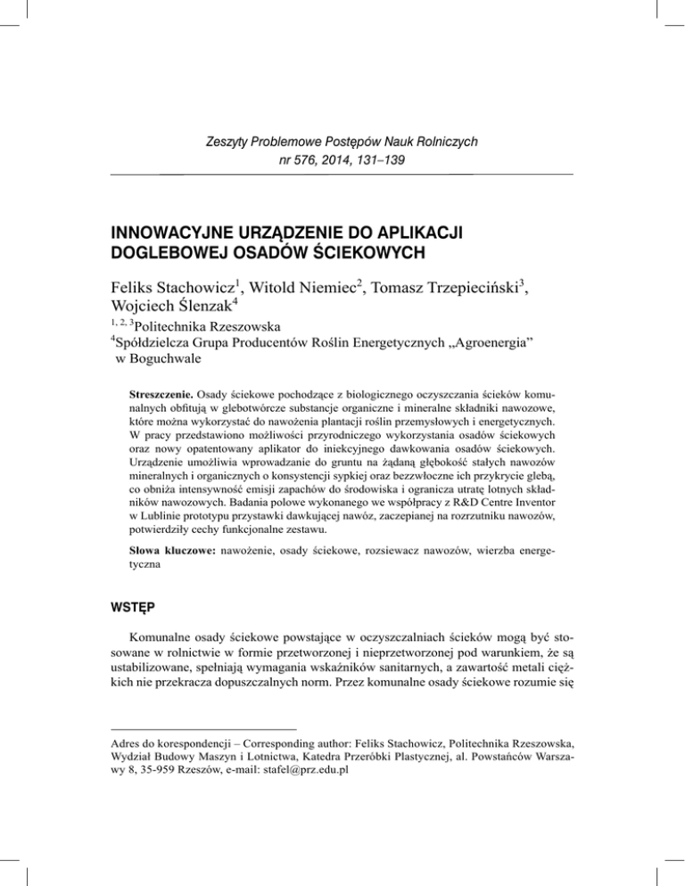 Zeszyty Problemowe Postępów Nauk Rolniczych nr 576, 2014, 131–139 INNOWACYJNE URZĄDZENIE DO APLIKACJI DOGLEBOWEJ OSADÓW ŚCIEKOWYCH Feliks Stachowicz1, Witold Niemiec2, Tomasz Trzepieciński3, Wojciech Ślenzak4 1, 2, 3 Politechnika Rzeszowska Spółdzielcza Grupa Producentów Roślin Energetycznych „Agroenergia” w Boguchwale 4 Streszczenie. Osady ściekowe pochodzące z biologicznego oczyszczania ścieków komunalnych obfitują w glebotwórcze substancje organiczne i mineralne składniki nawozowe, które można wykorzystać do nawożenia plantacji roślin przemysłowych i energetycznych. W pracy przedstawiono możliwości przyrodniczego wykorzystania osadów ściekowych oraz nowy opatentowany aplikator do iniekcyjnego dawkowania osadów ściekowych. Urządzenie umożliwia wprowadzanie do gruntu na żądaną głębokość stałych nawozów mineralnych i organicznych o konsystencji sypkiej oraz bezzwłoczne ich przykrycie glebą, co obniża intensywność emisji zapachów do środowiska i ogranicza utratę lotnych składników nawozowych. Badania polowe wykonanego we współpracy z R&D Centre Inventor w Lublinie prototypu przystawki dawkującej nawóz, zaczepianej na rozrzutniku nawozów, potwierdziły cechy funkcjonalne zestawu. Słowa kluczowe: nawożenie, osady ściekowe, rozsiewacz nawozów, wierzba energetyczna WSTĘP Komunalne osady ściekowe powstające w oczyszczalniach ścieków mogą być stosowane w rolnictwie w formie przetworzonej i nieprzetworzonej pod warunkiem, że są ustabilizowane, spełniają wymagania wskaźników sanitarnych, a zawartość metali ciężkich nie przekracza dopuszczalnych norm. Przez komunalne osady ściekowe rozumie się Adres do korespondencji – Corresponding author: Feliks Stachowicz, Politechnika Rzeszowska, Wydział Budowy Maszyn i Lotnictwa, Katedra Przeróbki Plastycznej, al. Powstańców Warszawy 8, 35-959 Rzeszów, e-mail: [email protected] F. Stachowicz, W. Niemiec, T. Trzepieciński, W. Ślenzak 132 Udział – Participation [%] pochodzący z oczyszczalni ścieków osad powstały w komorach fermentacyjnych oraz innych instalacjach do oczyszczania ścieków komunalnych oraz ścieków o składzie zbliżonym do składu ścieków komunalnych [Ustawa 2012]. Powstawanie dużej ilości osadów ściekowych związane jest nieodłącznie z procesem oczyszczania ścieków. Według danych GUS [Ochrona Środowiska 2010], szacuje się, że w Polsce corocznie powstaje około 1 mln ton osadów ściekowych, które stanowią 1÷2% objętości oczyszczanych ścieków i zawierają ponad połowę całego ładunku zanieczyszczeń docierających do oczyszczalni w ściekach surowych. Komunalne osady ściekowe mogą być stosowane na gruntach, których odczyn jest wyższy niż pH 5÷6, a zawartość w osadzie metali ciężkich nie przekracza ilości określonych w Rozporządzeniu Ministra Środowiska [2010]. W ostatnich latach maleje zawartość metali ciężkich w osadach, które są usuwane ze ścieków przemysłowych przed ich wprowadzeniem do kanalizacji. Gospodarcze wykorzystanie osadów ściekowych pochodzących z komunalnych oczyszczalni ścieków i z przemysłu spożywczego do nawożenia gleb jest uważane za najbardziej ekonomiczny sposób ich utylizacji. Proces nawożenia gleby osadami ściekowymi o konsystencji sypkiego wilgotnego ciała stałego może być realizowany powierzchniowo za pomocą uniwersalnych rozrzutników przeznaczonych do rozsiewu nawozów granulowanych lub rozrzutników obornika. Niedogodnością takiej metody nawożenia (szczególnie w przypadku osadów ściekowych) są uciążliwe efekty zapachowe i utrata lotnych składników nawozowych. Osady ściekowe są poddawane odpowiednim zabiegom technologicznym takim jak wapnowanie, kompostowanie, hydrofitowe odwadnianie, mineralizacja i suszenie po to, aby spełniały określone normy związane z ich wykorzystaniem lub składowaniem [Szwedziak 2006, Ślizowski 2002]. Spośród wszystkich sposobów sanitacji i stabilizacji biologicznej kompostowanie masy organicznej jest najprostsze i najtańsze. Przewidywany udział procentowy metod unieszkodliwiania osadów ściekowych w Polsce w stosunku do 2010 roku przedstawiono na rysunku 1. Z publikowanych prognoz wynika, że w Polsce Rys. 1. Fig. 1. unieszkodliwianie termiczne/thermal disposal kompostowanie/ /composting wykorzystanie rolnicze/ /agricultural utilization stosowane do rekultywacji/ /used for reclamation Lata – Years Przewidywana struktura zagospodarowania osadów ściekowych w Polsce [Krajowy Plan Gospodarki Odpadami 2010] Forecast structure of sewage sludge management in Poland [Krajowy Plan Gospodarki Odpadami 2010] Zeszyty Problemowe Postępów Nauk Rolniczych Innowacyjne urządzenie do aplikacji doglebowej osadów ściekowych 133 istnieje tendencja wzrostowa w zakresie masy osadów ściekowych wytwarzanych w komunalnych oczyszczalniach ścieków. Na terenach oczyszczalni w 2007 roku składowano blisko 800 tysięcy ton suchej masy starych osadów, a dodatkowo każdego roku średnio około 30% osadów nadal składuje się poza terenem oczyszczalni [Krajowy Plan Gospodarki Odpadami 2014]. Wykorzystanie przedstawionego urządzenia umożliwia zwiększenie udziału rolniczego wykorzystania osadów ściekowych poprzez iniekcyjne nawożenie plantacji roślin energetycznych oraz roślin przeznaczonych do celów przemysłowych. Opatentowane urządzenie umożliwia wprowadzanie do gruntu na głębokość 0,05÷0,25 m stałych nawozów mineralnych i organicznych o konsystencji sypkiej. Ponadto osady ze ścieków komunalnych, z oczyszczalni wiejskich, ze ścieków przemysłu rolno-spożywczego są bogatym źródłem składników pokarmowych dla roślin oraz wykazują bardzo skuteczne oddziaływanie glebotwórcze, a wprowadzone do wierzchnich warstw gruntu nadają tej warstwie biologiczną aktywność, właściwą dla gleb urodzajnych [Szwedziak i Woźniak 2005]. Istniejące na rynku rozrzutniki nawozów nie zapewniają bezzwłoczneg