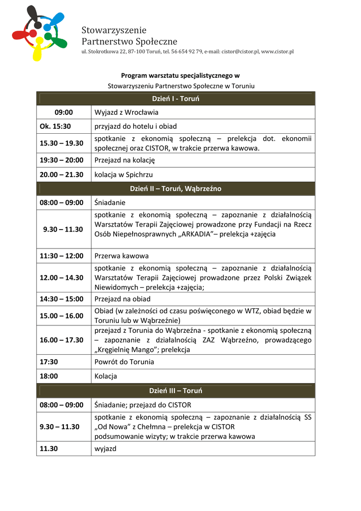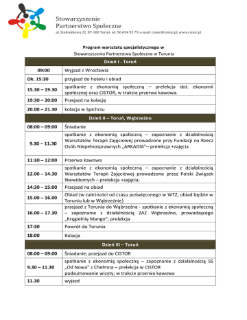 Stowarzyszenie Partnerstwo Społeczne ul. Stokrotkowa 22, 87-100 Toruń, tel. 56 654 92 79, e-mail: [email protected], www.cistor.pl Program warsztatu specjalistycznego w Stowarzyszeniu Partnerstwo Społeczne w Toruniu Dzień I - Toruń 09:00 Wyjazd z Wrocławia Ok. 15:30 przyjazd do hotelu i obiad 15.30 – 19.30 spotkanie z ekonomią społeczną – prelekcja dot. ekonomii społecznej oraz CISTOR, w trakcie przerwa kawowa. 19:30 – 20:00 Przejazd na kolację 20.00 – 21.30 kolacja w Spichrzu Dzień II – Toruń, Wąbrzeźno 08:00 – 09:00 9.30 – 11.30 11:30 – 12:00 12.00 – 14.30 14:30 – 15:00 15.00 – 16.00 16.00 – 17.30 Śniadanie spotkanie z ekonomią społeczną – zapoznanie z działalnością Warsztatów Terapii Zajęciowej prowadzone przy Fundacji na Rzecz Osób Niepełnosprawnych „ARKADIA”– prelekcja +zajęcia Przerwa kawowa spotkanie z ekonomią społeczną – zapoznanie z działalnością Warsztatów Terapii Zajęciowej prowadzone przez Polski Związek Niewidomych – prelekcja +zajęcia; Przejazd na obiad Obiad (w zależności od czasu poświęconego w WTZ, obiad będzie w Toruniu lub w Wąbrzeźnie) przejazd z Torunia do Wąbrzeźna - spotkanie z ekonomią społeczną – zapoznanie z działalnością ZAZ Wąbrzeźno, prowadzącego „Kręgielnię Mango”; prelekcja 17:30 Powrót do Torunia 18:00 Kolacja Dzień III – Toruń 08:00 – 09:00 Śniadanie; przejazd do CISTOR 9.30 – 11.30 spotkanie z ekonomią społeczną – zapoznanie z działalnością SS „Od Nowa” z Chełmna – prelekcja w CISTOR podsumowanie wizyty; w trakcie przerwa kawowa 11.30 wyjazd