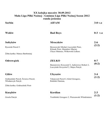XX kolejka meczów 30.09.2012 Mała Liga Piłki Nożnej - Gminna Liga Piłki Nożnej Sezon 2012 runda jesienna Sorbin AIFAM 3:0 v.o Wołów Bad Boys 0:3 v.o Sołtyków Mroczków Rycerski Paweł 2 Brzozowski Michał, Łuczyński Piotr, Klimek Piotr, Mastalerz Maciej, Ubysz Mateusz, Witkowski Łukasz 2:6 (2:2) Żółta kartka: Martys Bartłomiej Odrowążek ZELKO Burasiewicz Krzysztof 2, Jurkiewicz Robert 2, Łuczyński Krzysztof 2, Majos Patryk Gilów Ubyszów Grabusiński Paweł, Świercz Paweł, Włodarczyk Patryk Tokarczyk Paweł 2, Kitel Grzegorz, Rafalski Damian, 0:7 (0:2) 3:4 (1:2) Żółta kartka: Grabusiński Piotr Kucębów Kordian Grzela Patryk Trzebiński Grzegorz 2, Warszawski Włodzimierz 2:3 (1:2)
