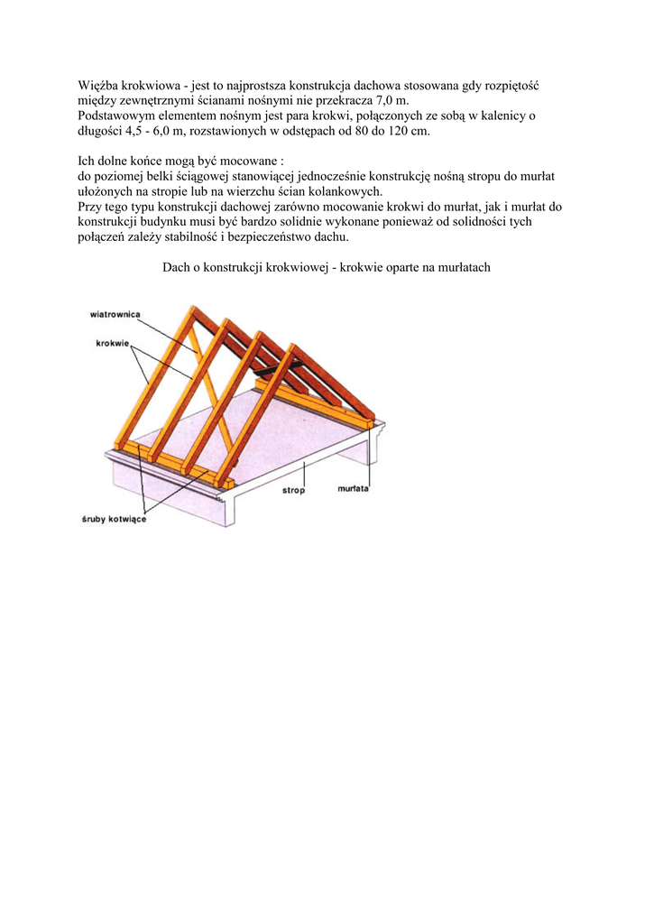 Więźba krokwiowa - jest to najprostsza konstrukcja dachowa stosowana gdy rozpiętość między zewnętrznymi ścianami nośnymi nie przekracza 7,0 m. Podstawowym elementem nośnym jest para krokwi, połączonych ze sobą w kalenicy o długości 4,5 - 6,0 m, rozstawionych w odstępach od 80 do 120 cm. Ich dolne końce mogą być mocowane : do poziomej belki ściągowej stanowiącej jednocześnie konstrukcję nośną stropu do murłat ułożonych na stropie lub na wierzchu ścian kolankowych. Przy tego typu konstrukcji dachowej zarówno mocowanie krokwi do murłat, jak i murłat do konstrukcji budynku musi być bardzo solidnie wykonane ponieważ od solidności tych połączeń zależy stabilność i bezpieczeństwo dachu. Dach o konstrukcji krokwiowej - krokwie oparte na murłatach Więźba krokwiowo-jętkowa stosowana jest tam gdzie rozpiętość między ścianami zewnętrznymi jest większa niż 7,0 m, stosowanie więźb krokwiowych przestaje być ekonomiczne dlatego że dla zapewnienia odpowiedniej sztywności konstrukcji więźby należałoby stosować krokwie o bardzo dużych przekrojach. Zamiast tego projektuje się więźby, w których każda para krokwi rozparta jest mniej więcej w połowie ich długości poziomym elementem zwanym jętką. Dzięki takiemu rozwiązaniu można wykonywać dachy o rozpiętości nawet 11,0 m o prze-kroju krokwi podobnym do dachów o konstrukcji krokwiowej. W więźbach krokwiowo-jętkowych podobnie jak w krokwiowych wszystkie obciążenia przekazywane są na ściany zewnętrzne budynku. Dach o konstrukcji jętkowej Więźba płatwiowo-kleszczowa Taką konstrukcję stosuje się wtedy, gdy rozpiętość dachu przekracza 11,0 m. Konstrukcja tego typu różni się bardzo zarówno od krokwiowej jak i krokwiowo-jetkowej: - podpory dla krokwi nie tworzą tylko murłaty ale dodatkowokrokwie podparte są mniej więcej w połowie rozpiętości na płatwiach górnych płatwie podparte są słupkami stojącymi na płatwiach stopowych lub bezpośrednio na stropie. Taka cała konstrukcja podpierająca krokwie, składająca się z płatwi i słupów nosi nazwę ściany stolcowej całość konstrukcji więźby dachowej usztywniają poziomo kleszcze - podwójne belki wiążące końce słupów z opartymi na nich krokwiami. Kleszcze montuje się co trzecią lub czwartą parę krokwi i takie wiązary noszą nazwę wiązarów głównych, w odróżnieniu od pośrednich, w których krokwie jedynie opierają się na płatwiach. W dachach o konstrukcji płatwiowo-jętkowej większe obciążenia przekazywane są na strop ostatniej kondygnacji niż na ściany zewnętrzne. Takie rozwiązanie konstrukcji więźby dachowej wpływa korzystnie na stabilność i wytrzymałość dachu, ale wymaga zaprojektowania odpowiednio wytrzymałego stropu. Dach o konstrukcji płatwiowo-kleszczowej Jakie drewno na konstrukcję więźby dachowej? Drewno stosowane obecnie do budowy konstrukcji więźby dachowej powinno być nie tylko odpowiednio wysuszone, ale także zabezpieczone przed działaniem czyn-ników biologicznych, ognia oraz wilgoci. Najbardziej skuteczną metodą zabezpieczenia drewna jest tylko przemysłowa impregnacja próżniowo-ciśnieniowa zapewniająca jego trwałe zabezpieczenie. Impregnaty do drewna mogą być rozpuszczalnikowe, olejowe, solne, lub żywiczne. Do zabezpieczenia konstrukcji więźby dachowej przed wilgocią, owadami, grzybami oraz ogniem używa się przede wszystkim impregnatów solnych, które zmniejszają palność drewna. Nie powodują powstawania toksycznych oparów. Sprzedawane są w postaci koncentratów lub w proszku które należy rozcieńczać wodą. Ponieważ są bezbarwne dodaje się do nich barwnik umożliwiający sprawdzenie które elementy zostały zabezpieczone i jak głęboko impregnat wnikną w zabezpieczane drewno. Drewno przeznaczone do impregnacji powinno być odpowiednio wysuszone - o wil-gotności poniżej 20%, oraz oczyszczone z kory i zabrudzeń, które unie-możliwiałyby wnikanie impregnatu. Na elementy konstrukcyjne więźb dachowych powinno stosować się drewno suszone przemysłowo w specjalnych suszarniach. Ponieważ tylko w ten sposób możemy uzyskać wymaganą wilgotność, oraz doprowadzić do wyginięcia obecnych w nim zarodników grzybów oraz larw owadów. Usługi Ciesielskie - domy drewniane - domy szkieletowe - konstrukcje dachowe więźby - www.lechbud.org